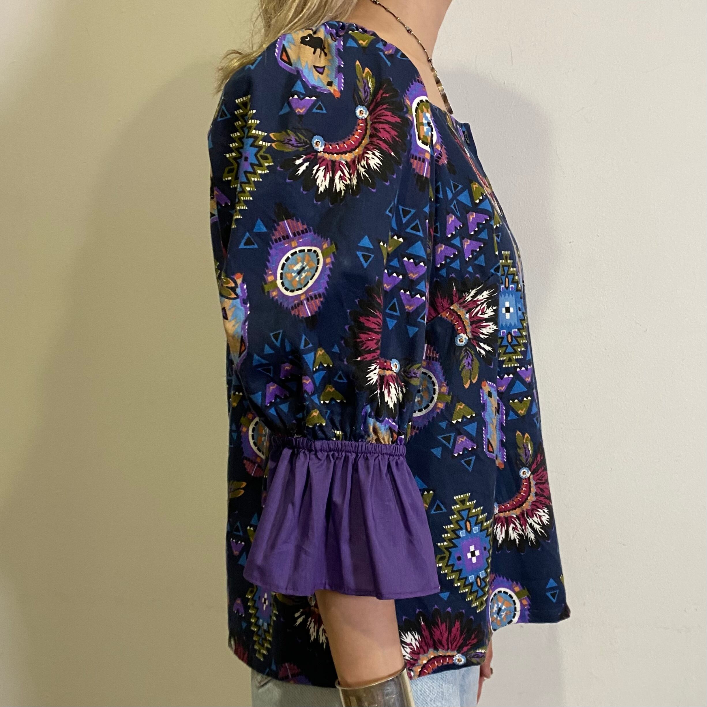 ネイティブアメリカンモチーフのテキスタイルが可愛いブラウスです。