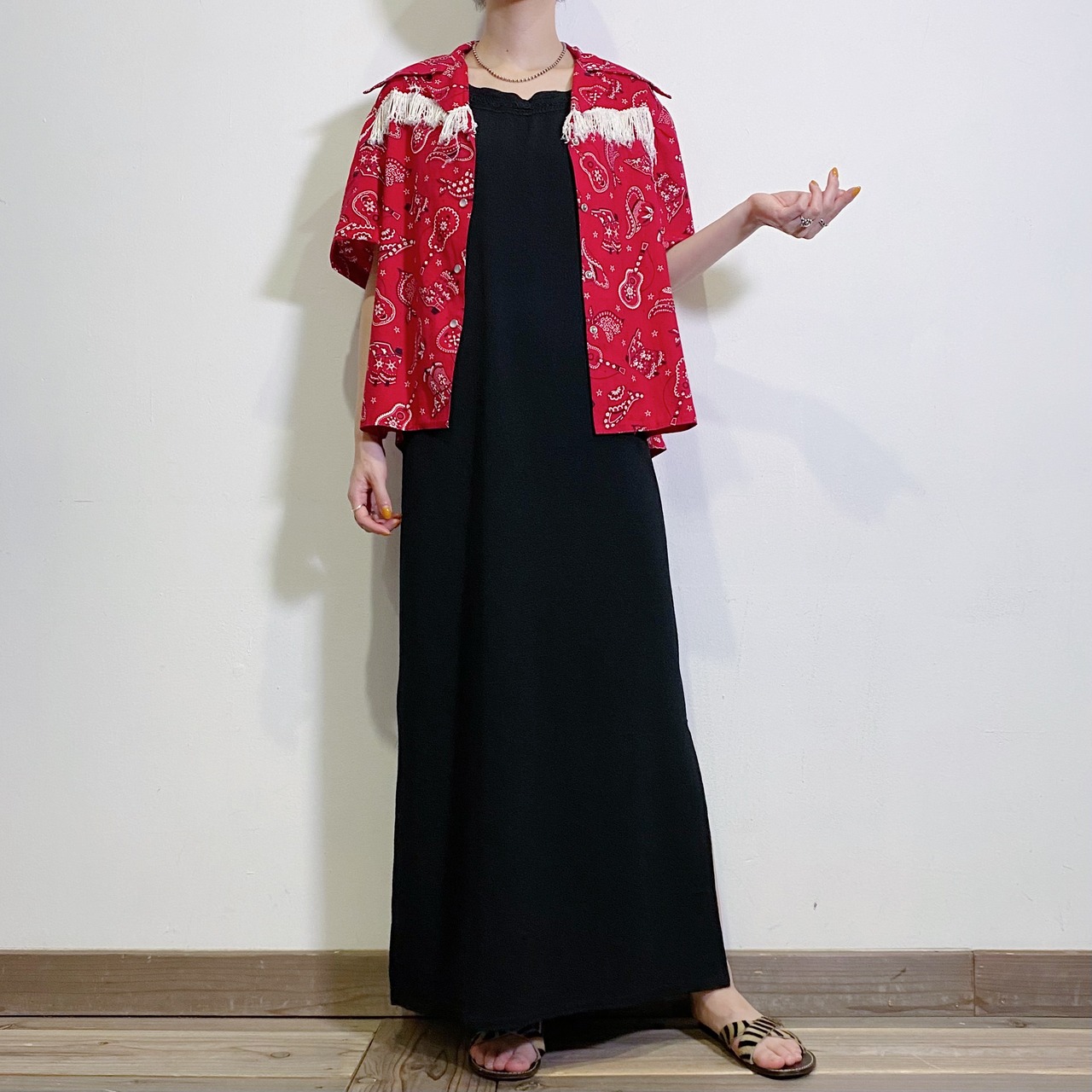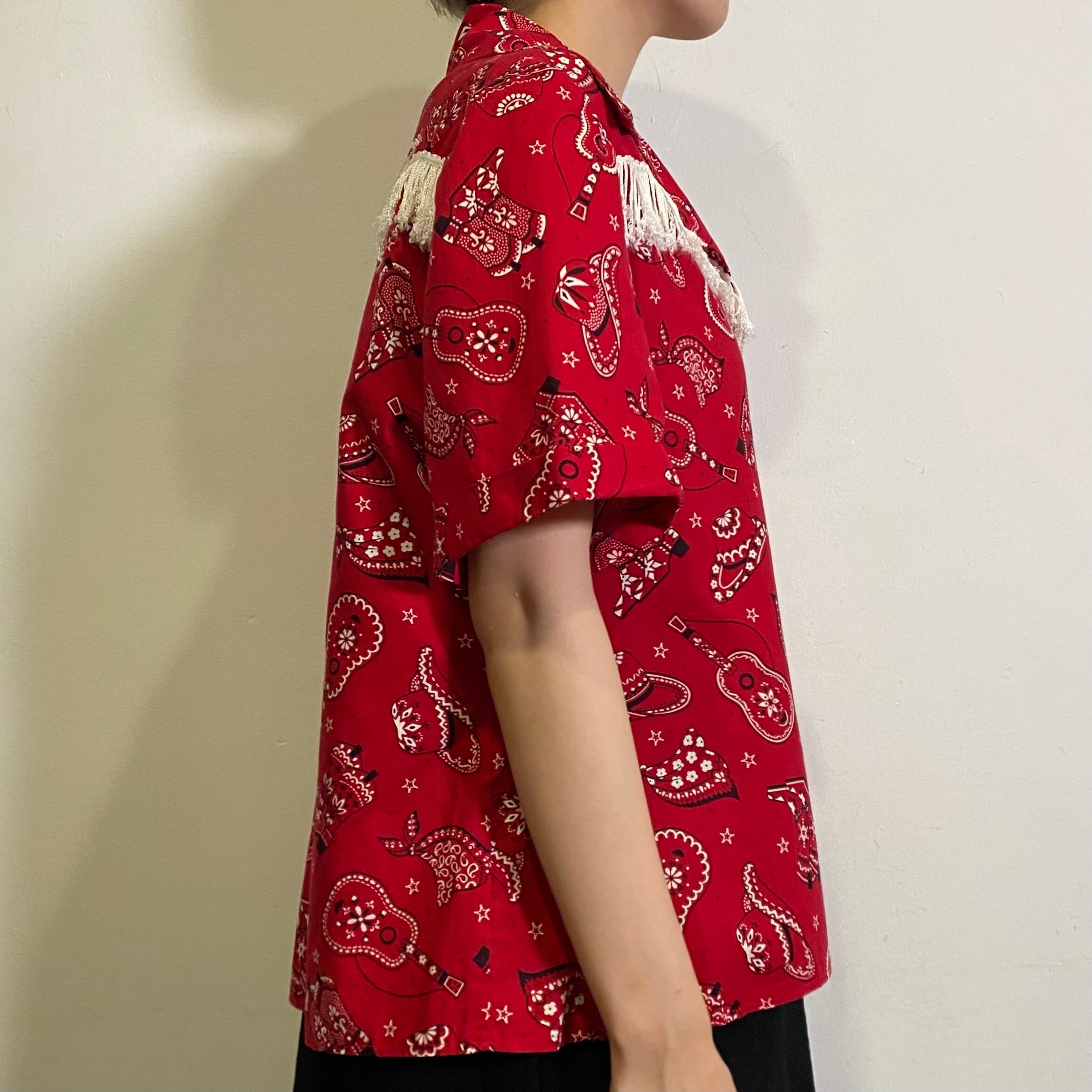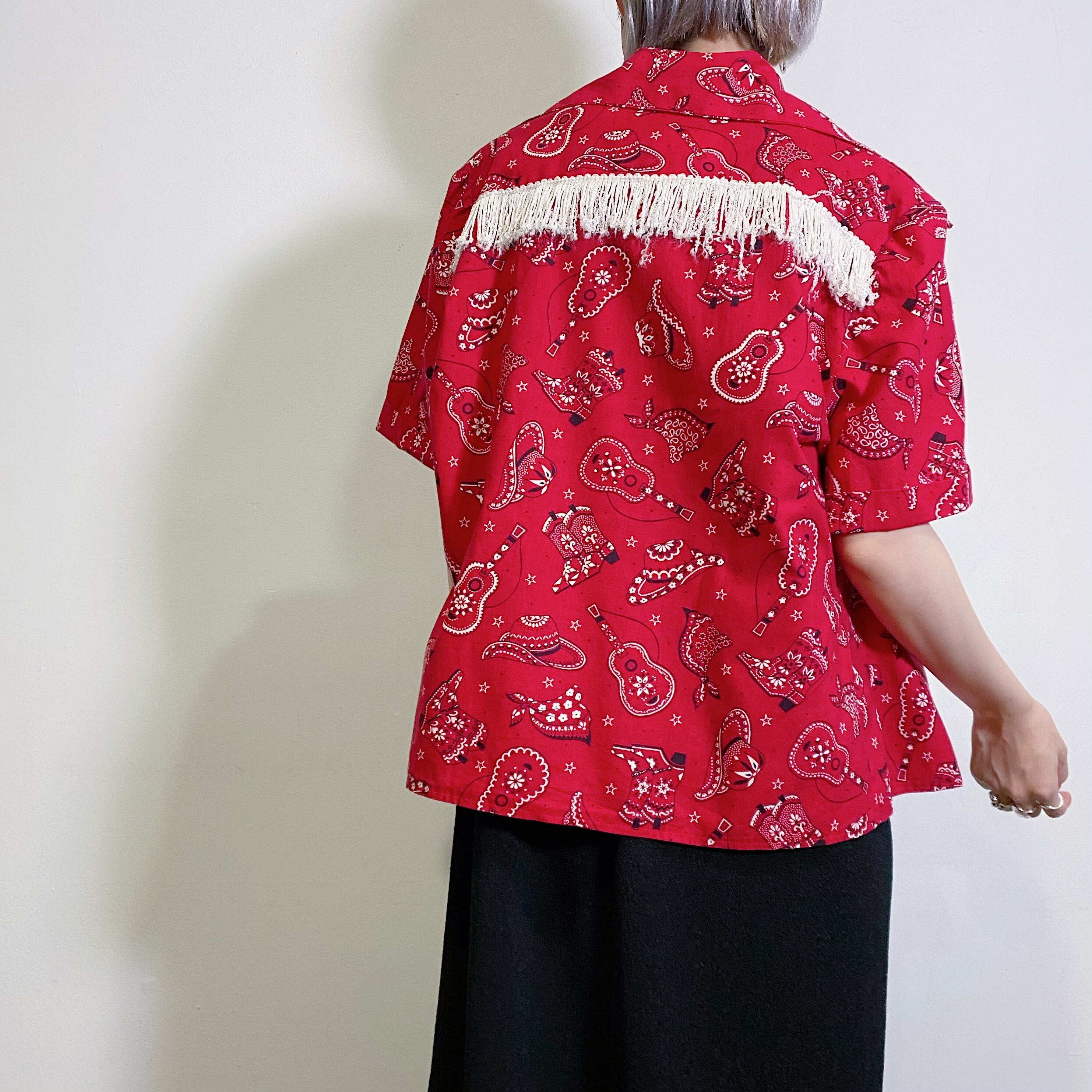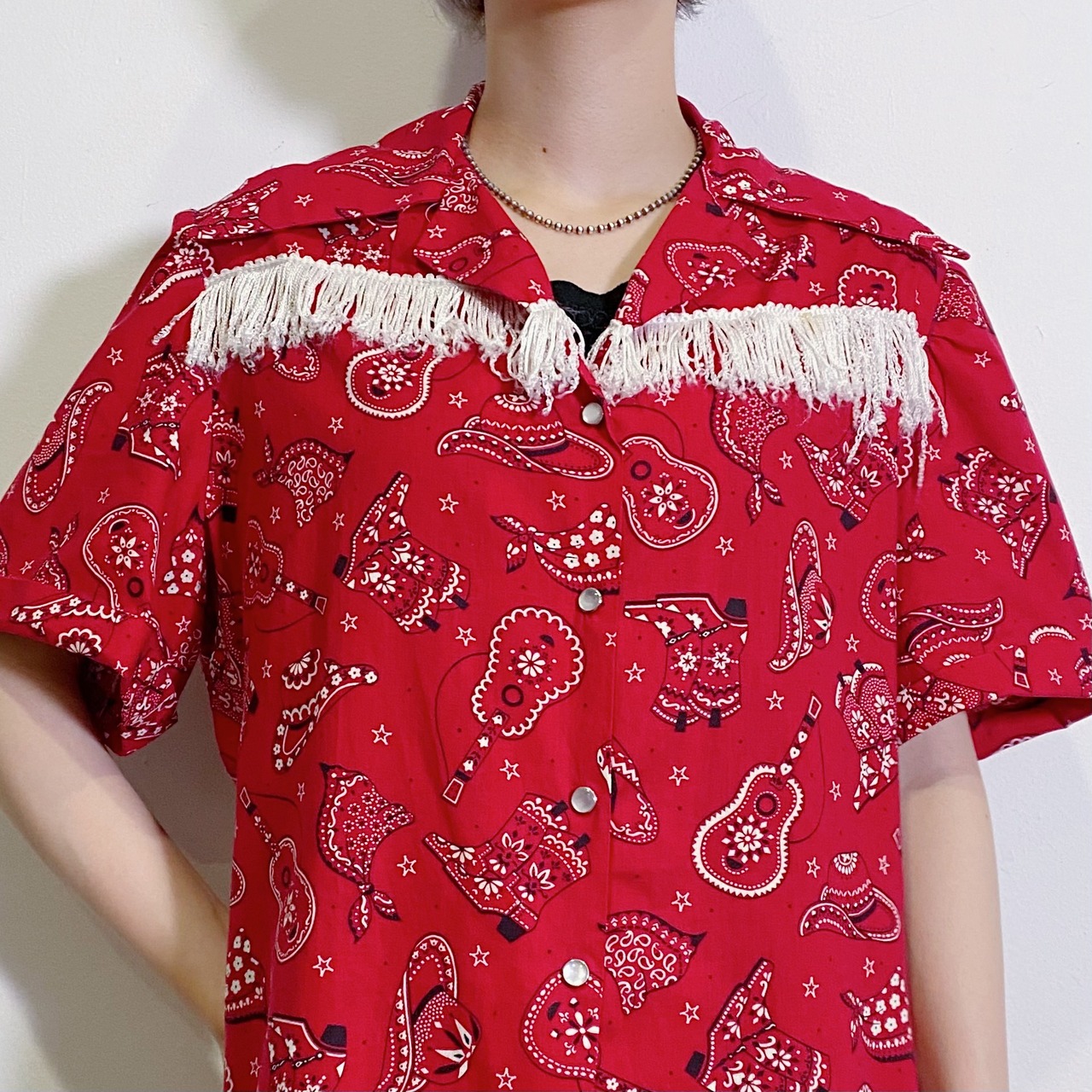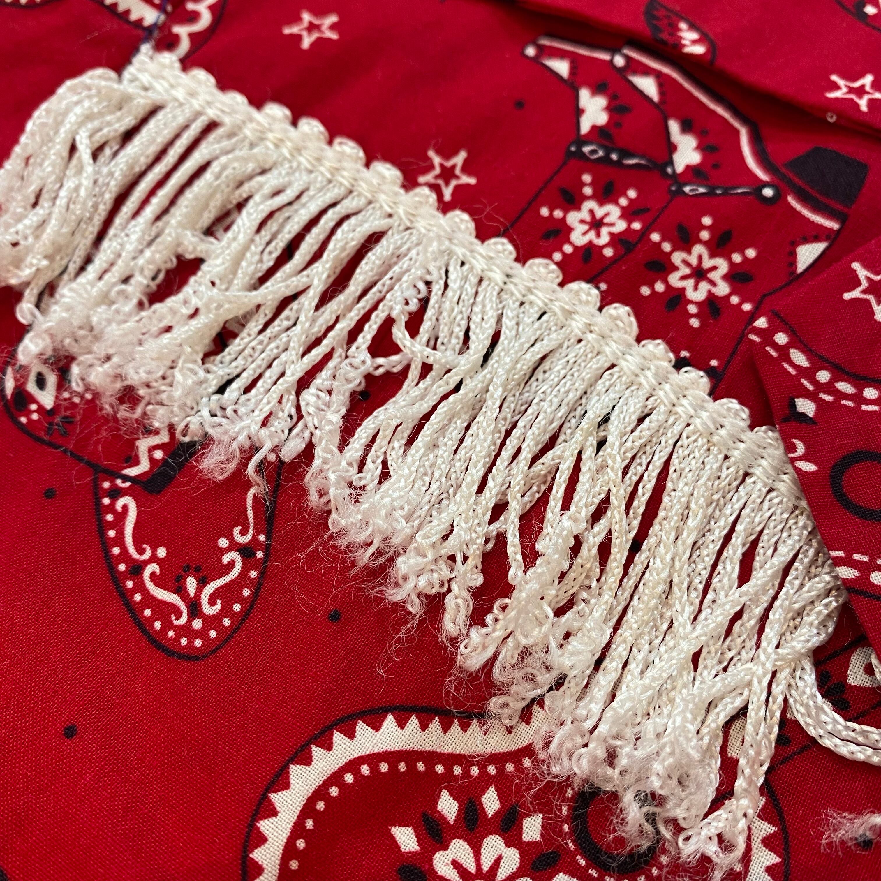 ハットやブーツなどカウボーイモチーフの総柄に、フリンジがとってもキュート。