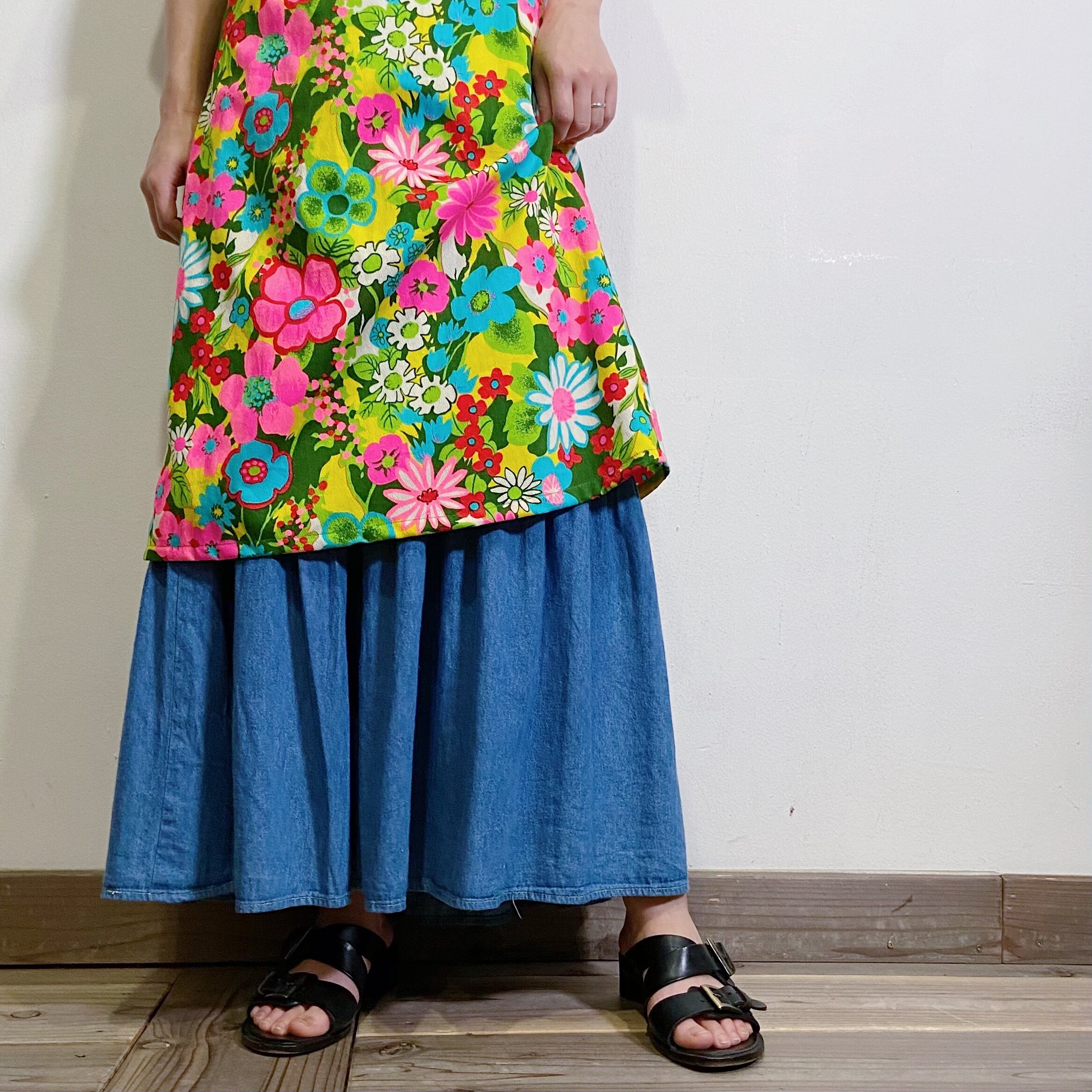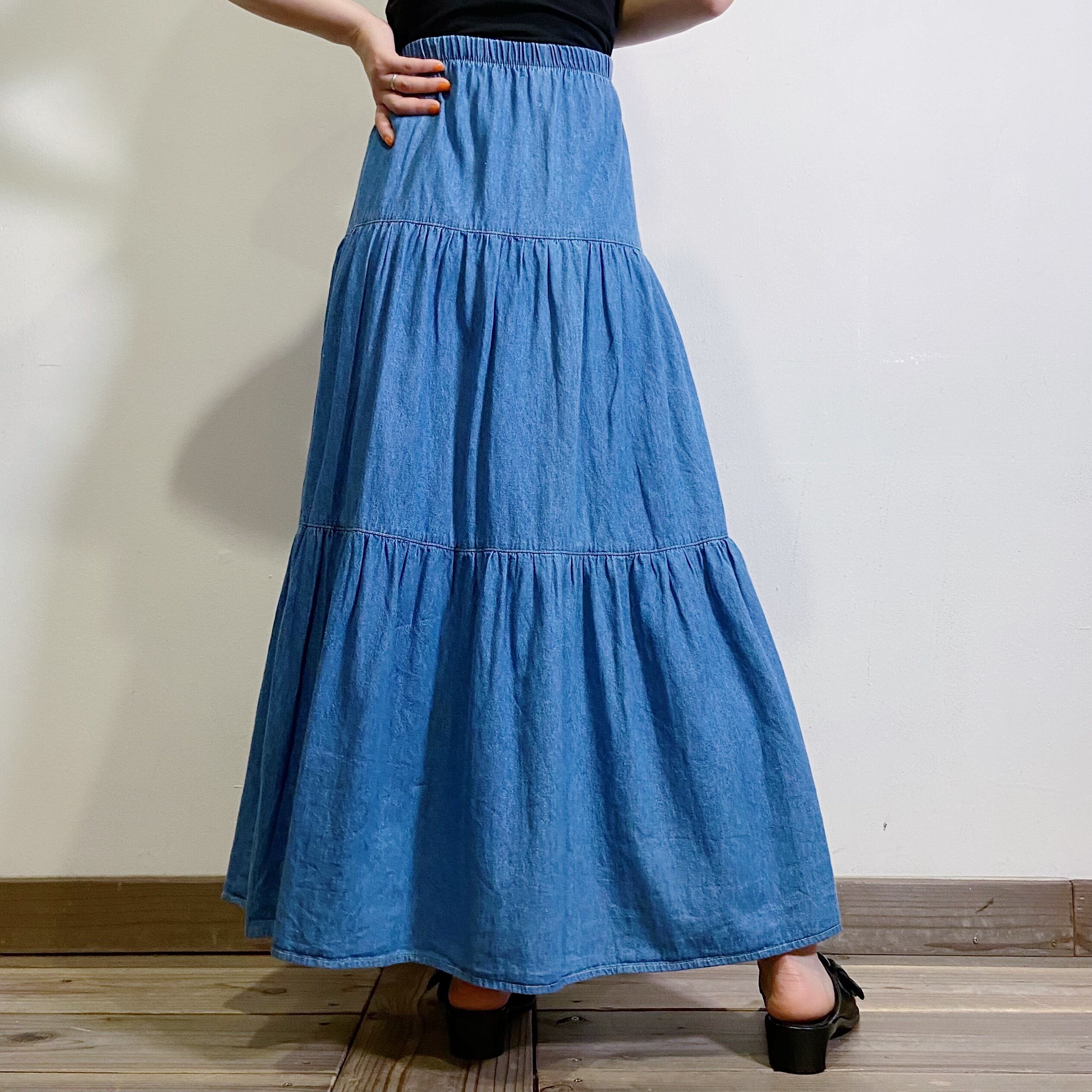 ティアードデザインが可愛い、デニムのロングスカートです。