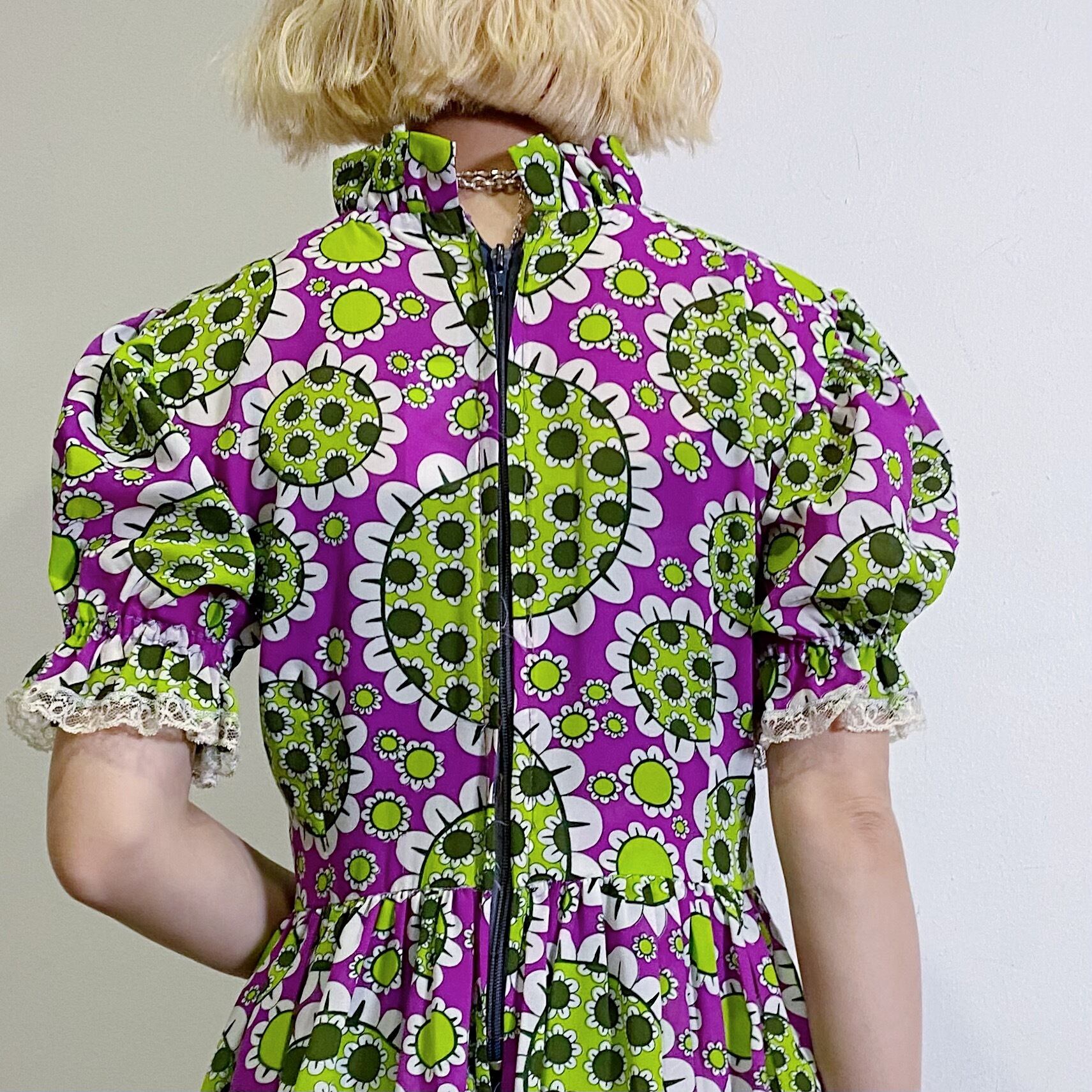 パープルとグリーンの色合いもエッジがあってお好きな人にハマりそうなワンピースです。