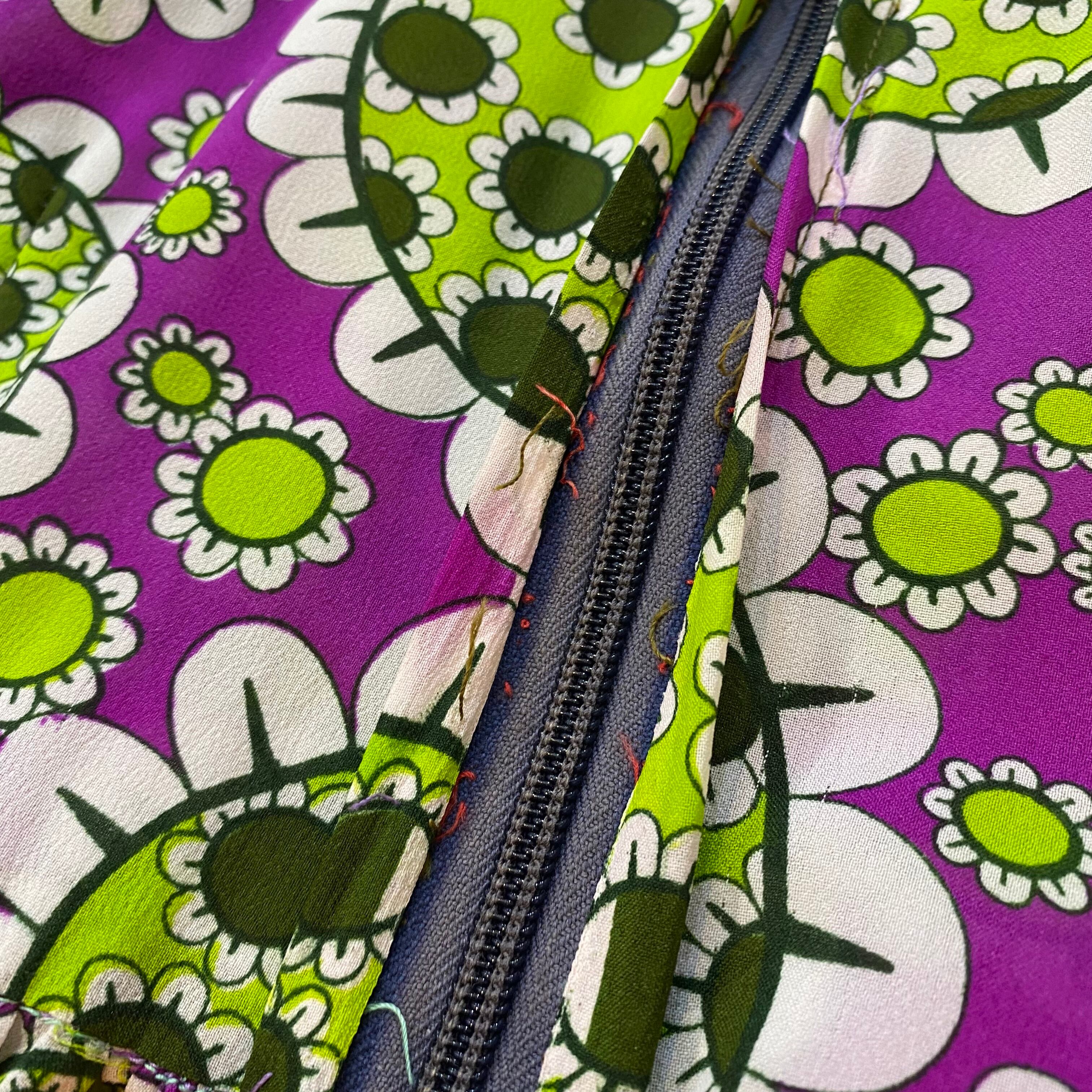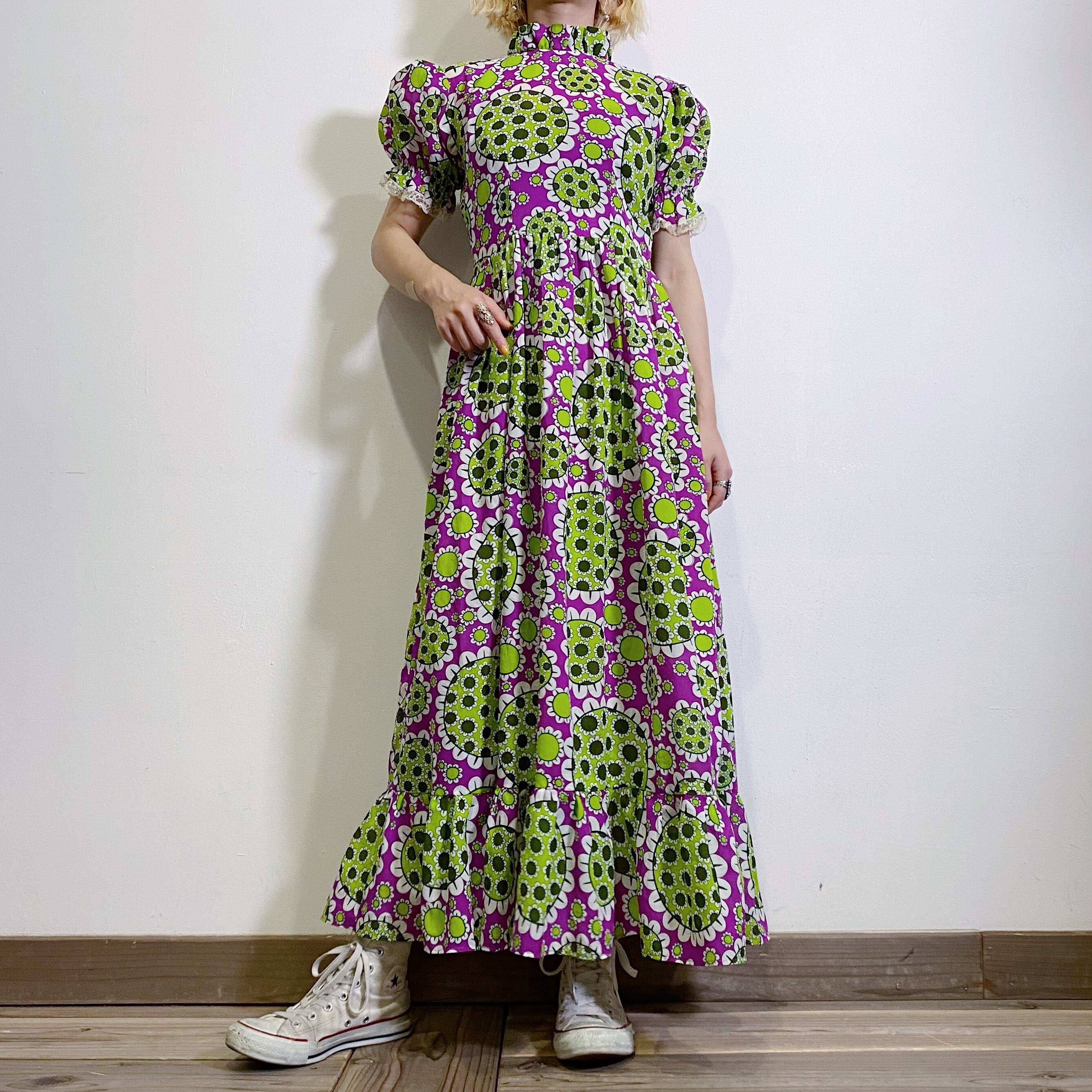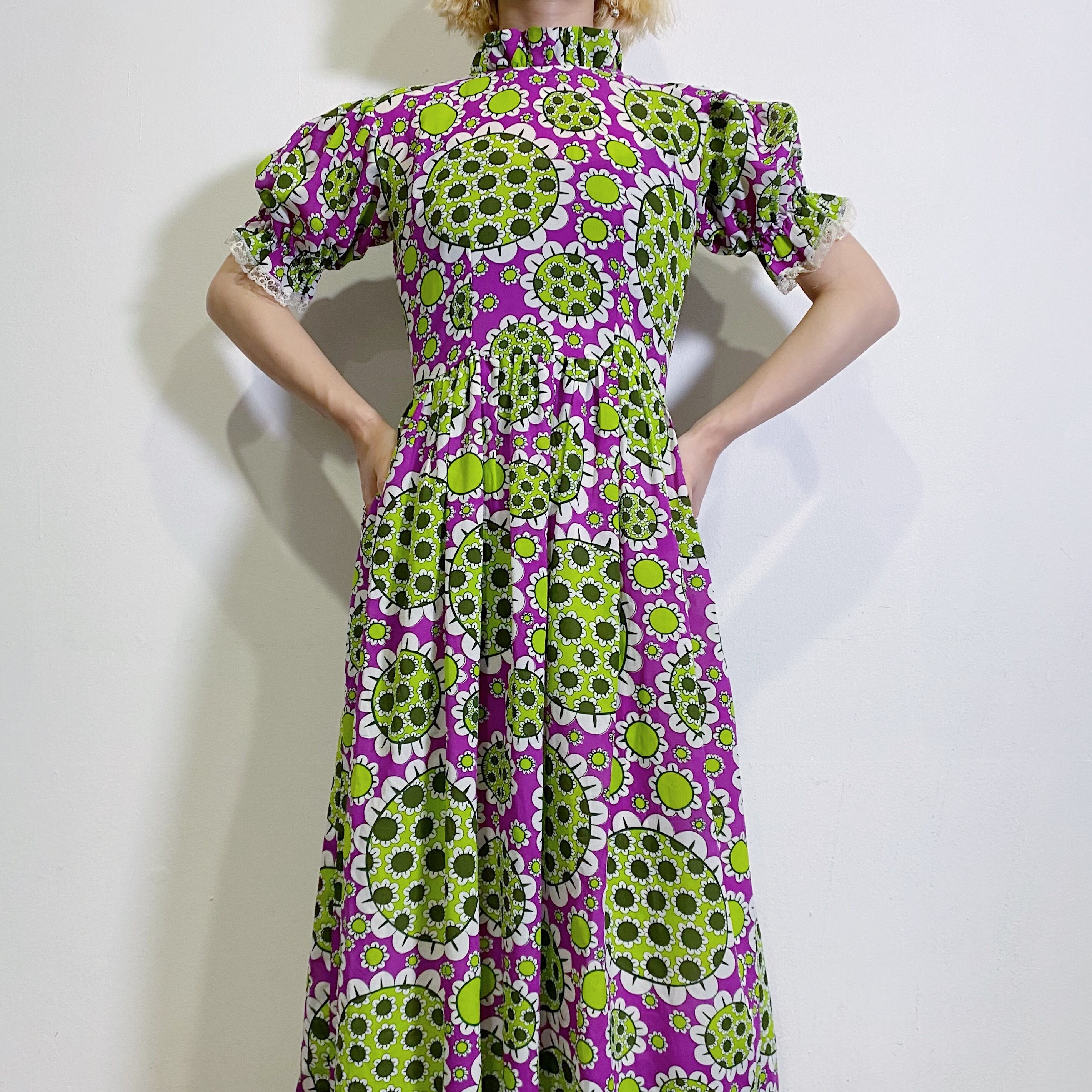 いろいろな大きさのお花柄が可愛い、70年代のロングワンピースです。