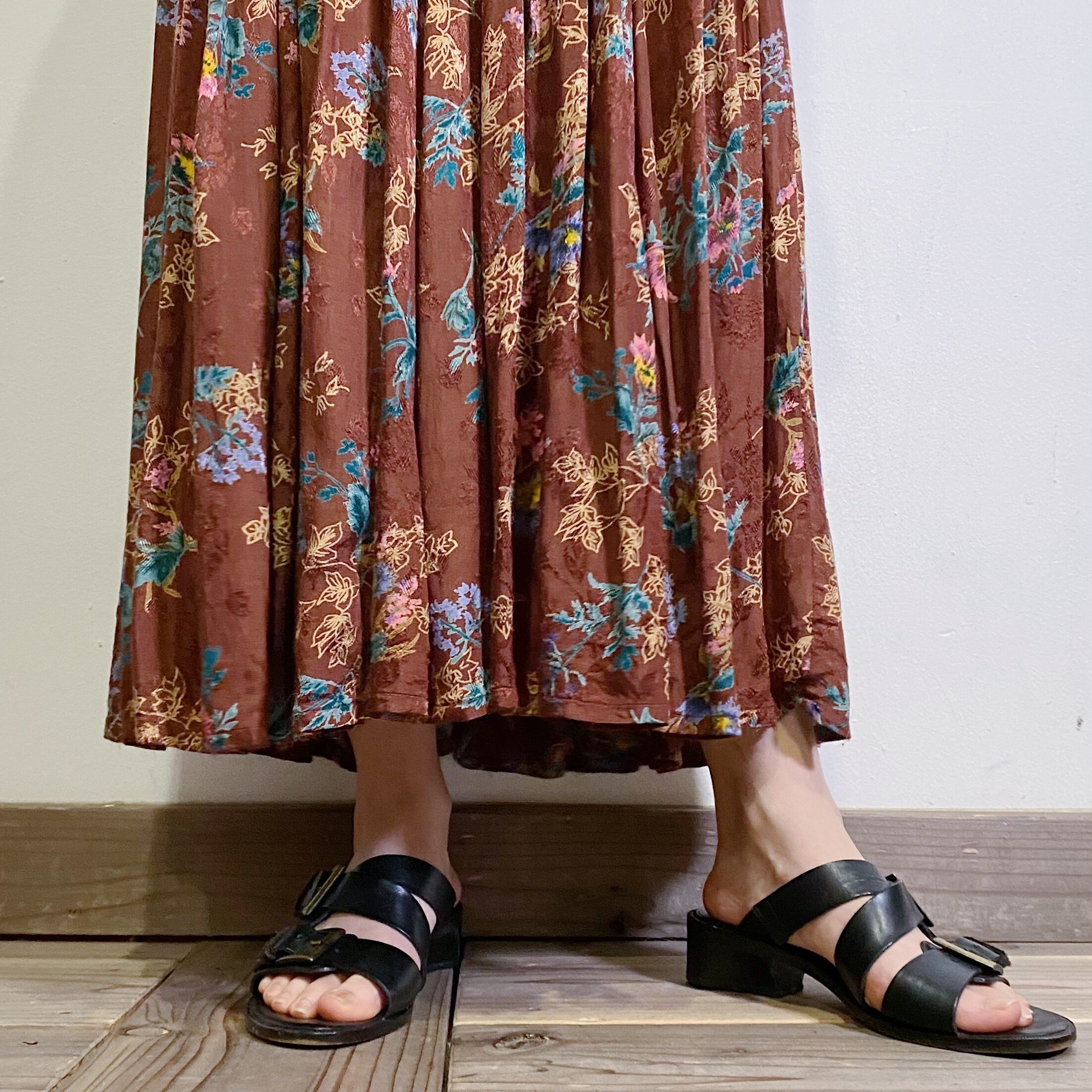 ブラウンカラーにグリーンやピンクのお花の色合いが素敵な、90年代のロングスカートです。