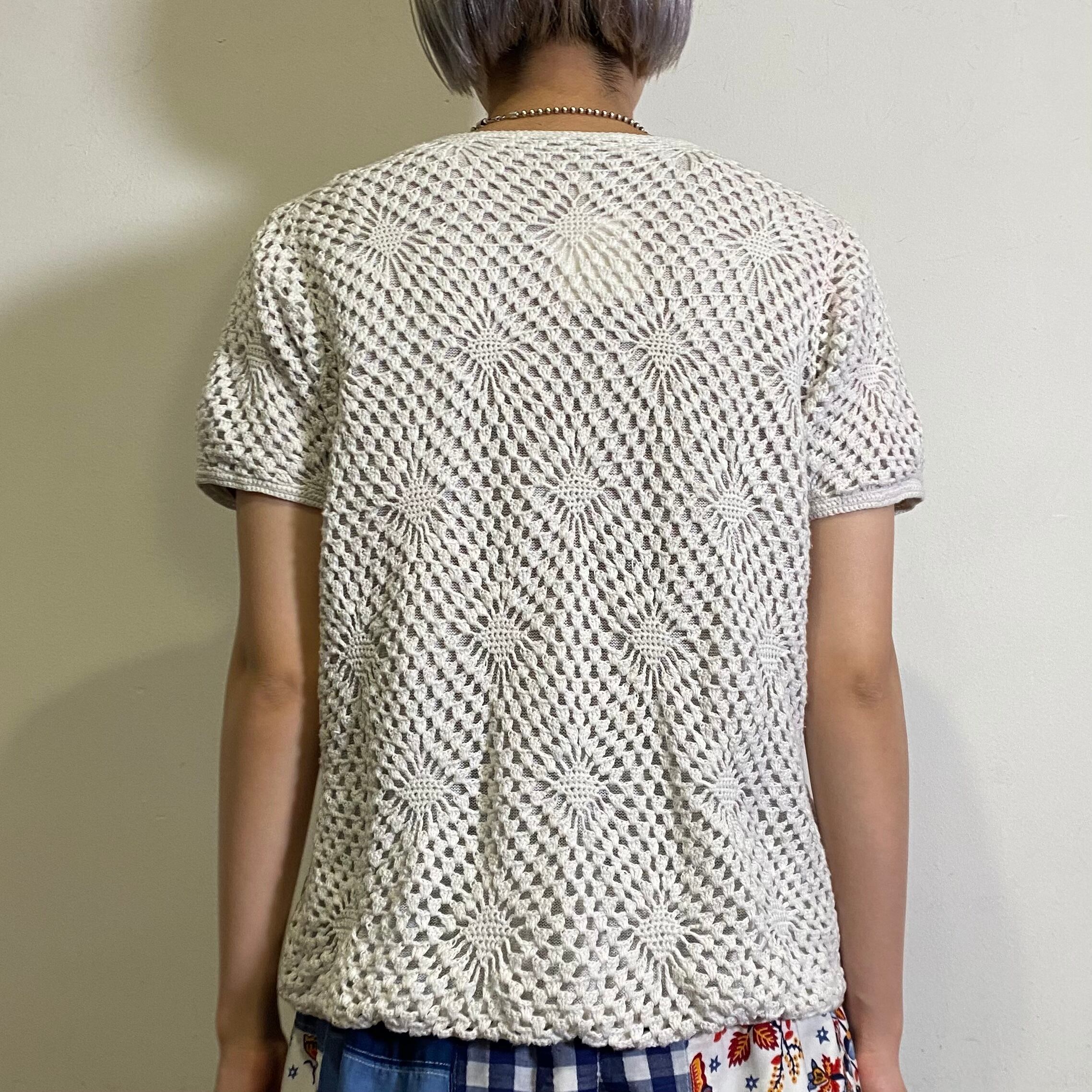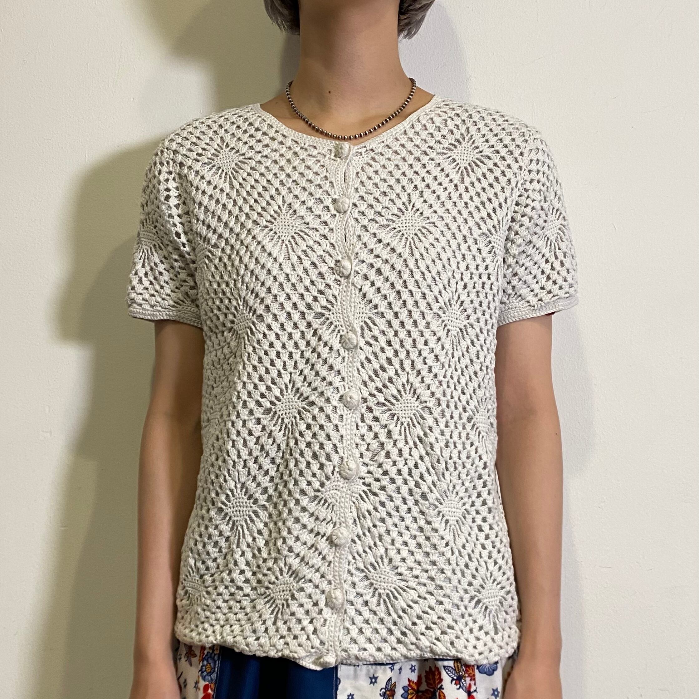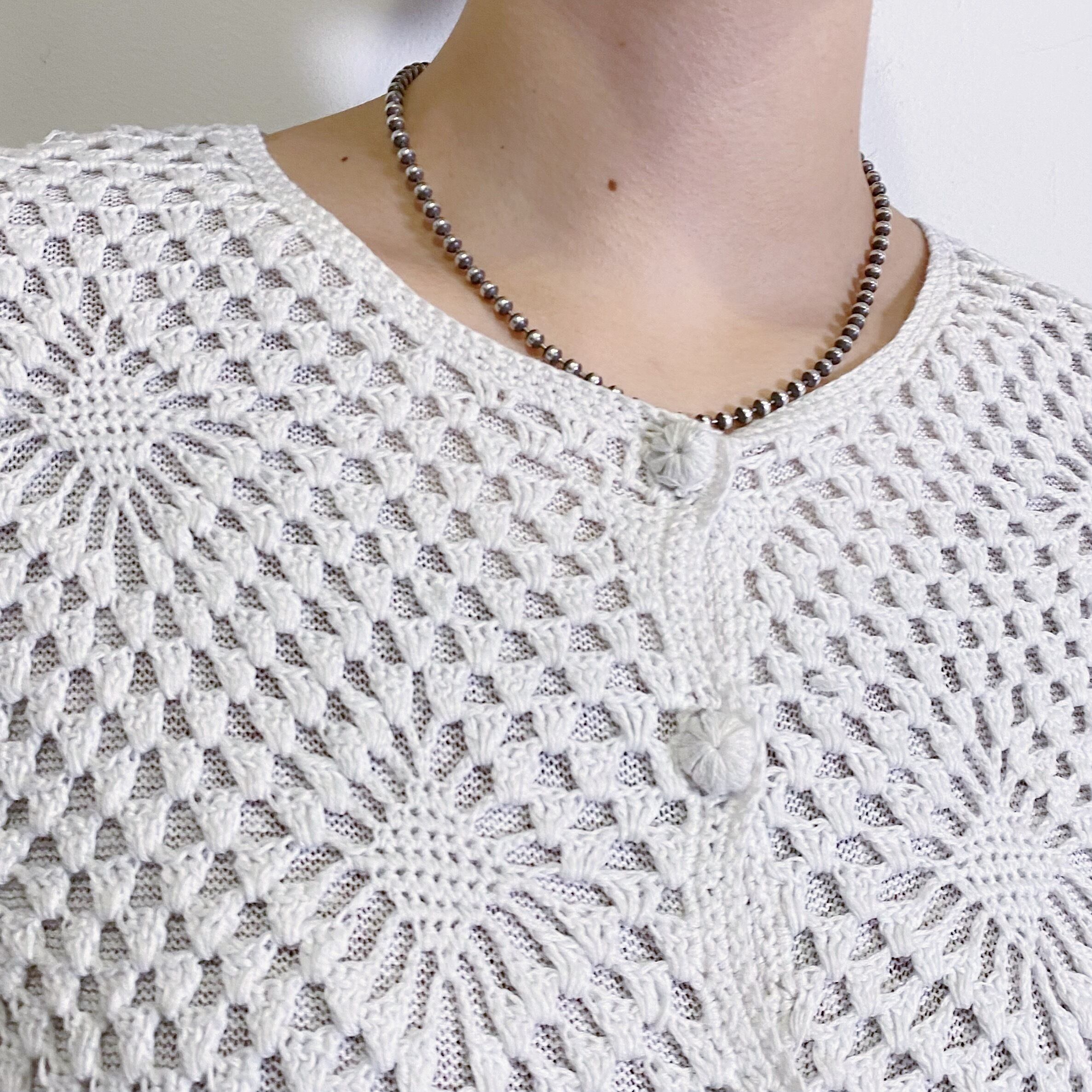 ひし形のような編み目が可愛い、クロシェニットカーディガンです。