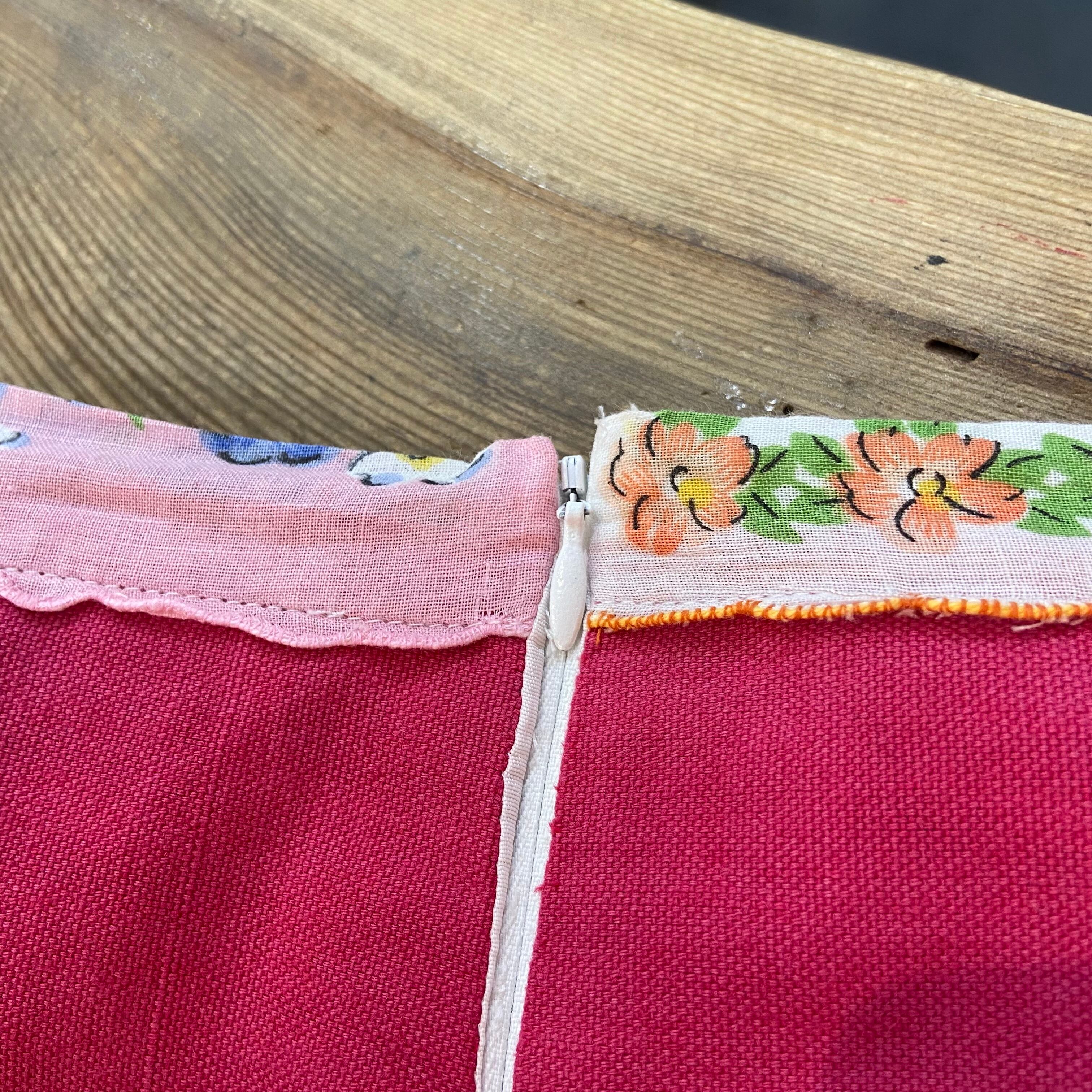 お花やラズベリーのプリントに、裾にはいろんな花柄の50年代頃のハンキーをジグザグと縫い付けてあるスペシャルなデザイン。