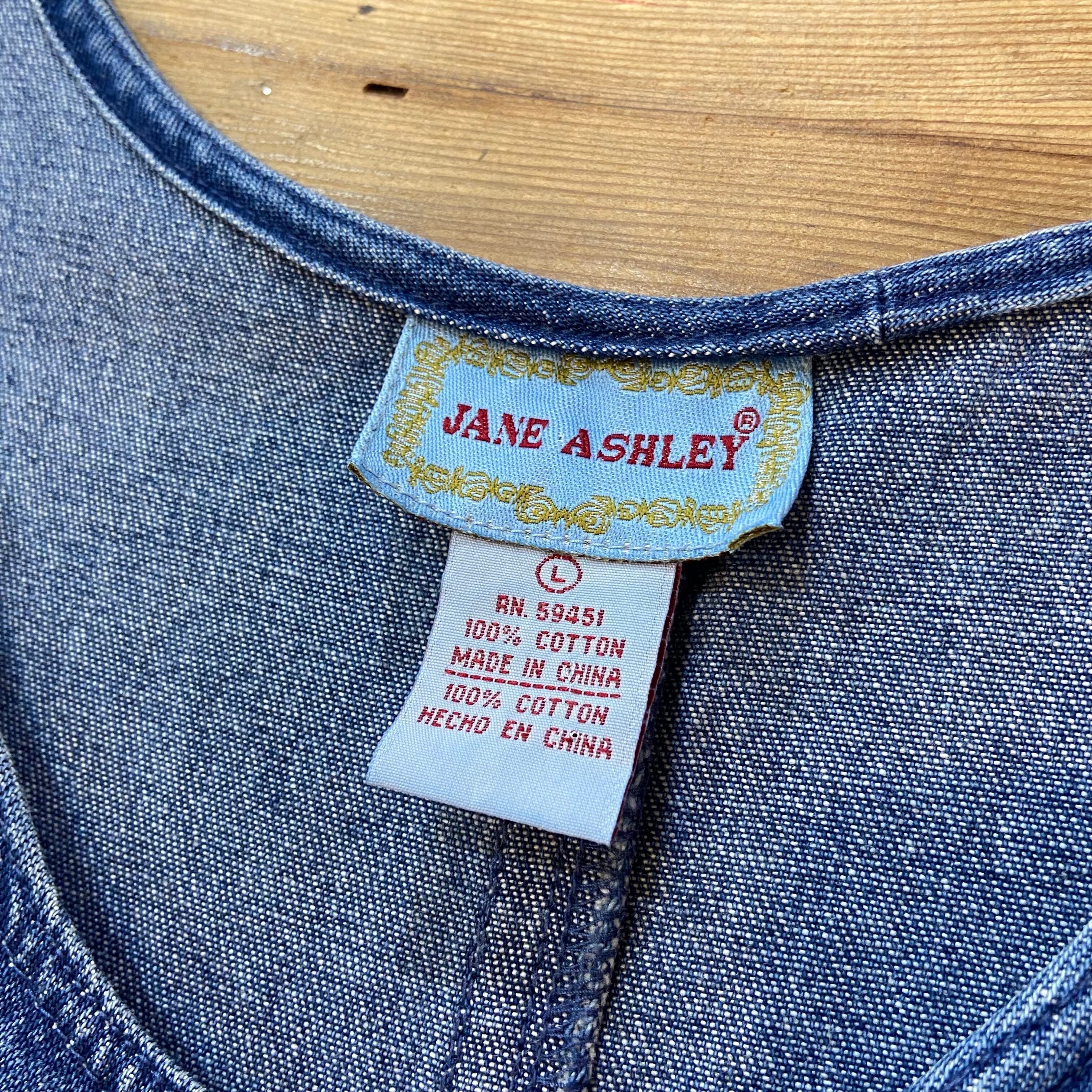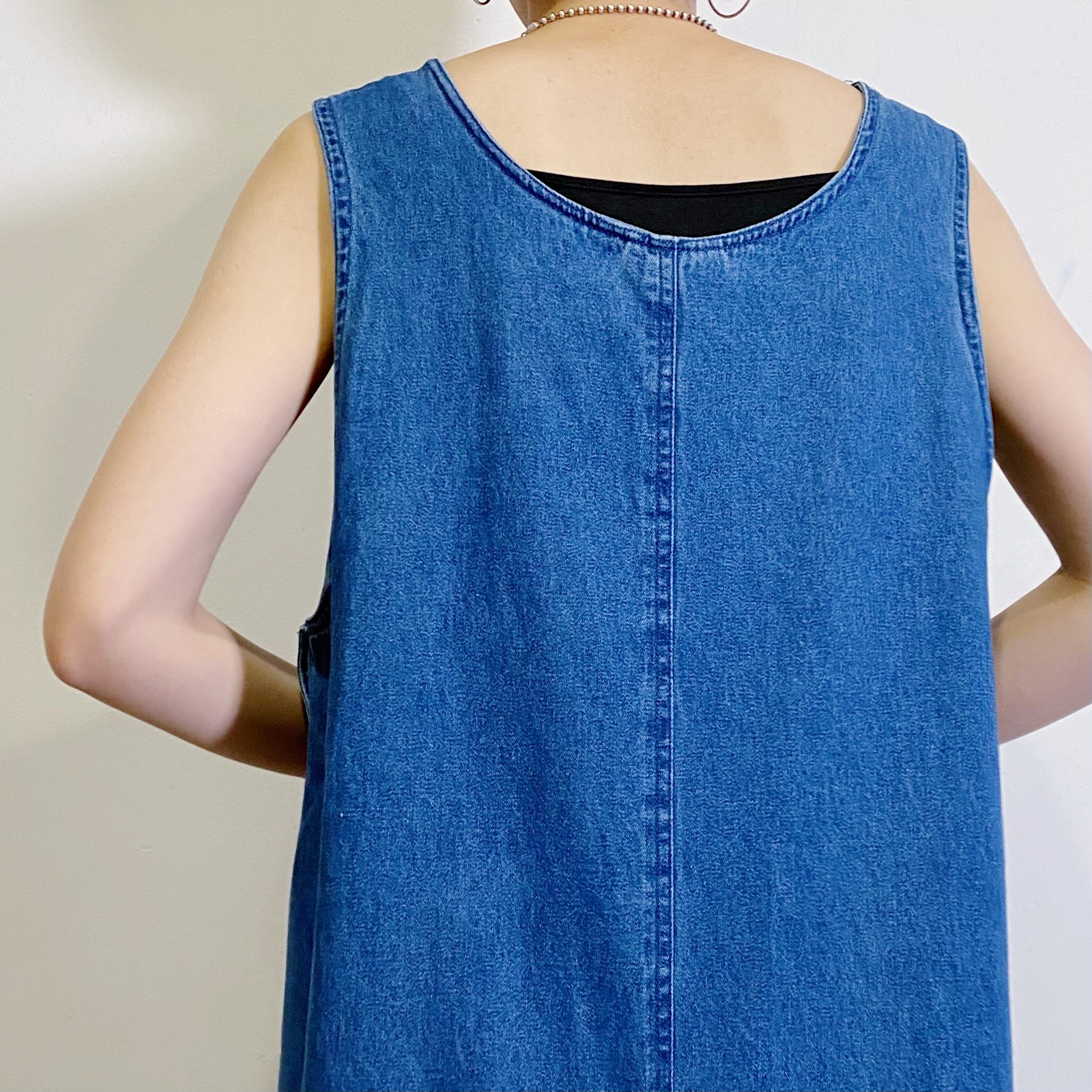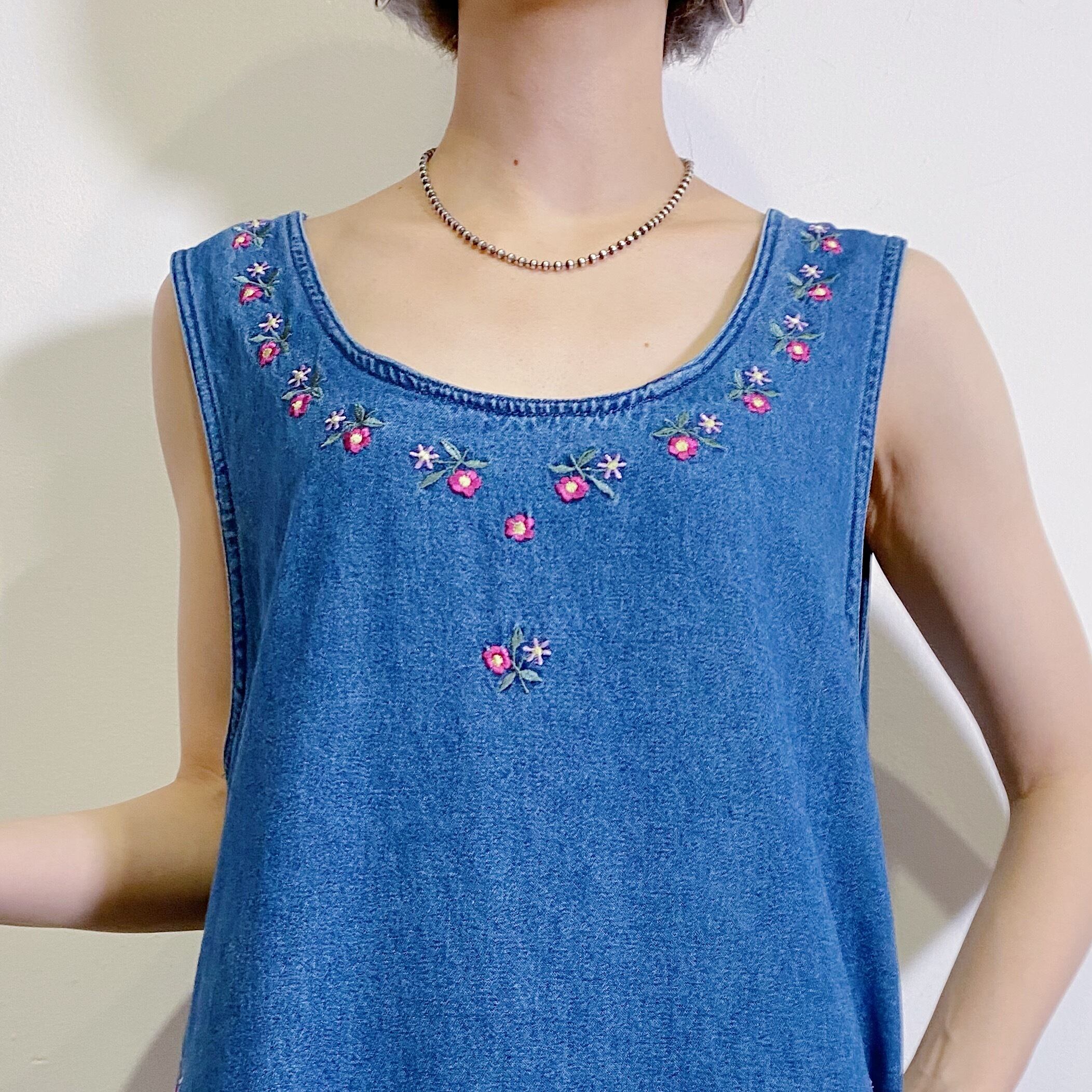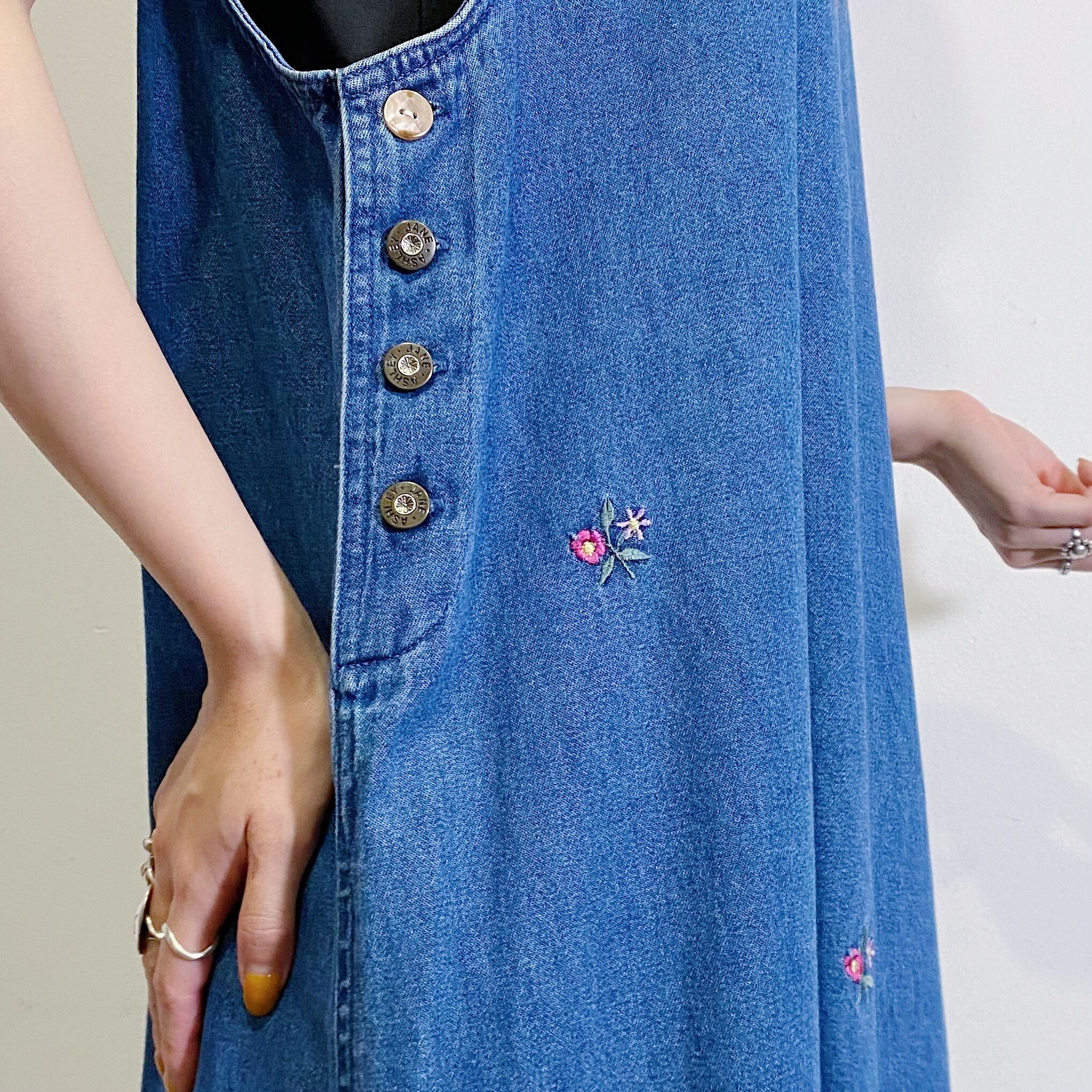 デニム素材にピンクやラベンダーのお花刺繍がキュートな、90年代のロングワンピースです。