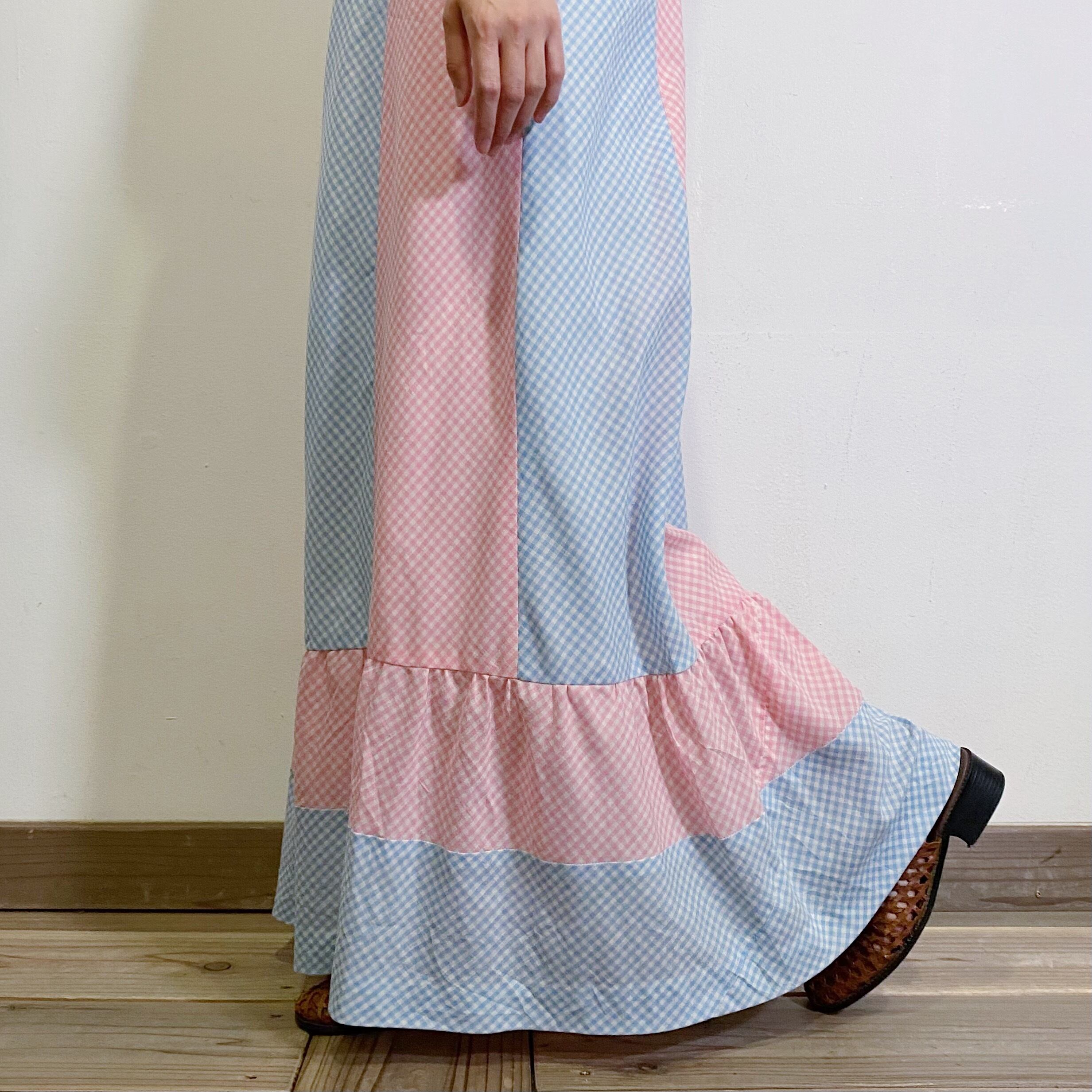 ベビーピンクとサックスブルーのギンガムチェックがとってもキュートな、70年代のロングスカートです。