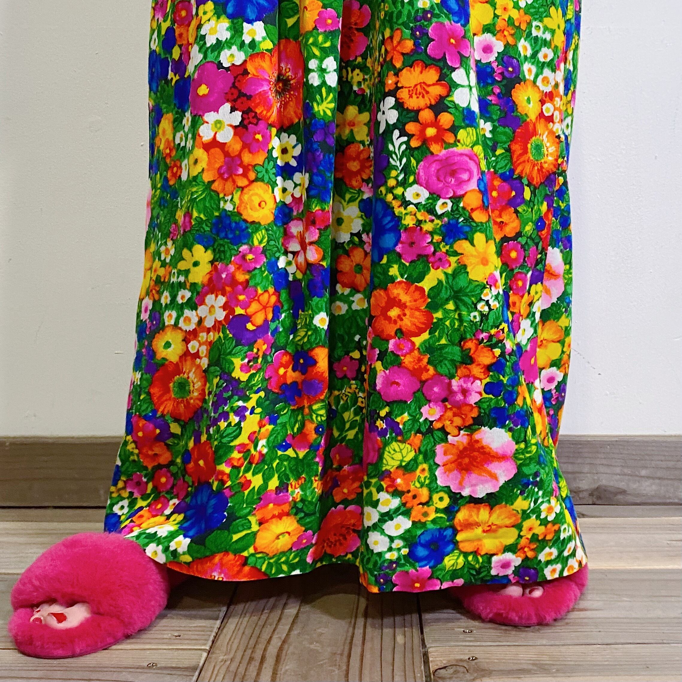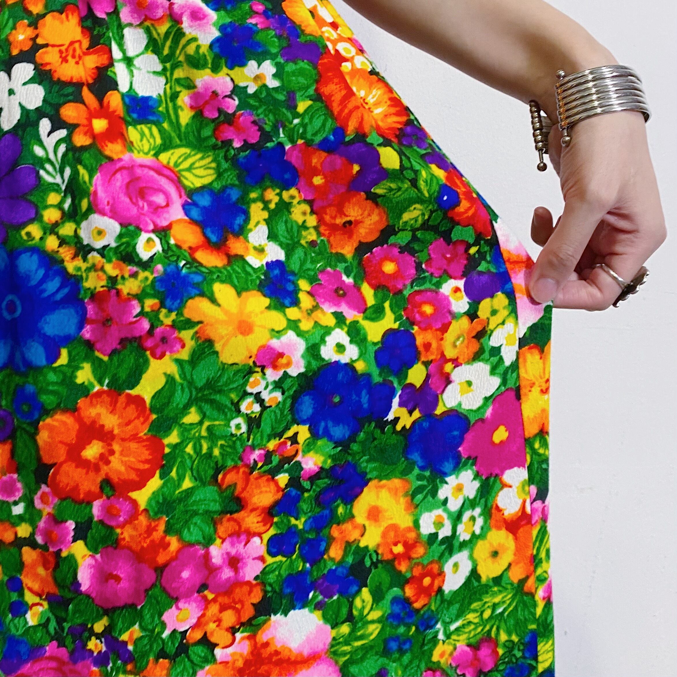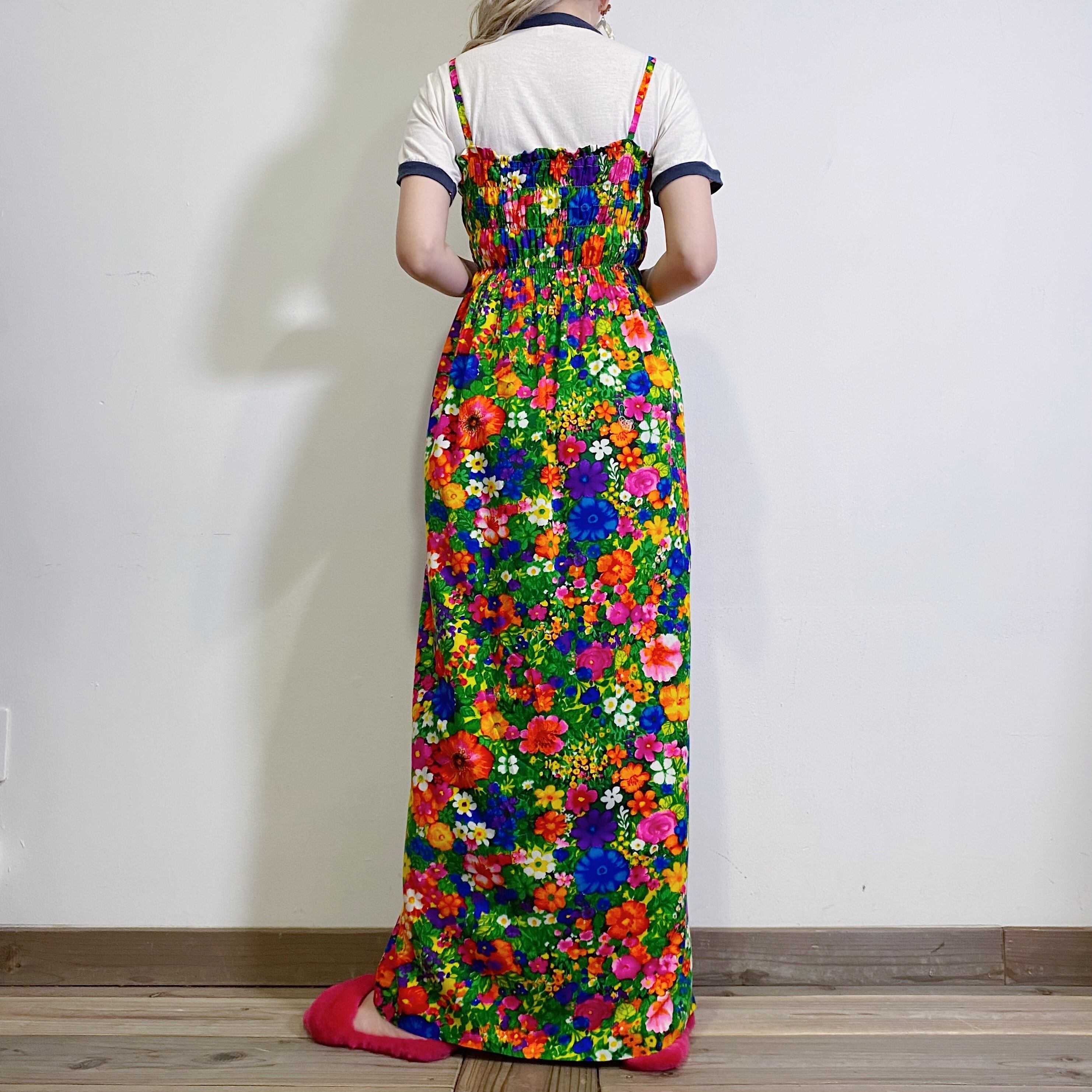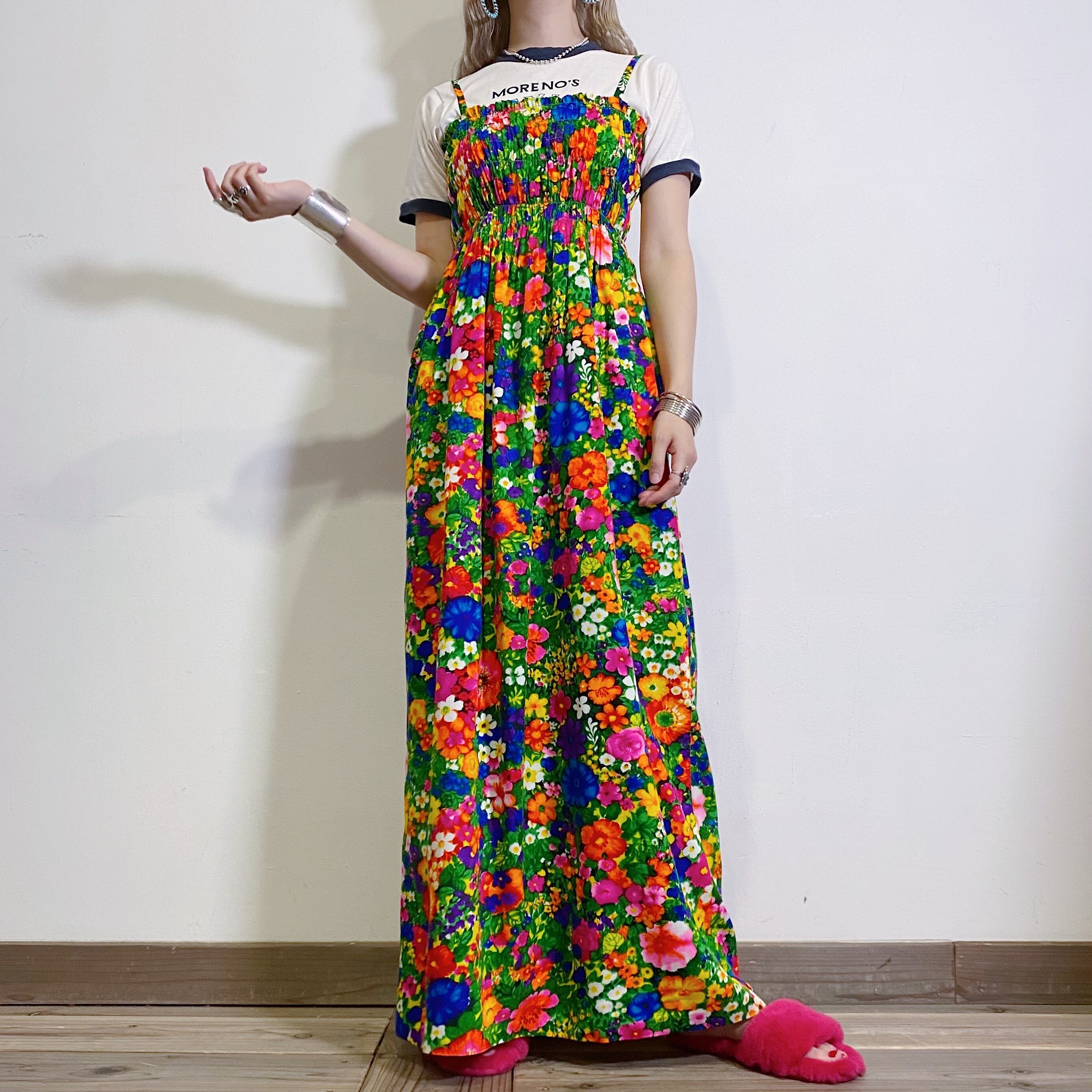 カラフルで着るだけでハッピーになれそうな、70年代の花柄キャミワンピースです。