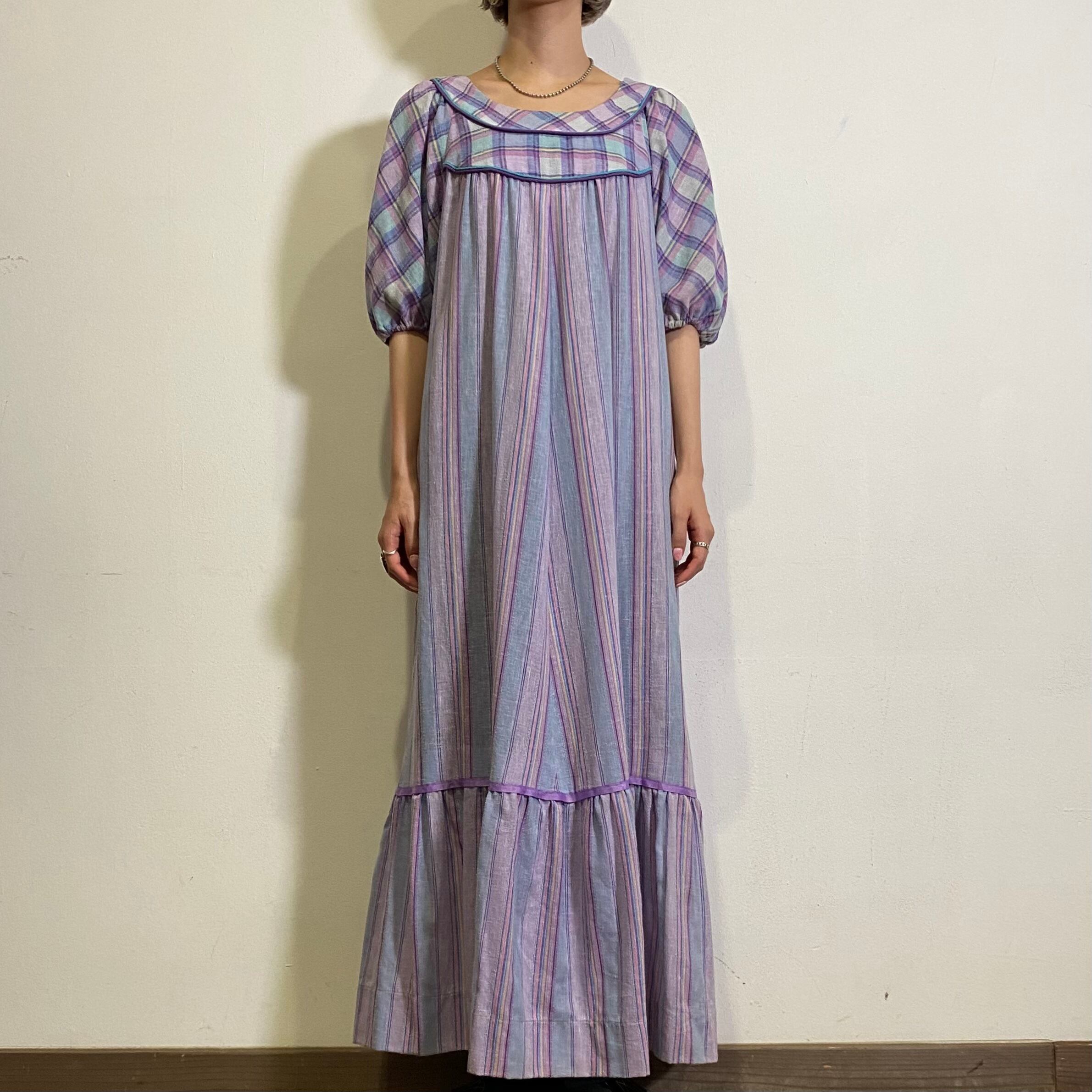 淡いパープルのストライプが可愛い、70年代のSearsロングワンピースです。