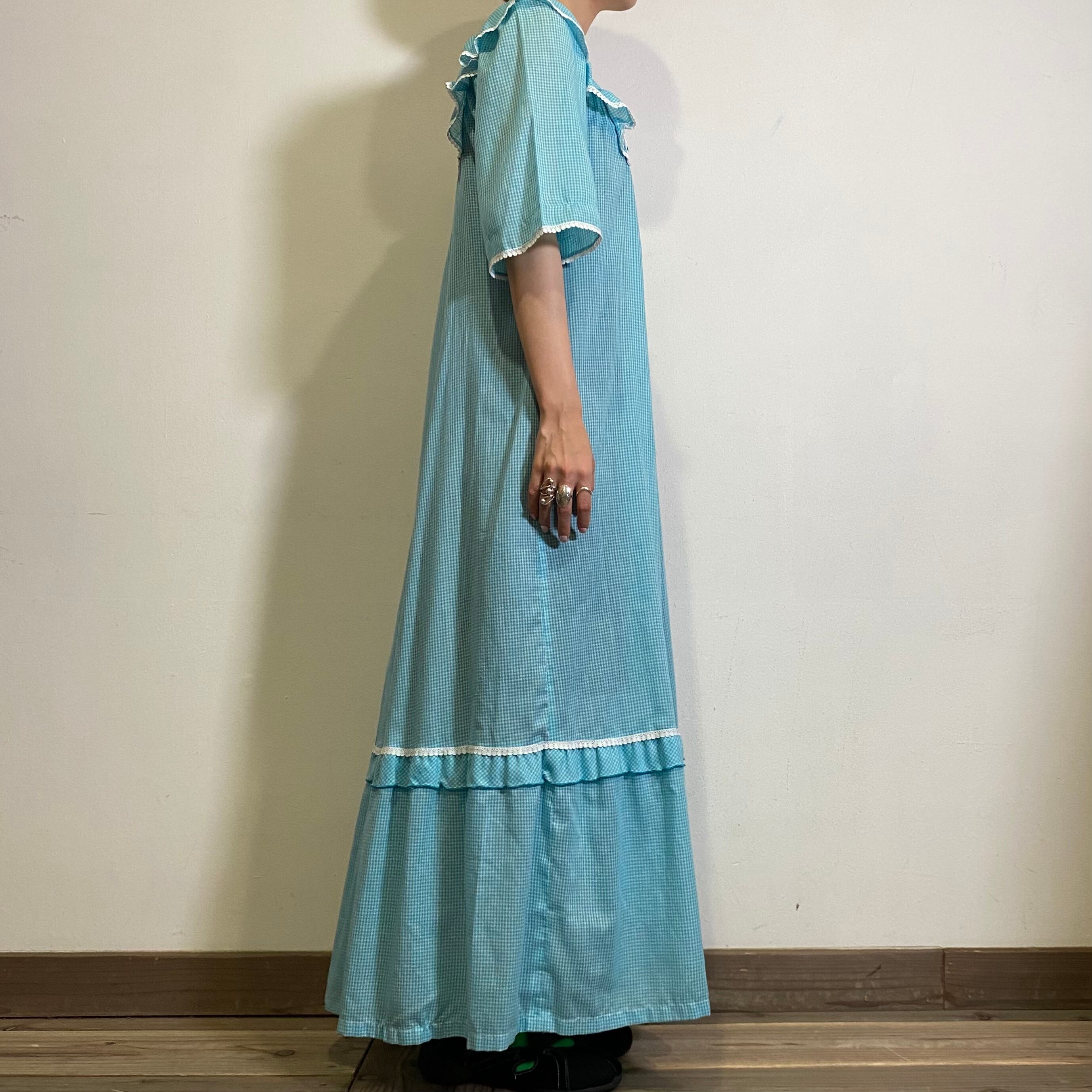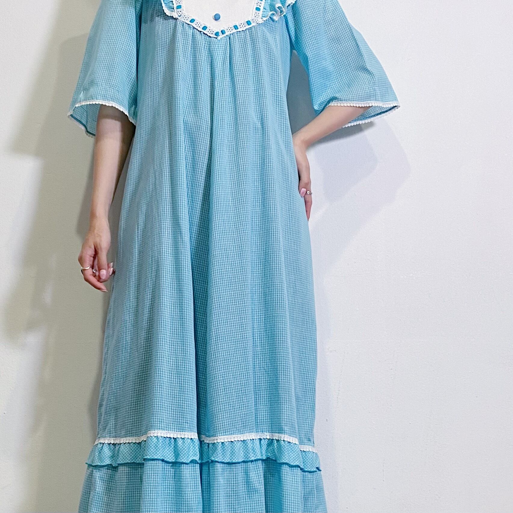 ギンガムチェックとレースの組み合わせがとってもキュートな70年代のロングワンピースです。