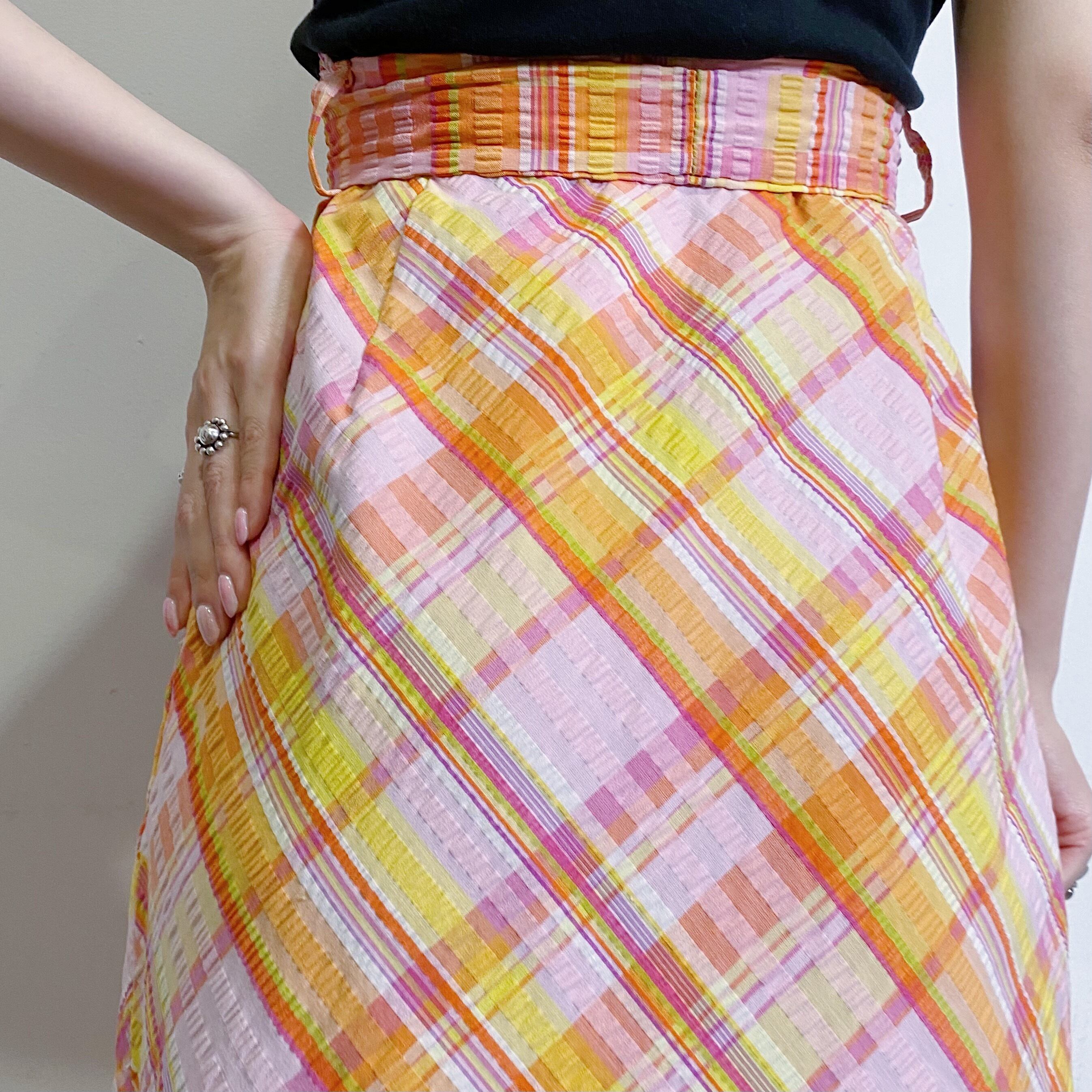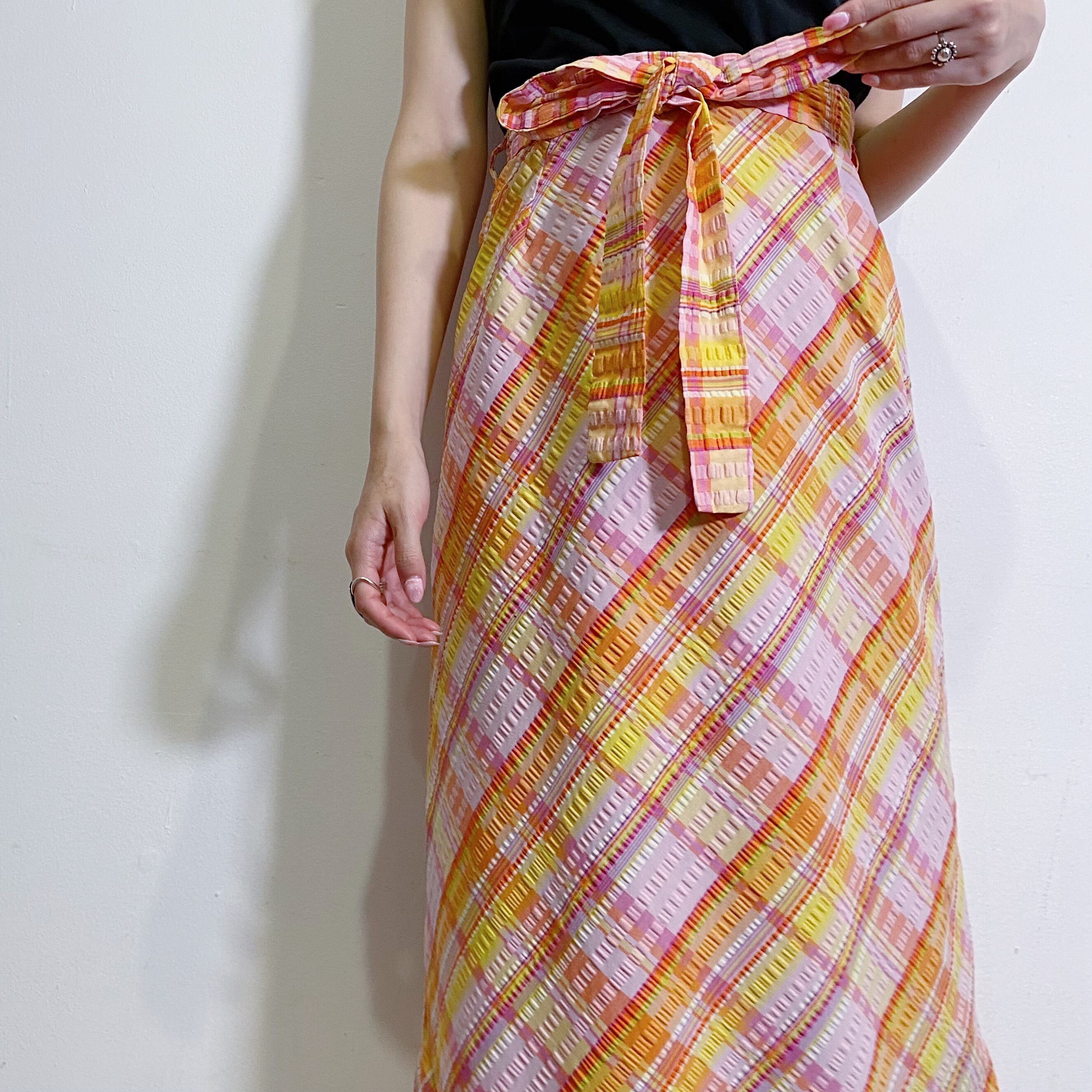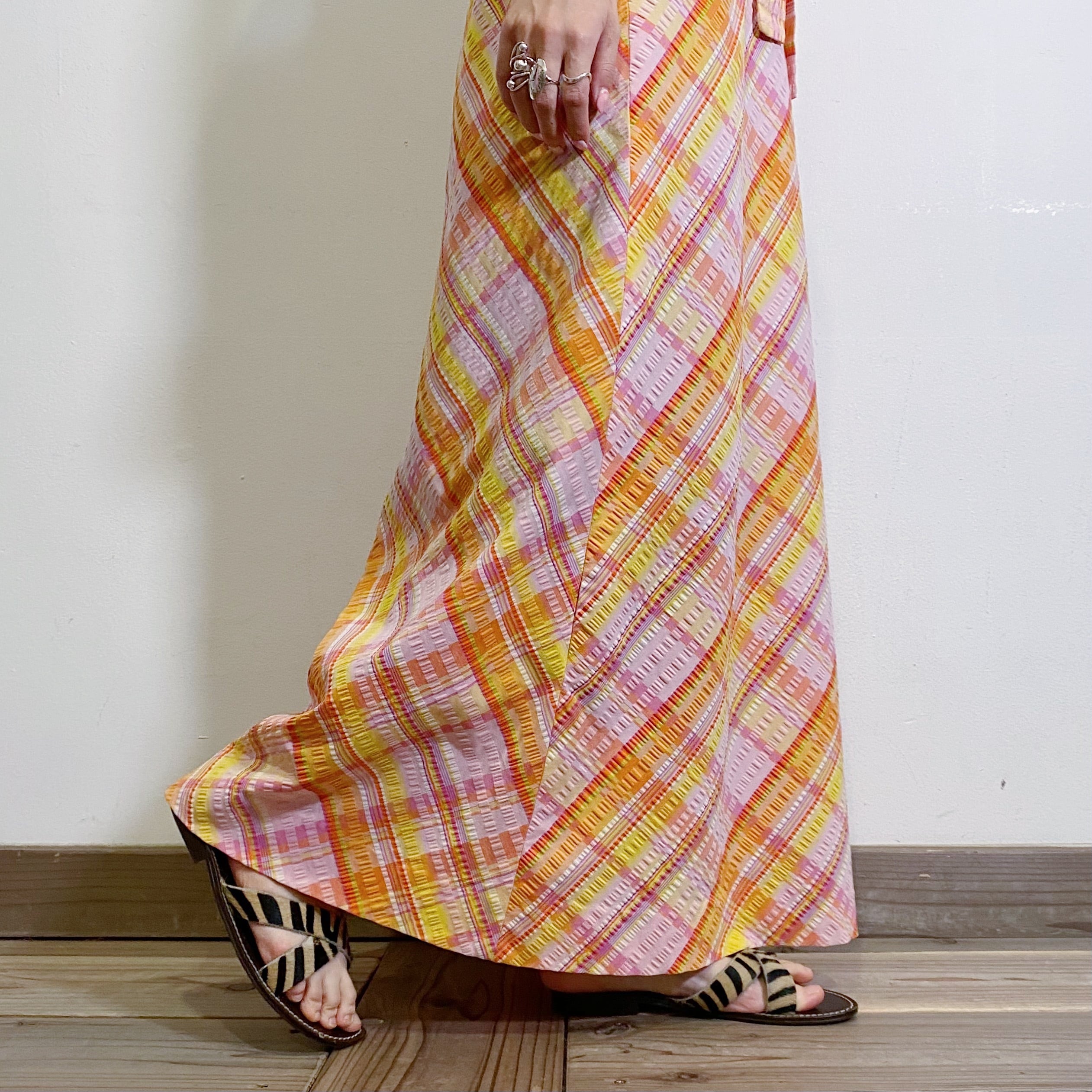 オレンジやイエローピンクの色合いのチェックがとってもハッピーで可愛い、70年代のロングスカートです。