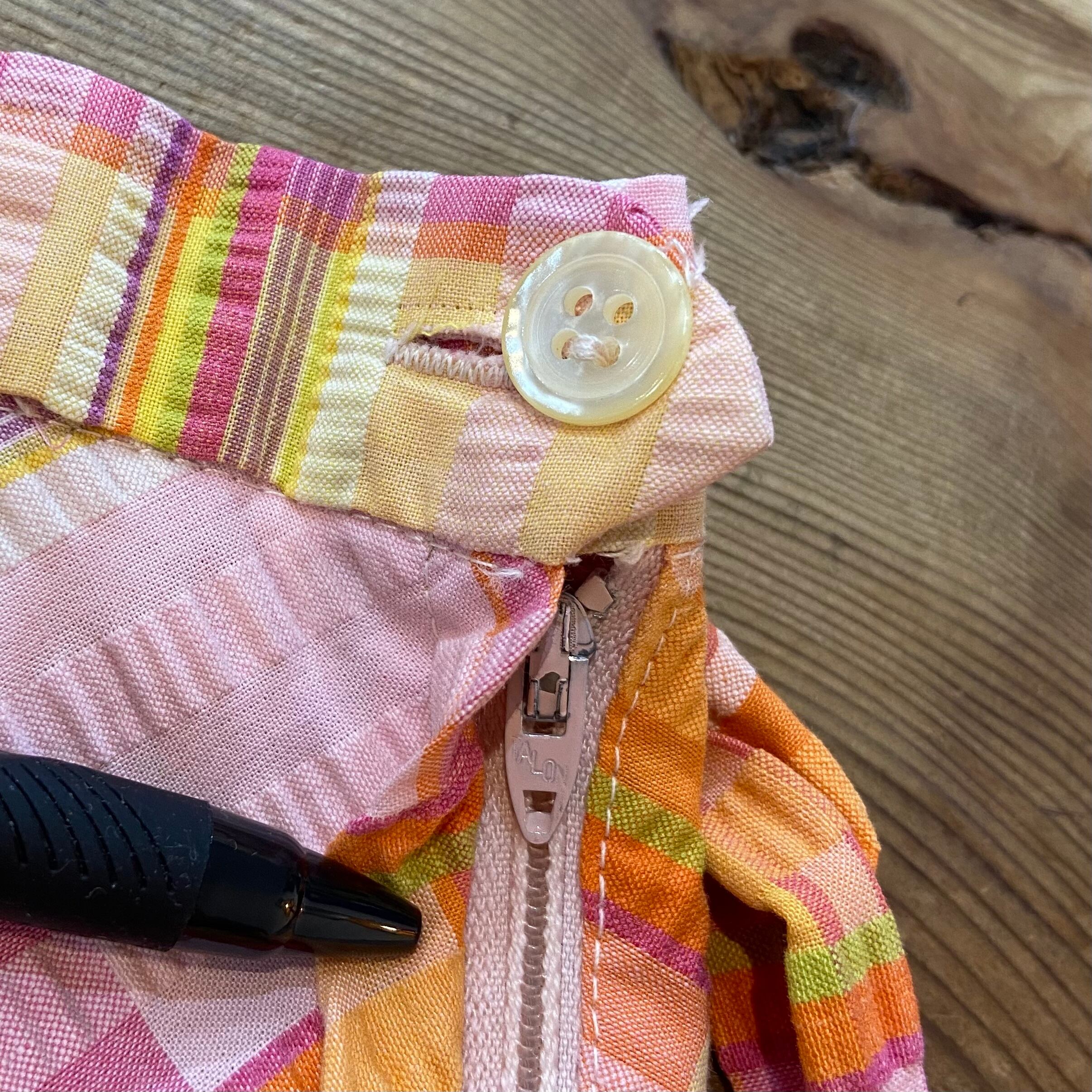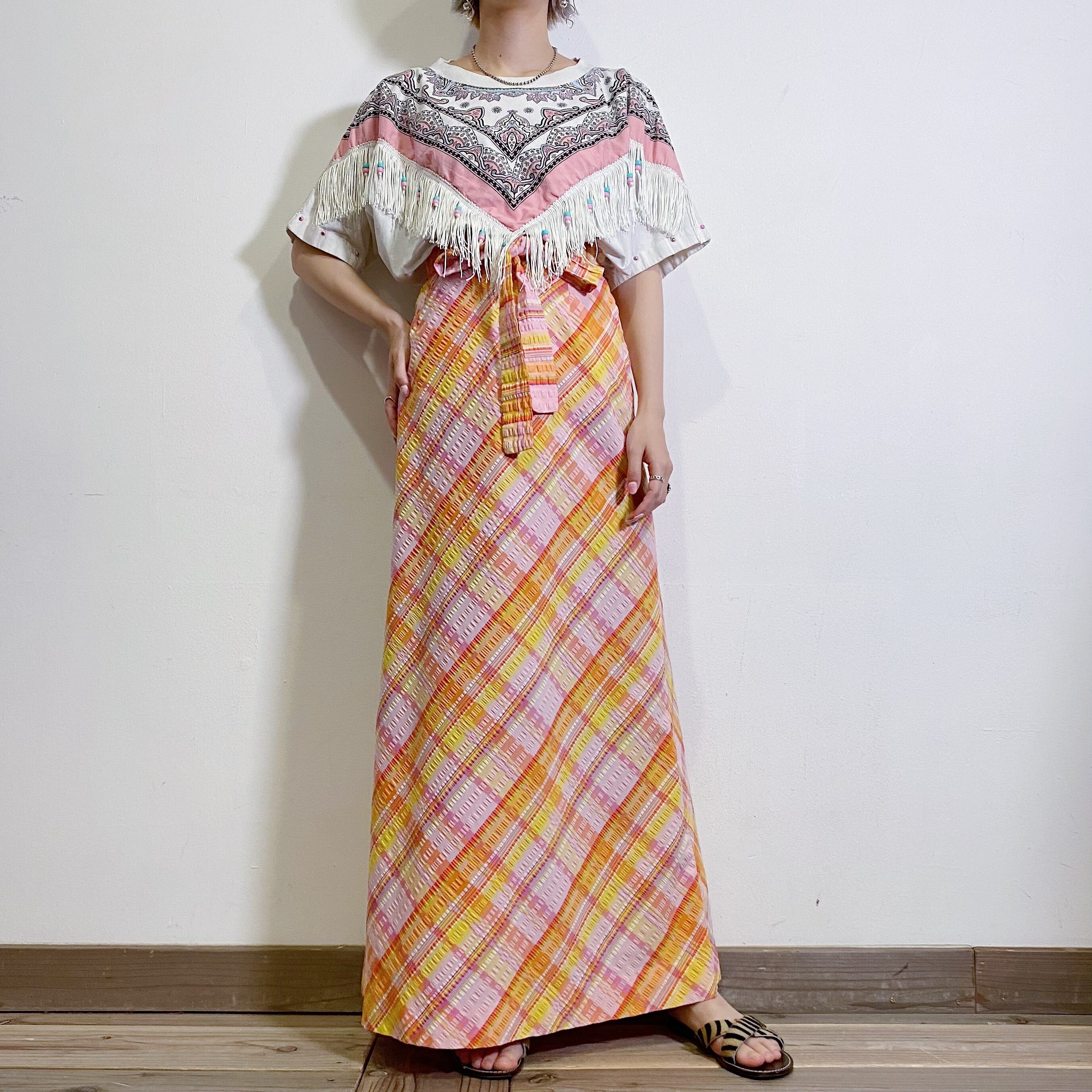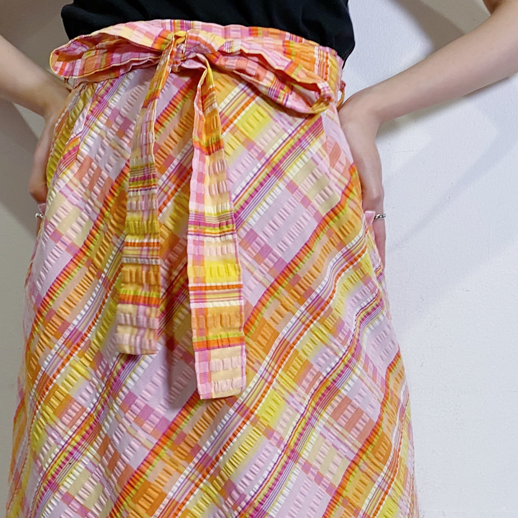 オレンジやイエローピンクの色合いのチェックがとってもハッピーで可愛い、70年代のロングスカートです。