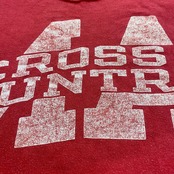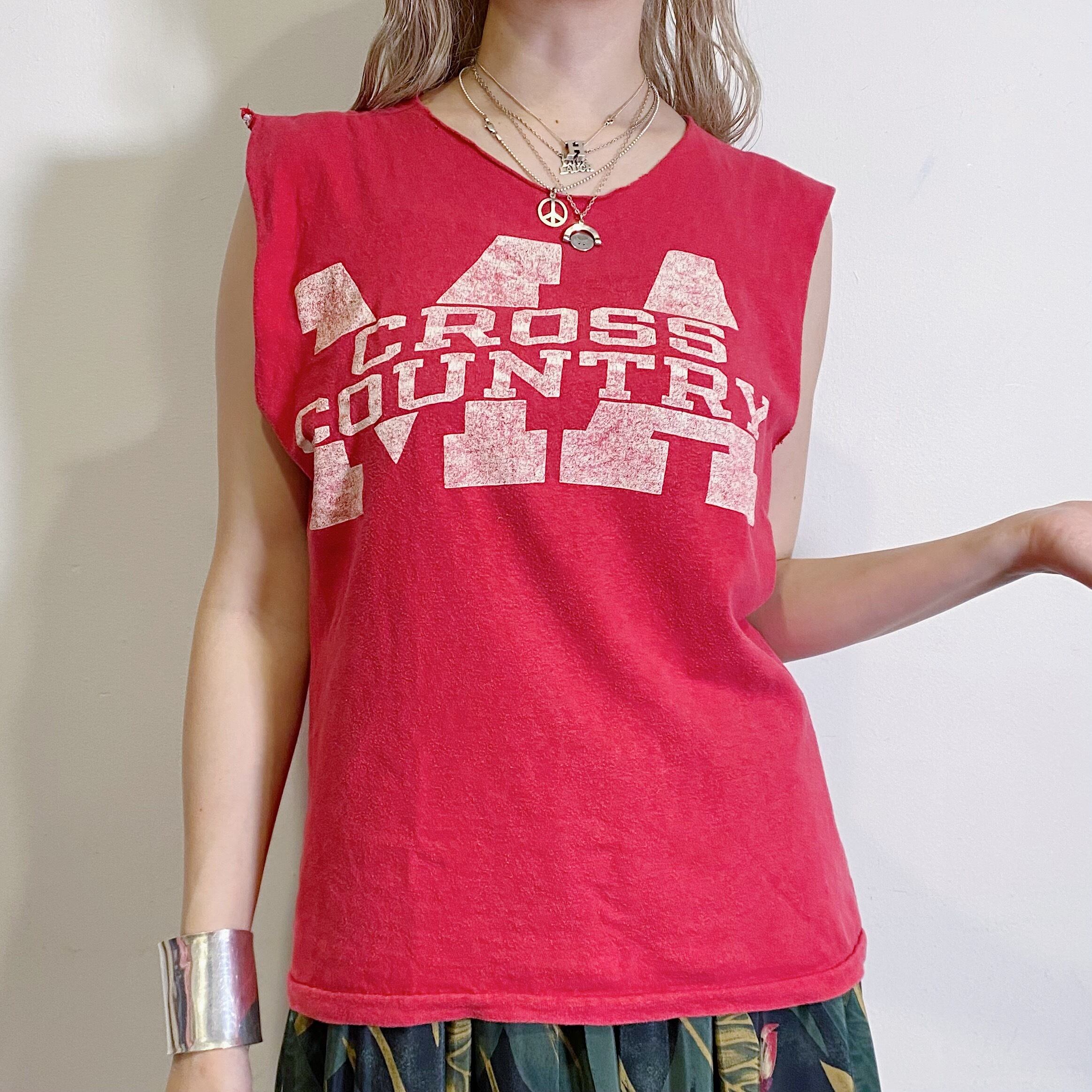 色褪せたレッドにホワイトのカレッジプリントが可愛いノースリーブトップスです。