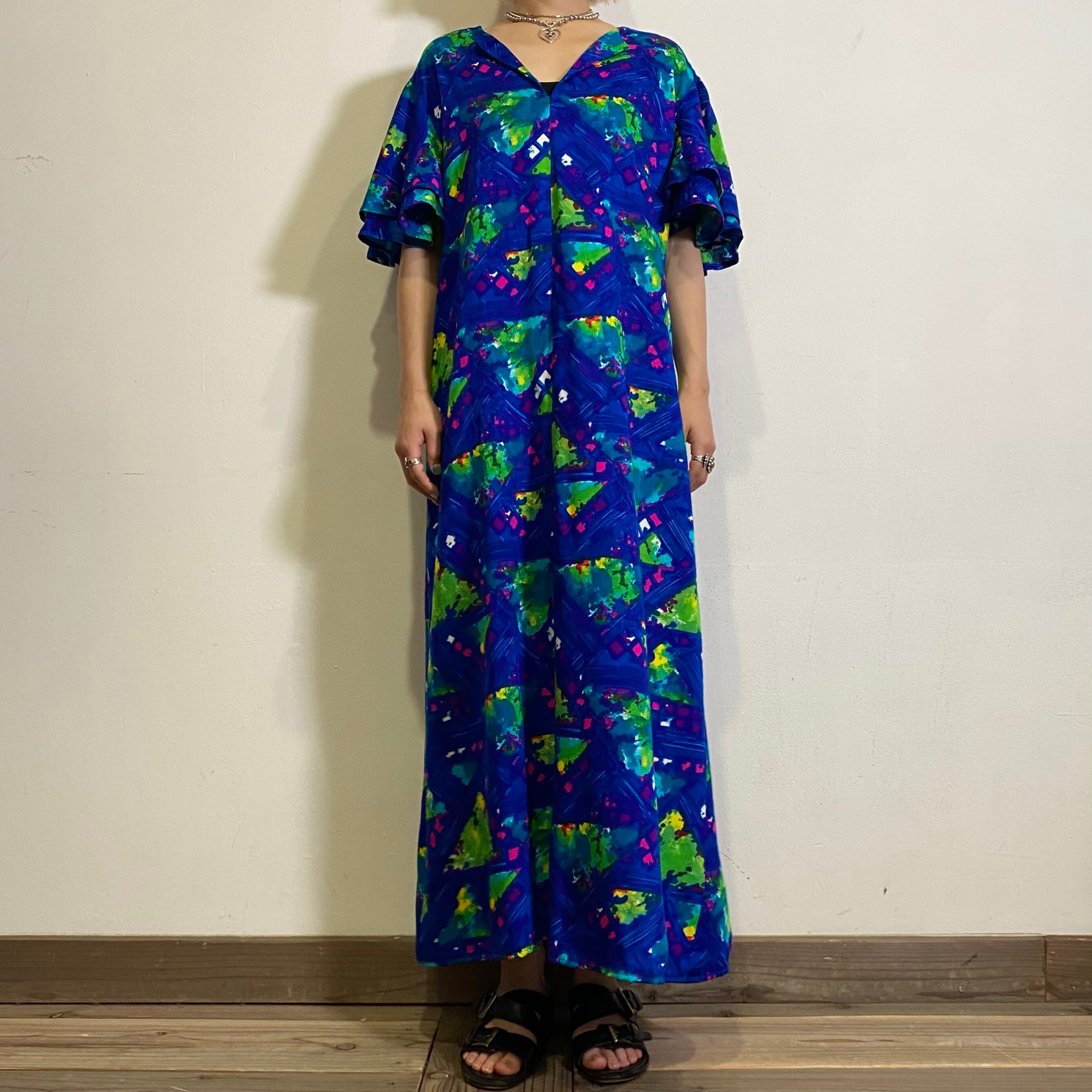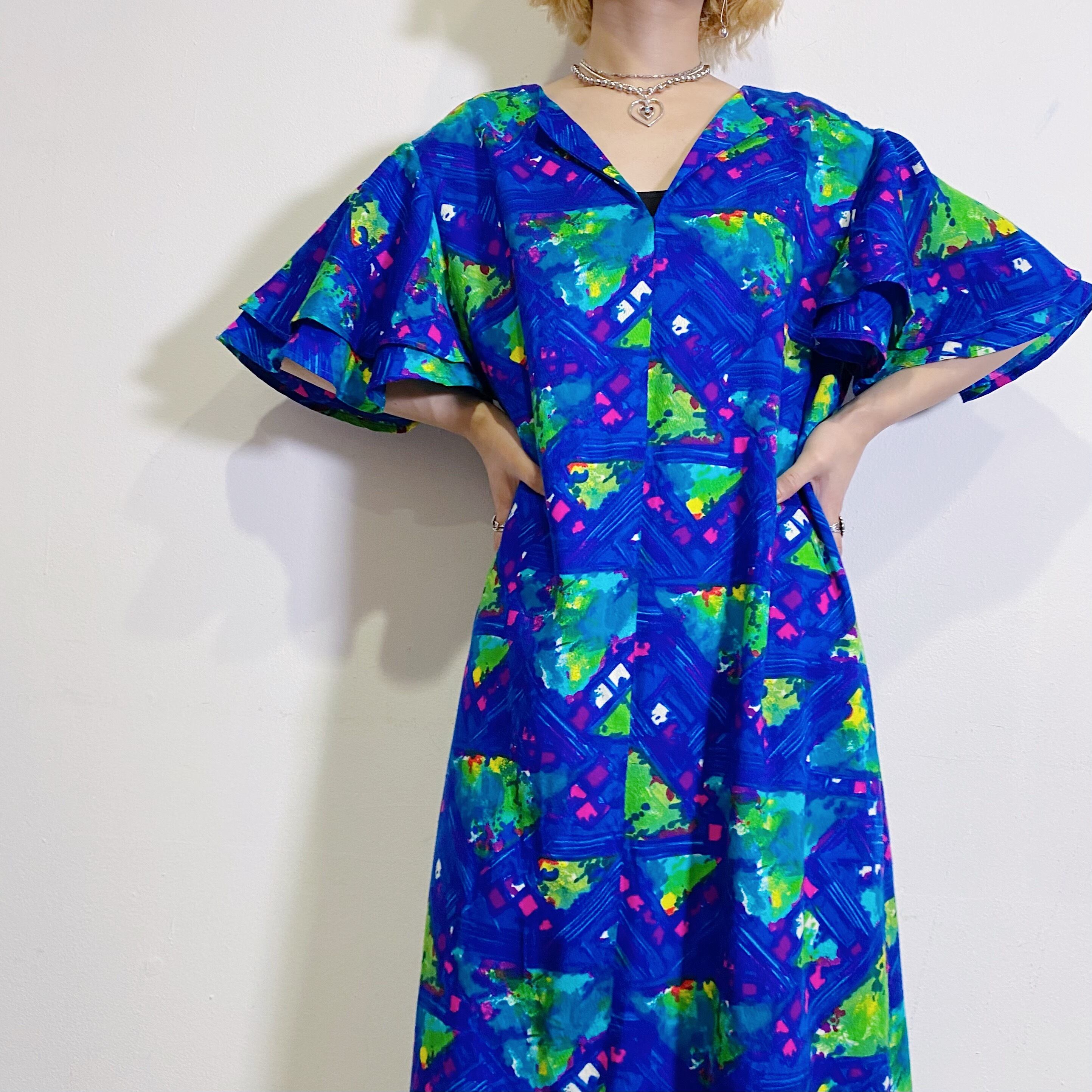 鮮やかなブルーやグリーンの色合いが可愛い、70年代のワンピースです。