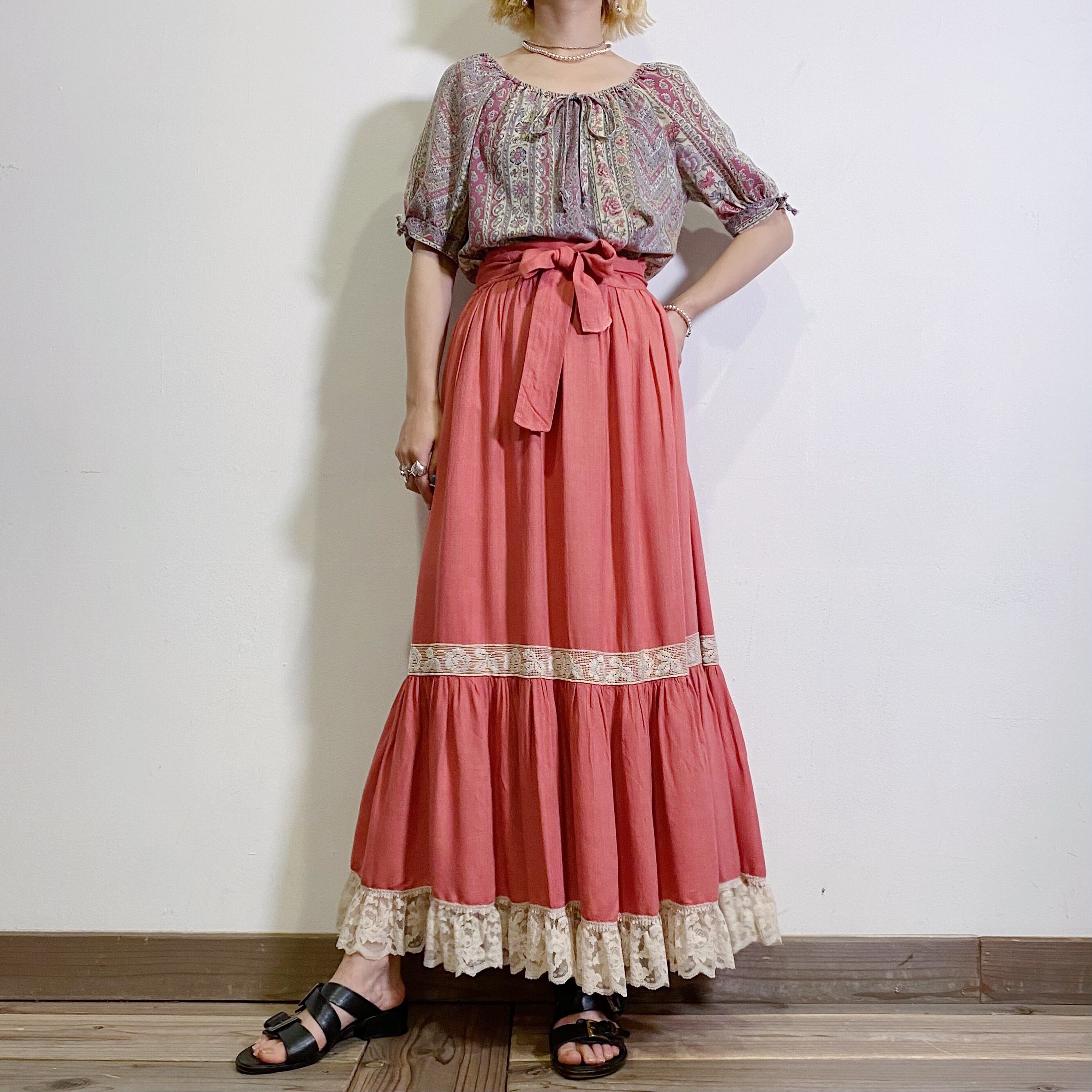 こっくりピンクに繊細なレースが可愛い、60〜70年代のフレアスカートです。