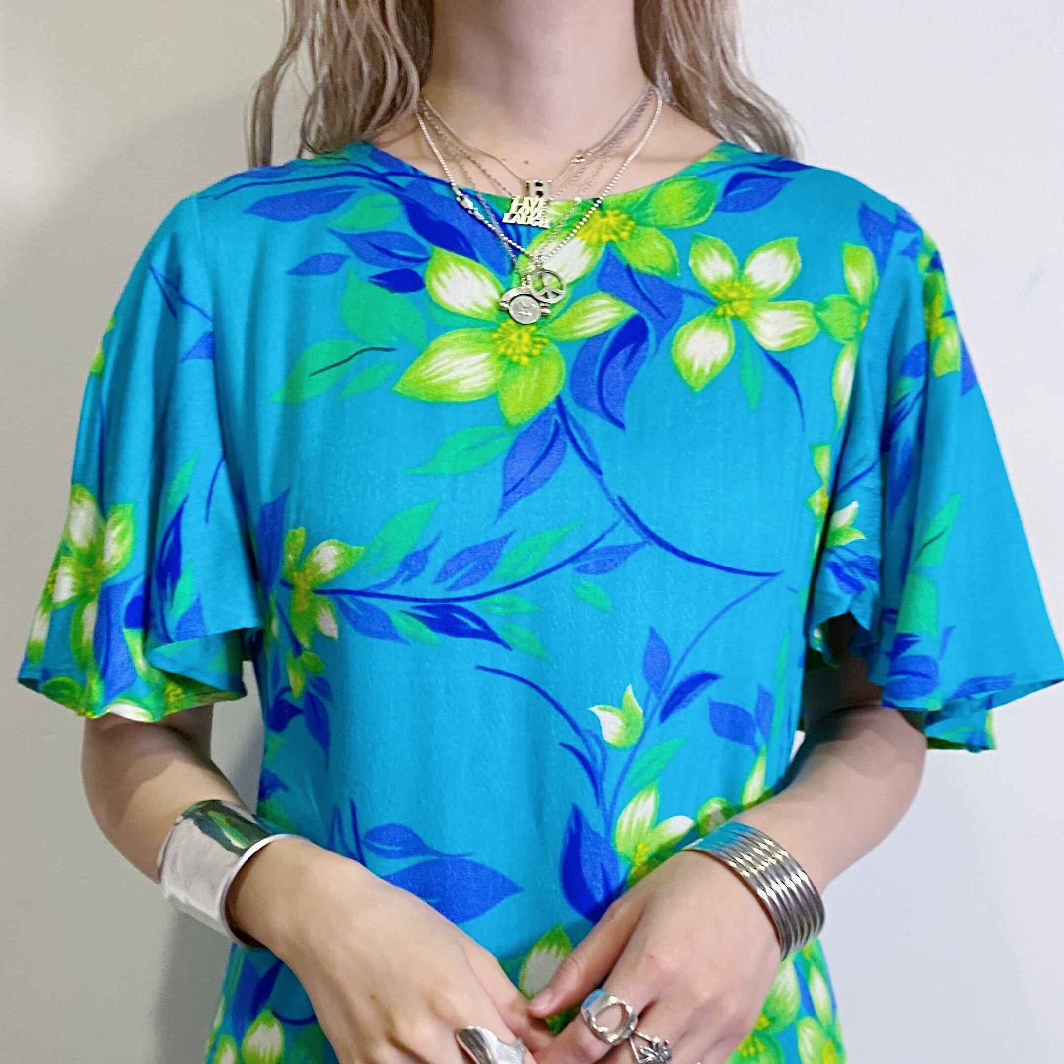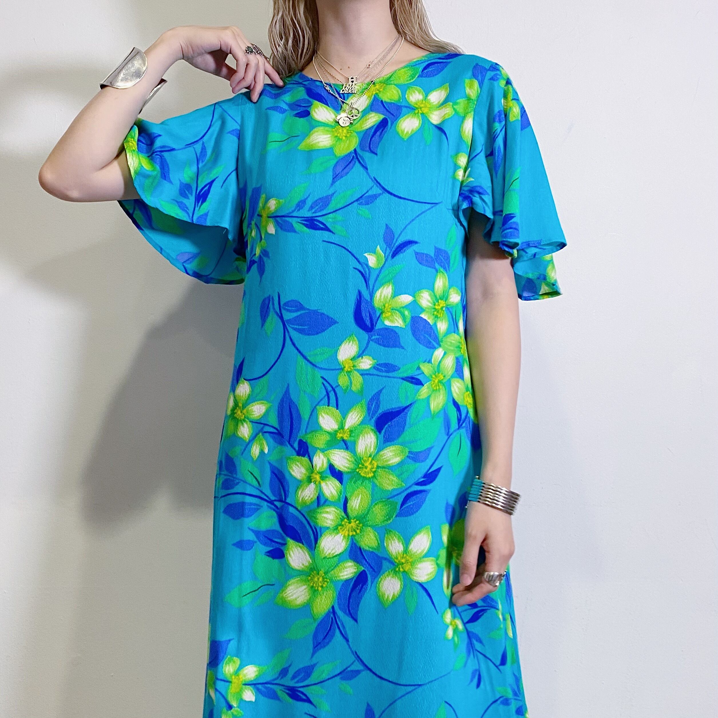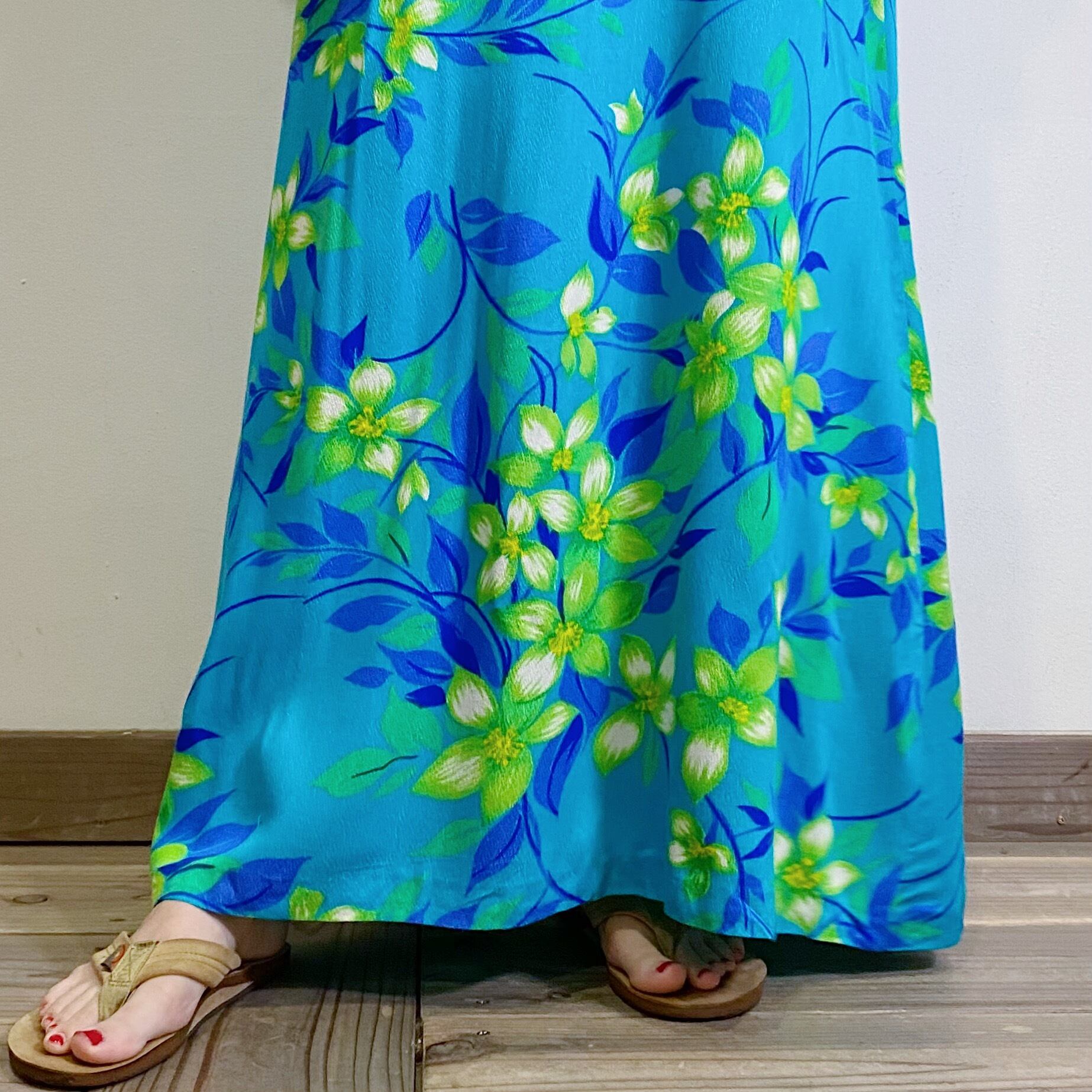 明るいブルーと黄緑の色合いが可愛い、70年代頃のハワイアンドレスです。