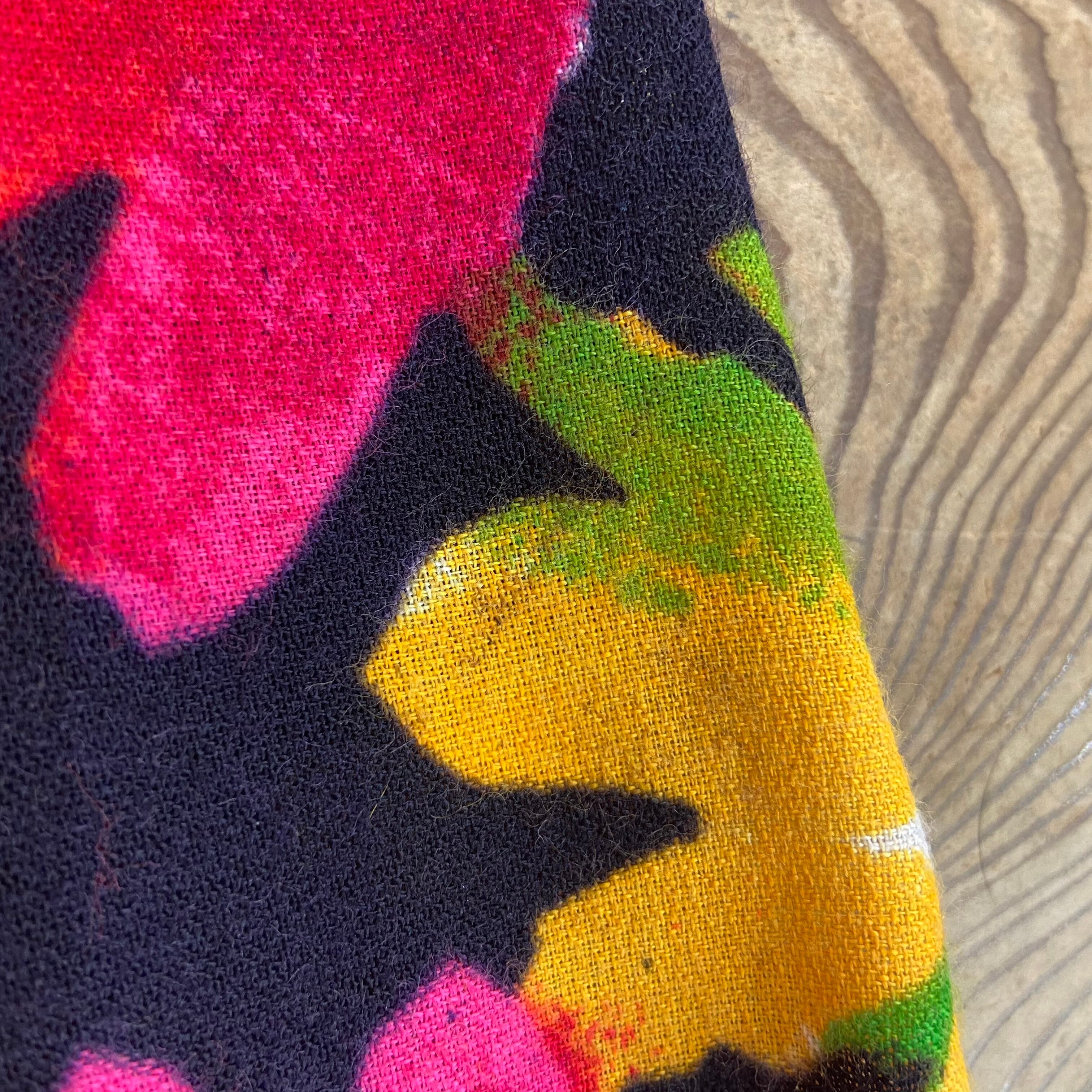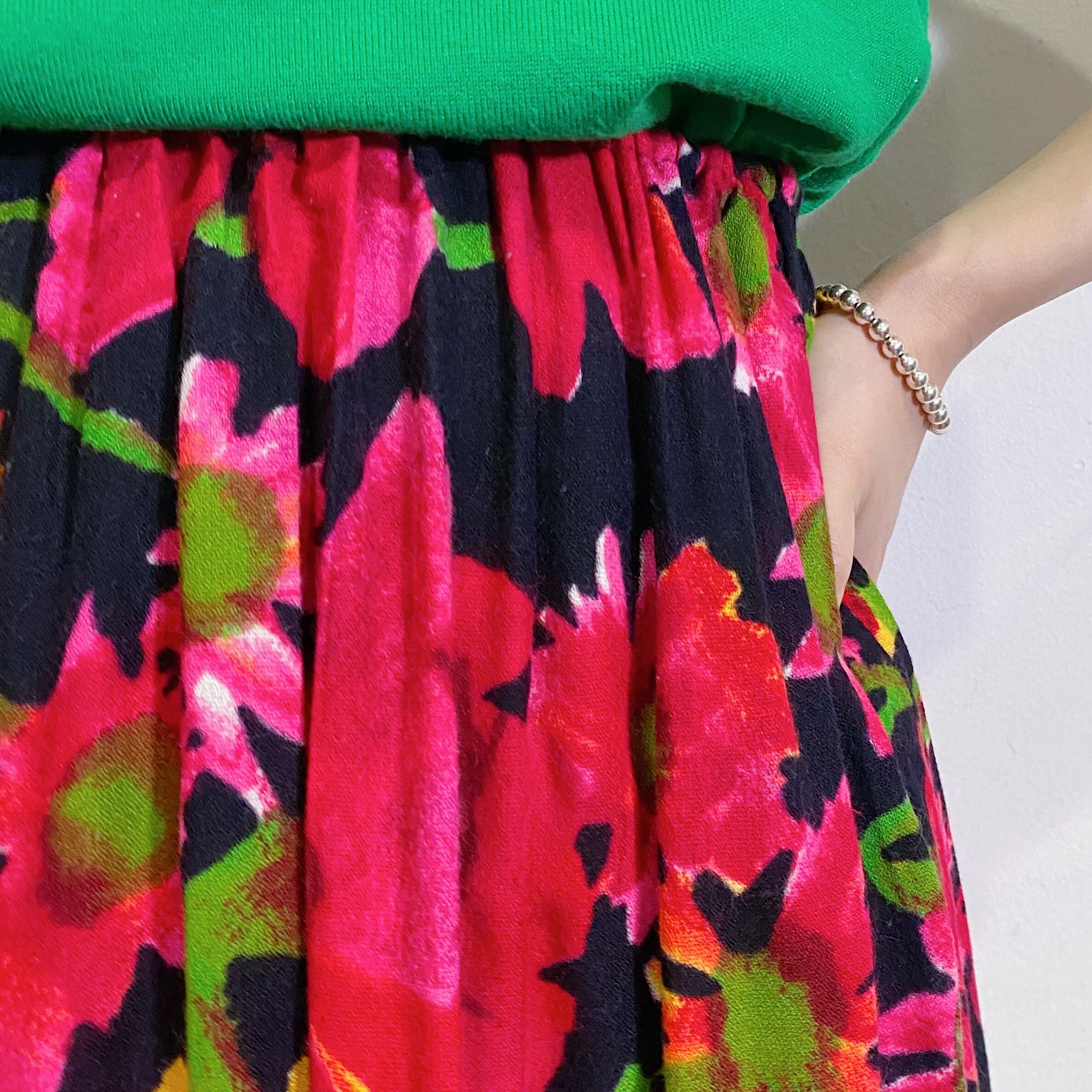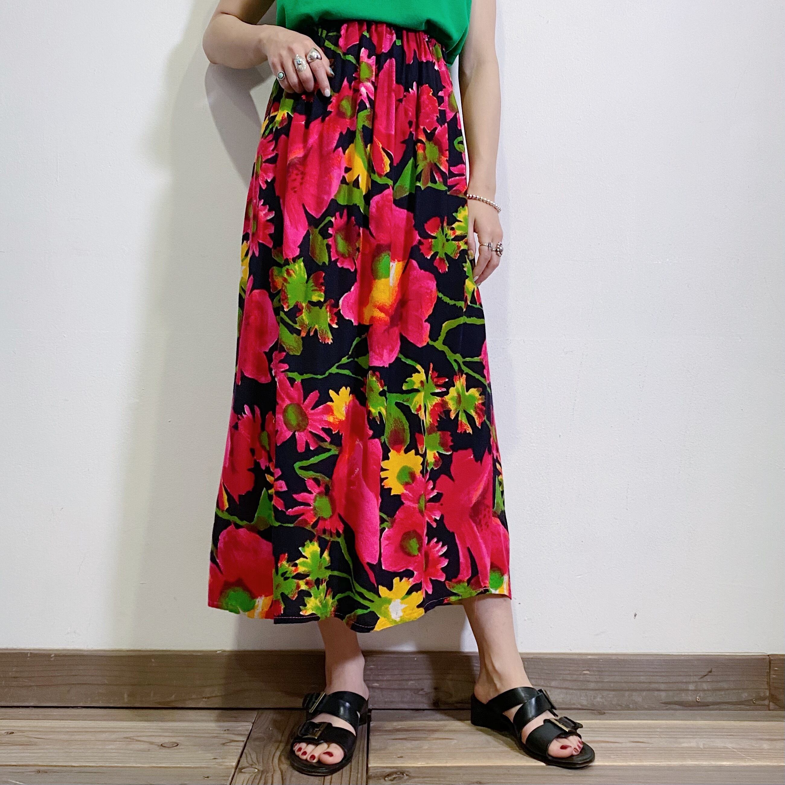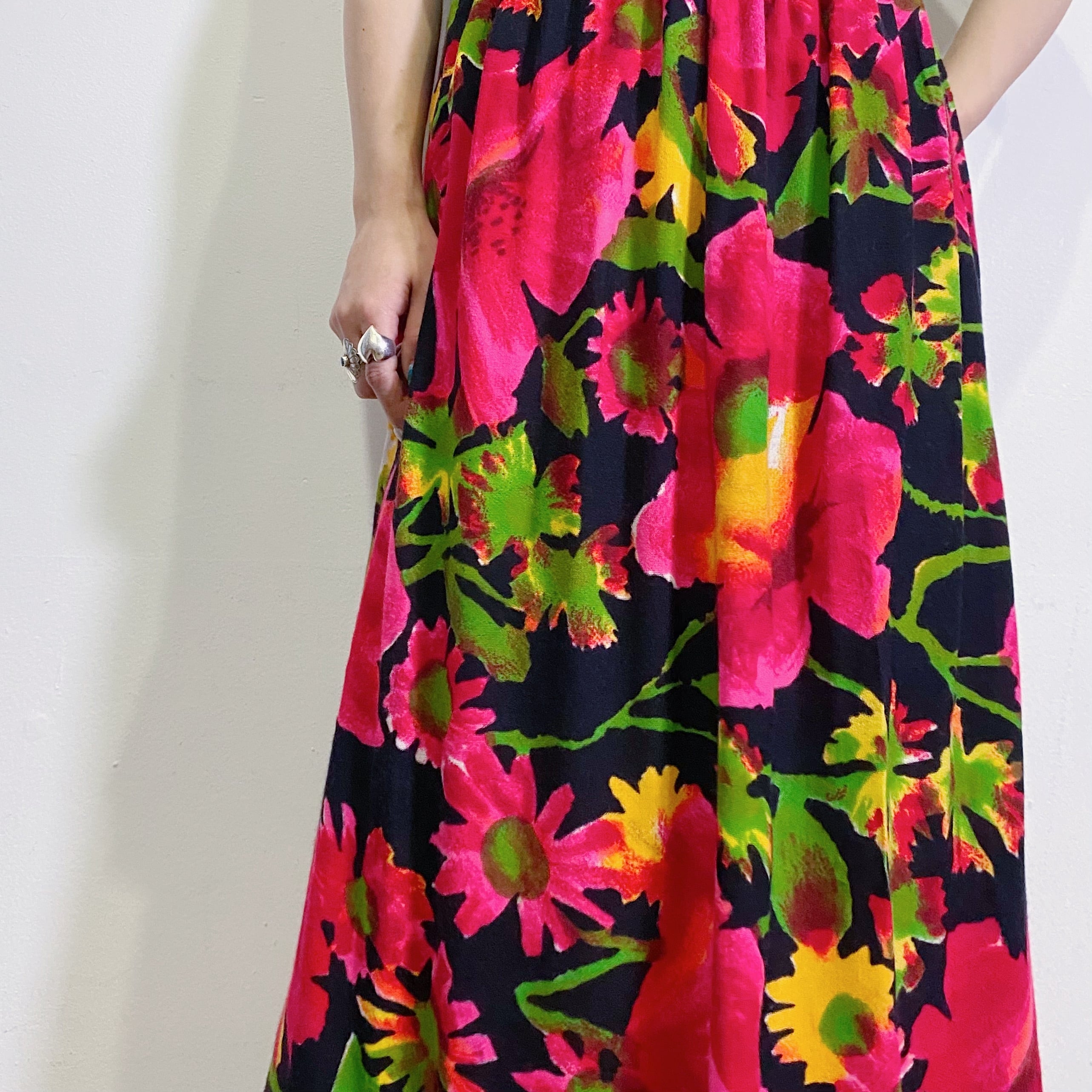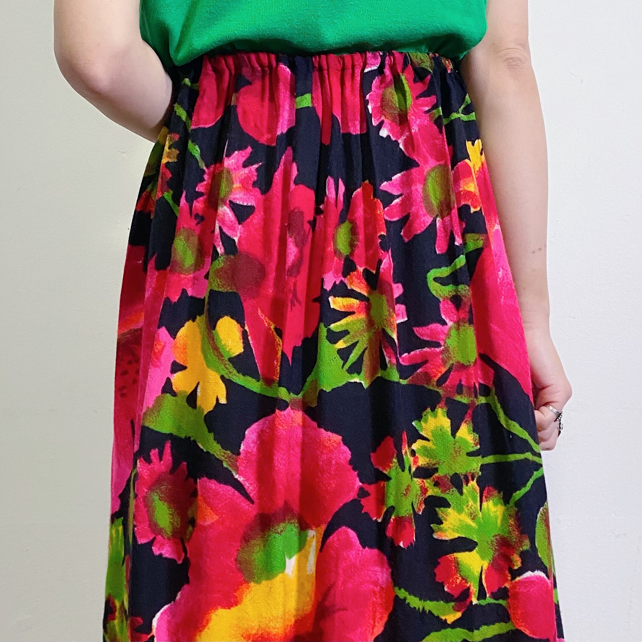 黒地に大きな花柄プリントが可愛い、60〜70年代のロングスカートです。
