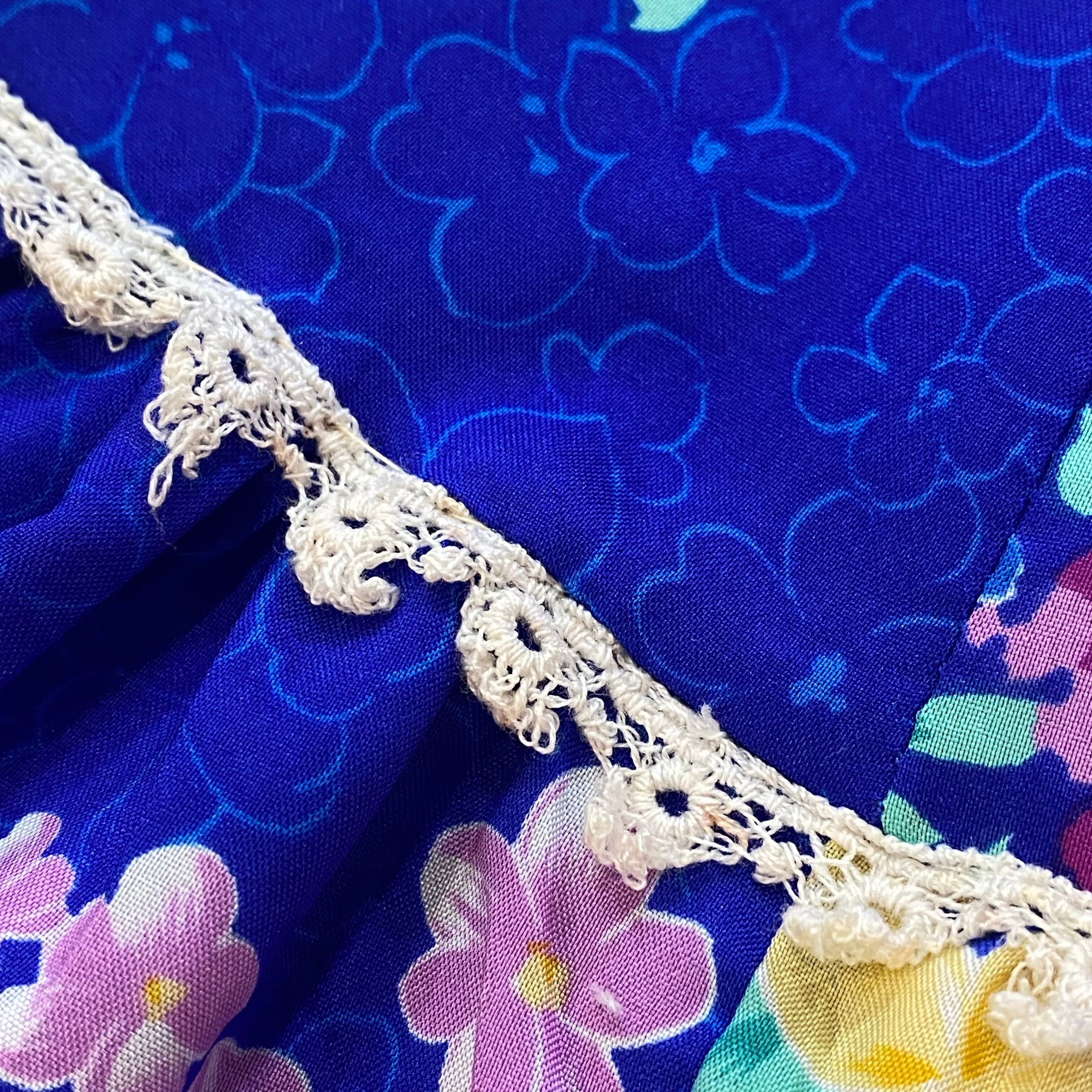 鮮やかなブルーベースの花柄が目を惹く、70年代のハワイアメイドのワンピースです。