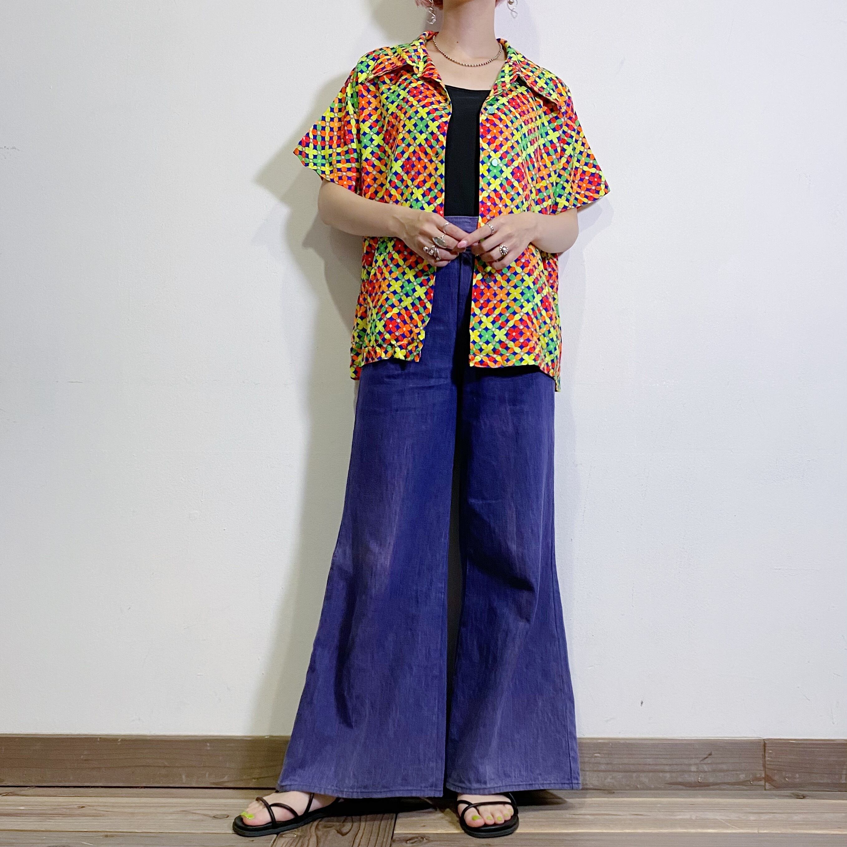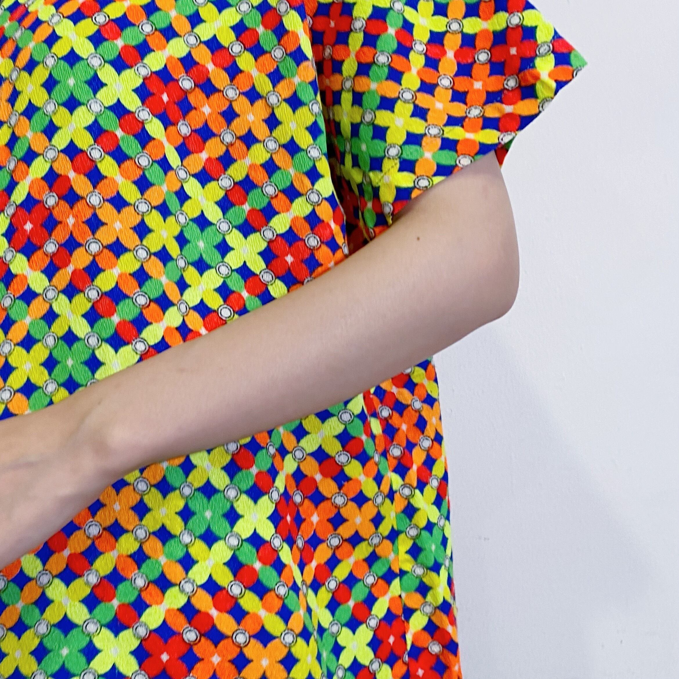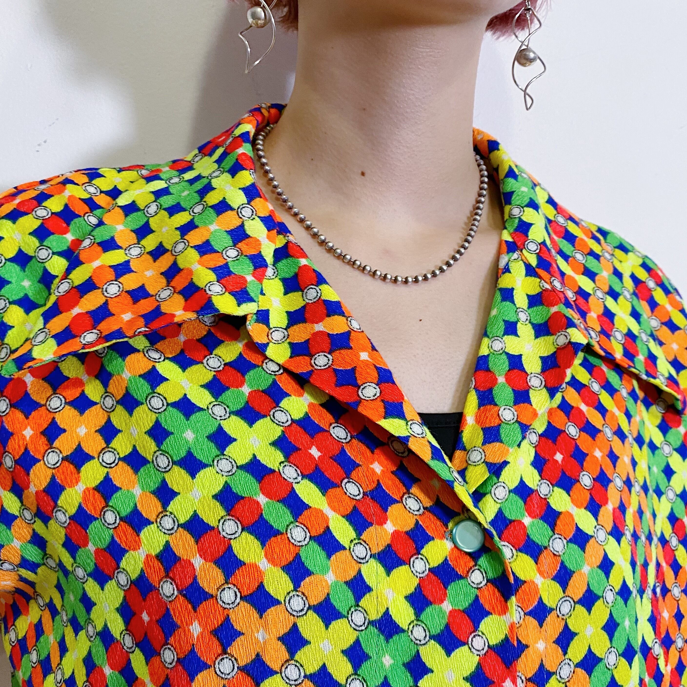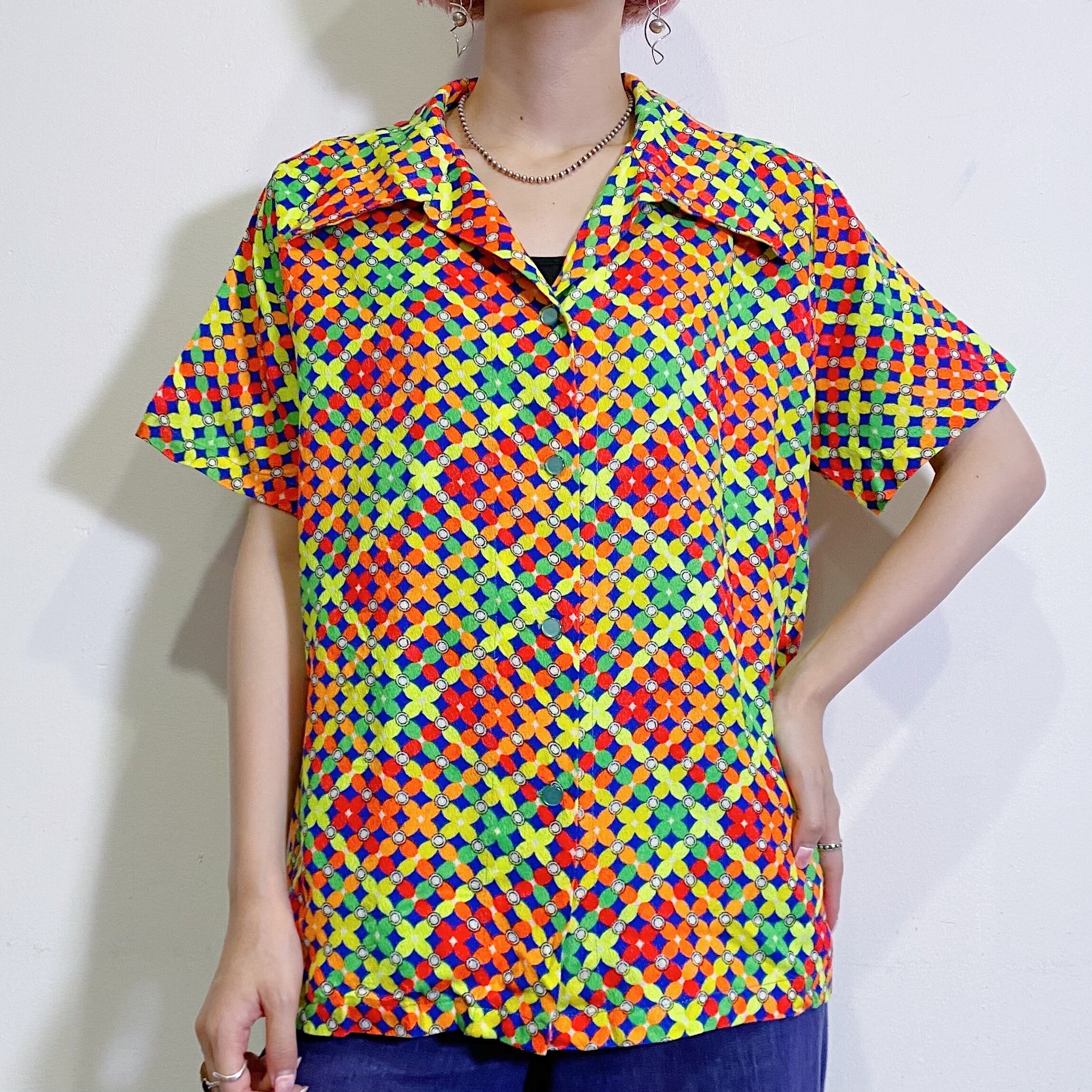 着るだけでハッピーになれそうなカラフルなテキスタイルが可愛い、70年代の開襟シャツです。