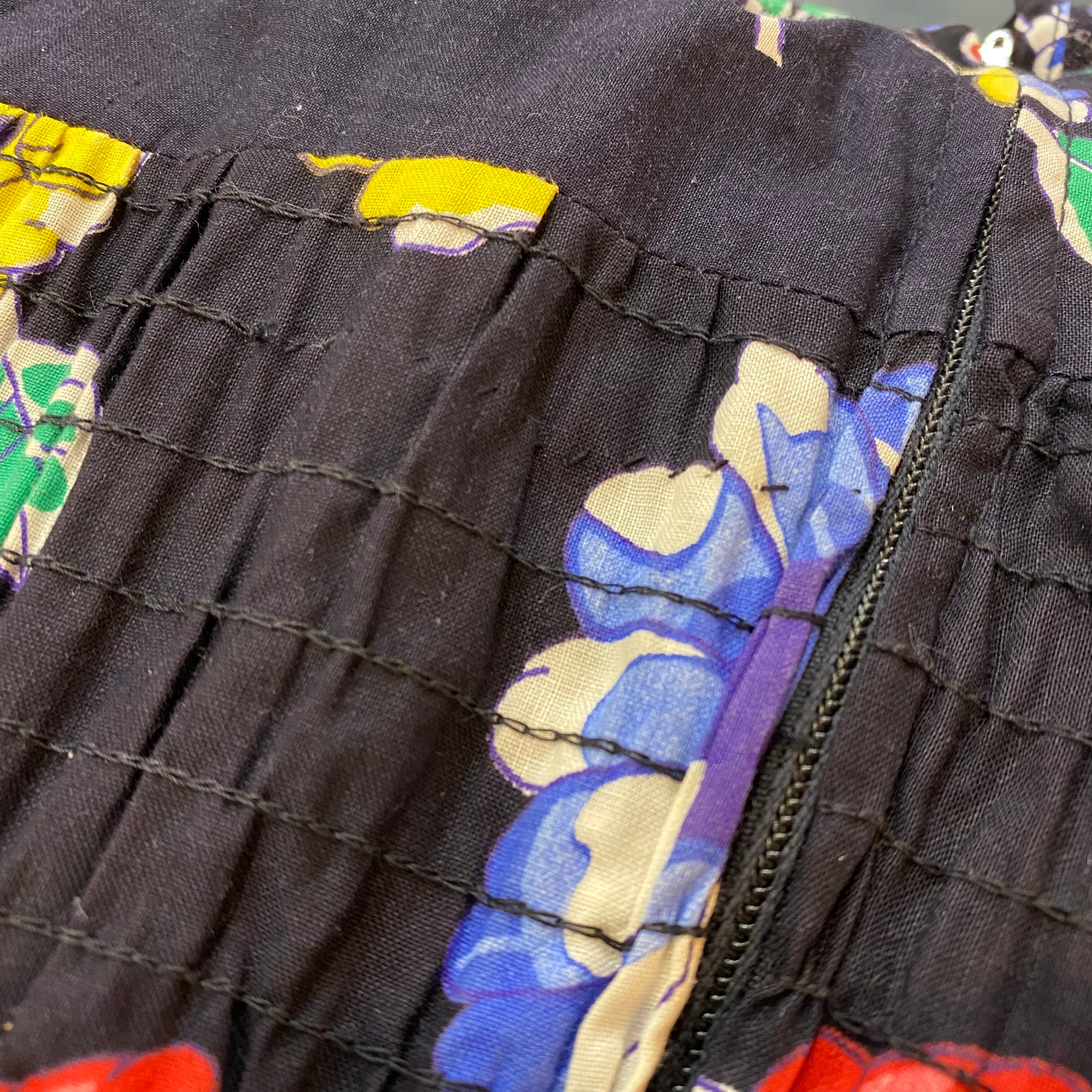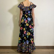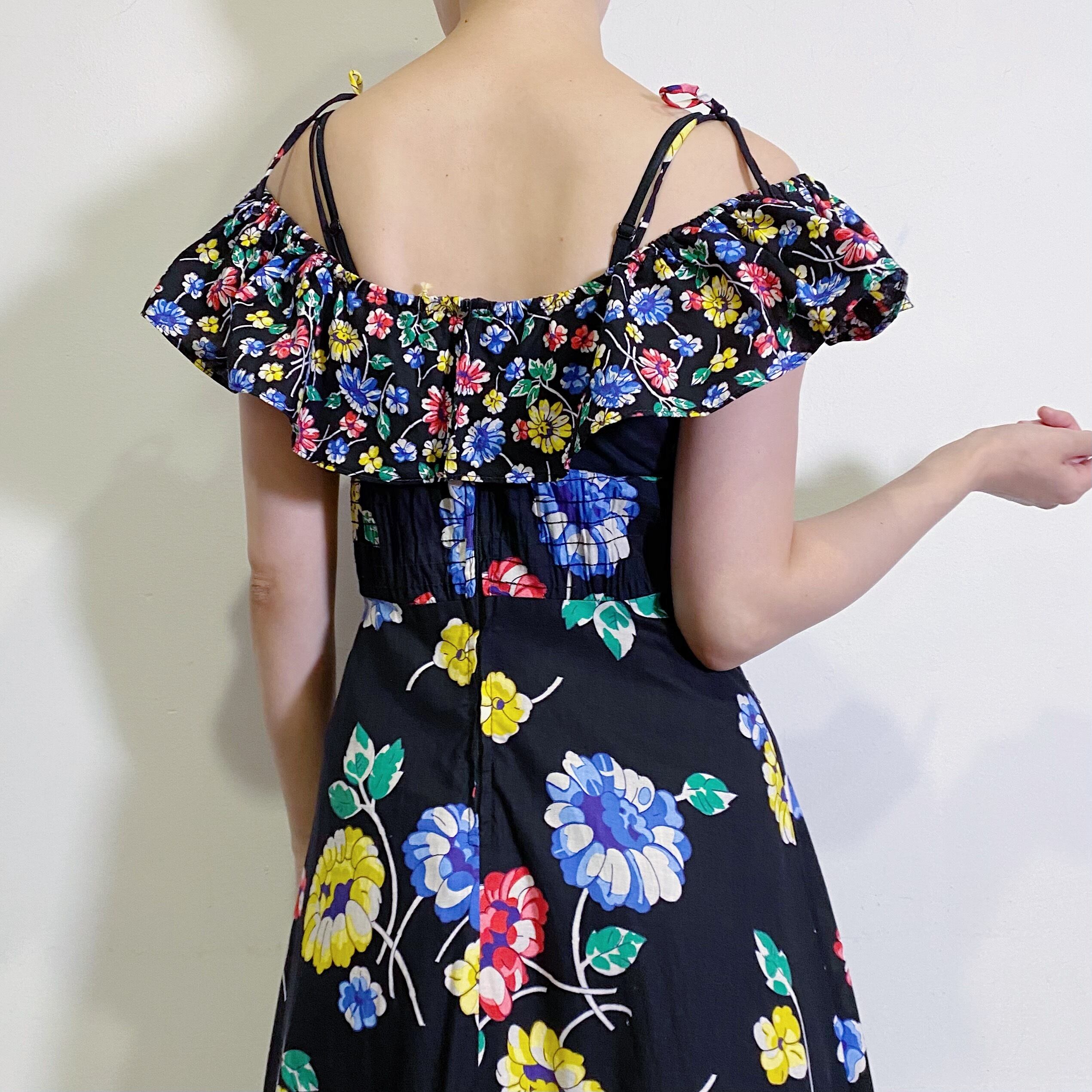 黒地にカラフルな花柄が可愛い、70年代のスペシャルなロングワンピースです。