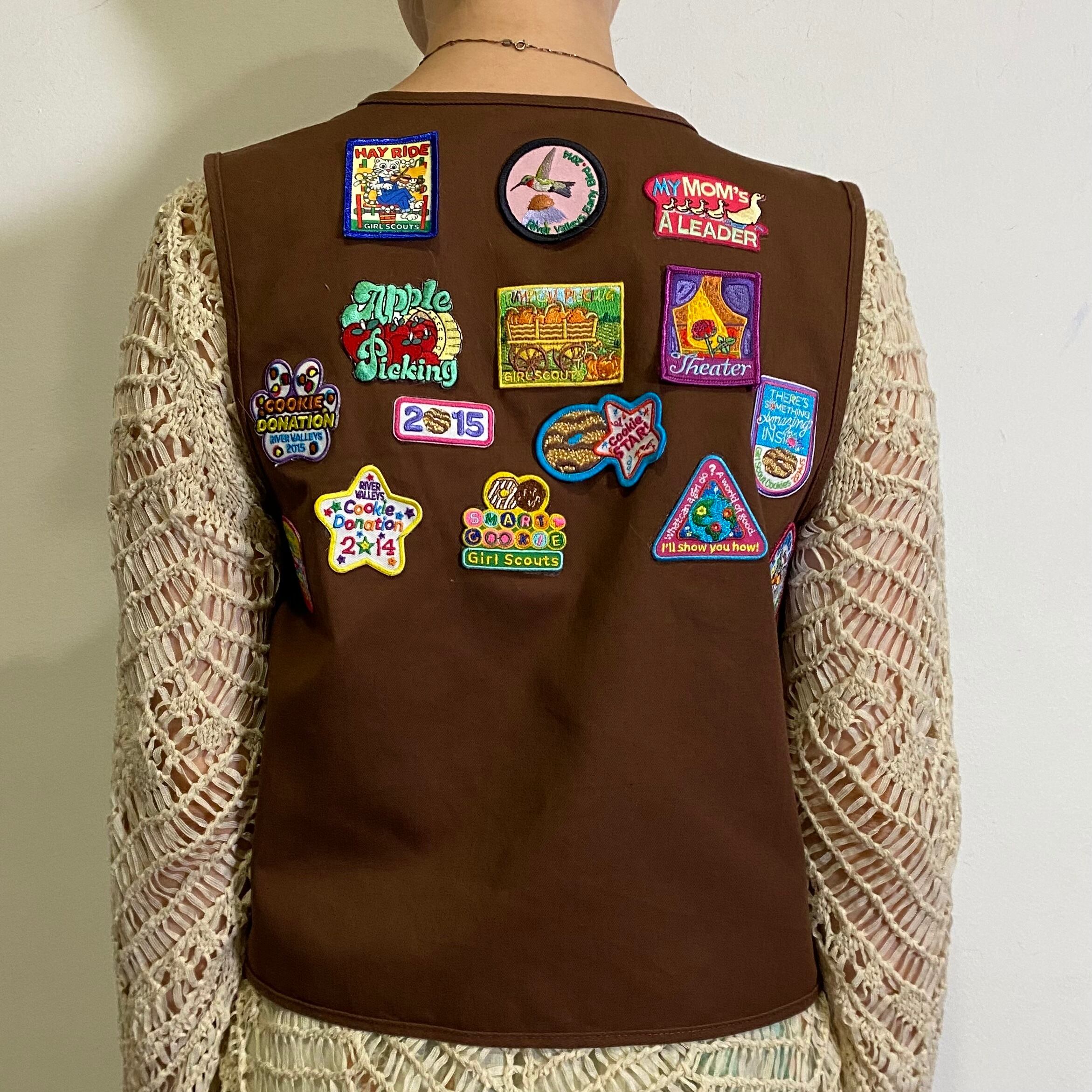 ポップでキュートなワッペンやピンバッジが並んだ、ガールスカウトのベストです。