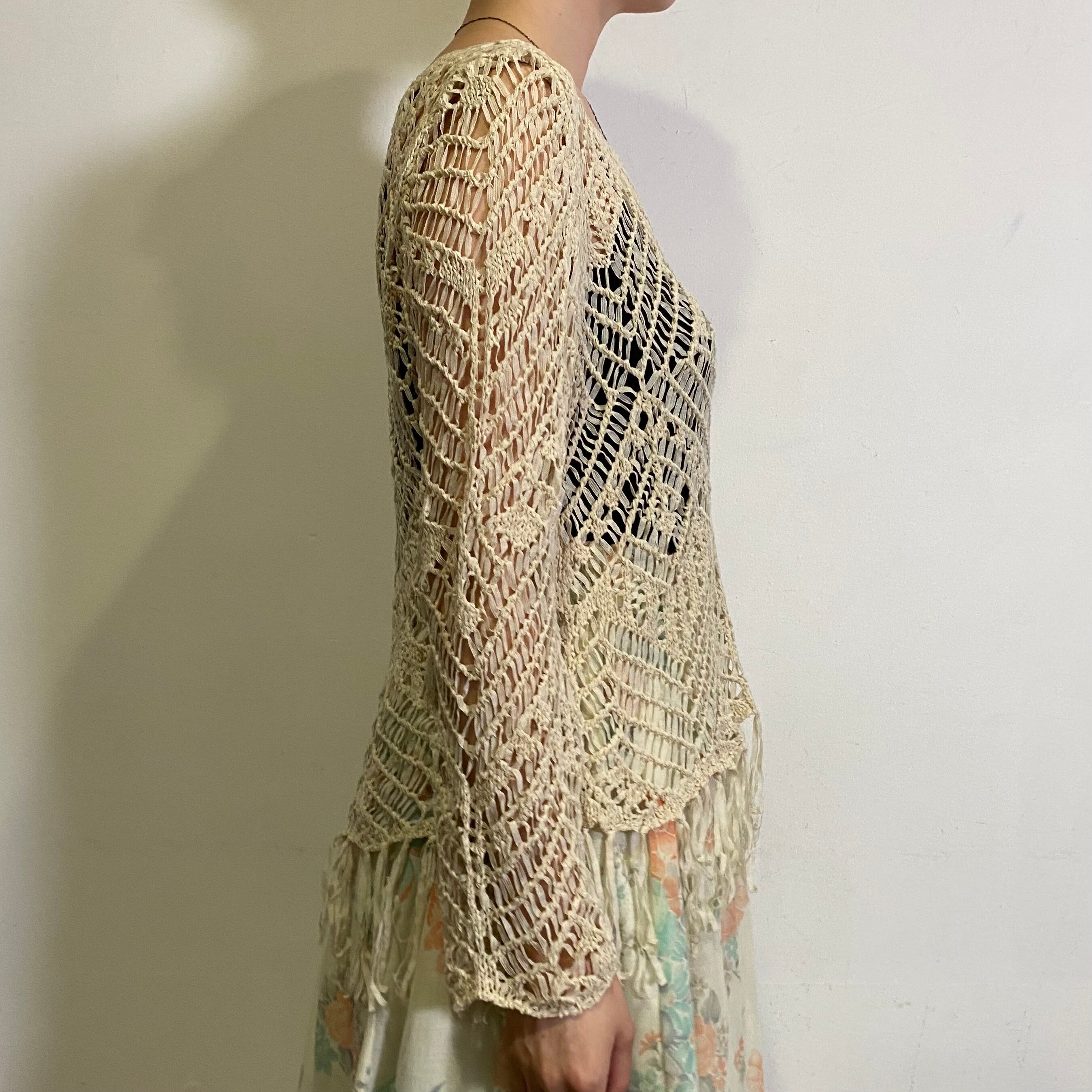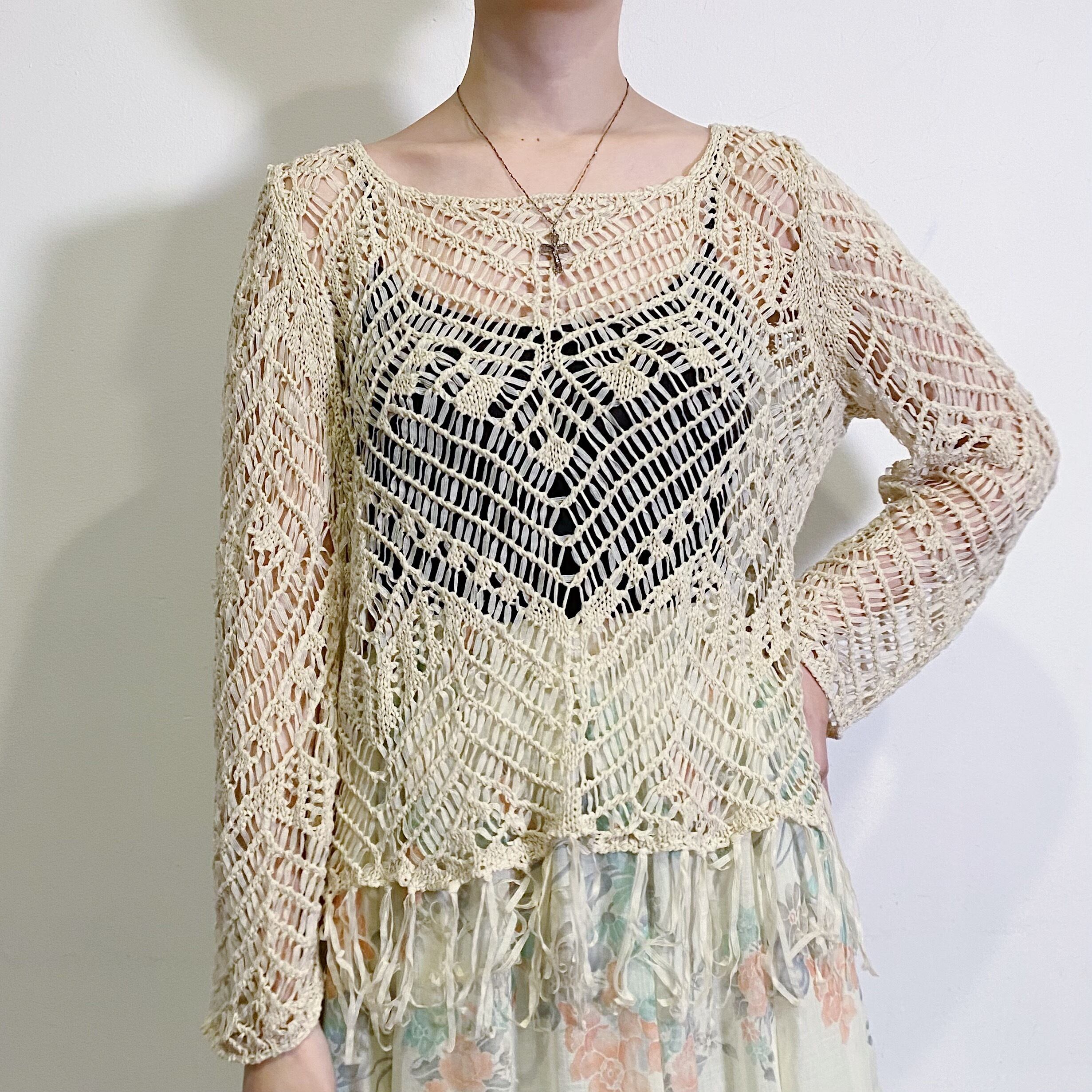 ざっくりとした編みに裾のフリンジが可愛い、クロシェニットトップスです。