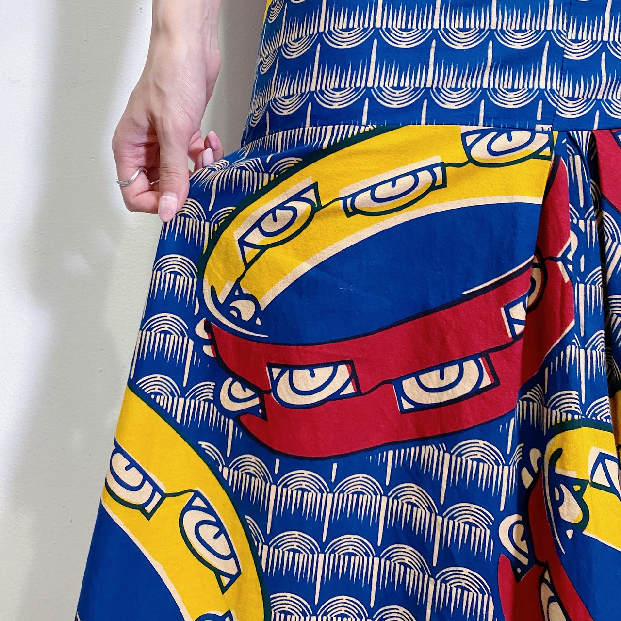 こちらは伝統的なろうけつ染めの手法でタンバリン柄が描かれており、他にはない唯一無二なテキスタイルがとってもキュート。