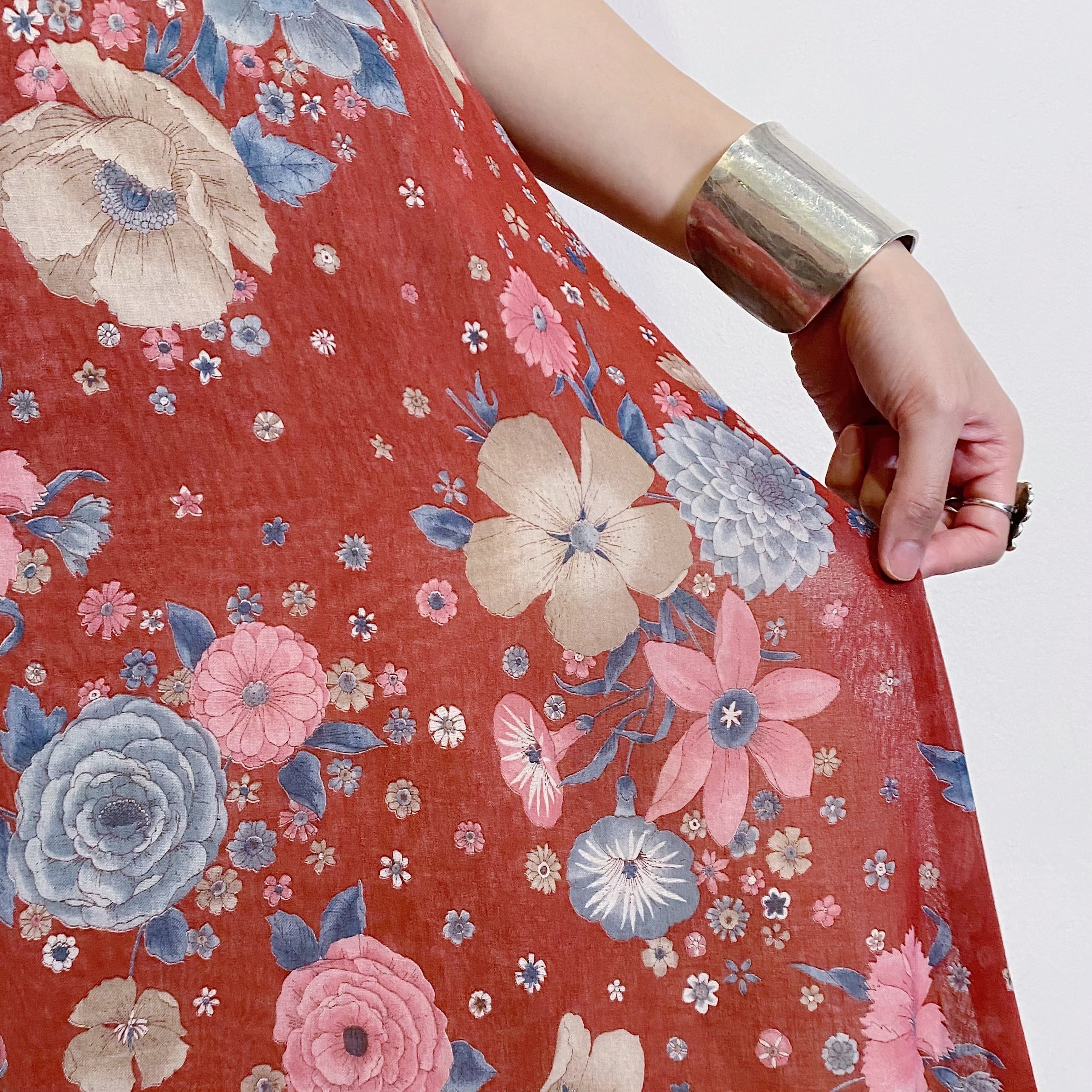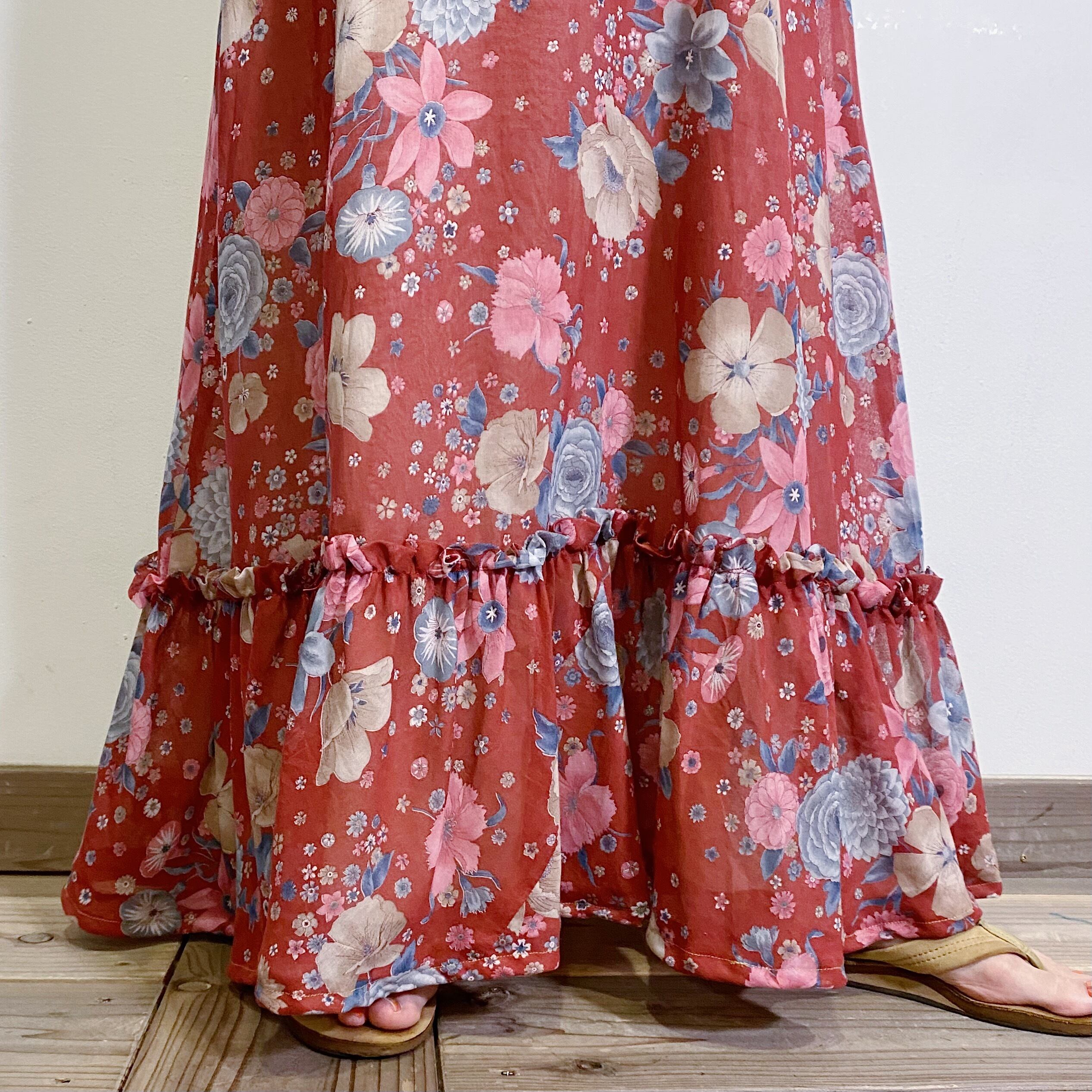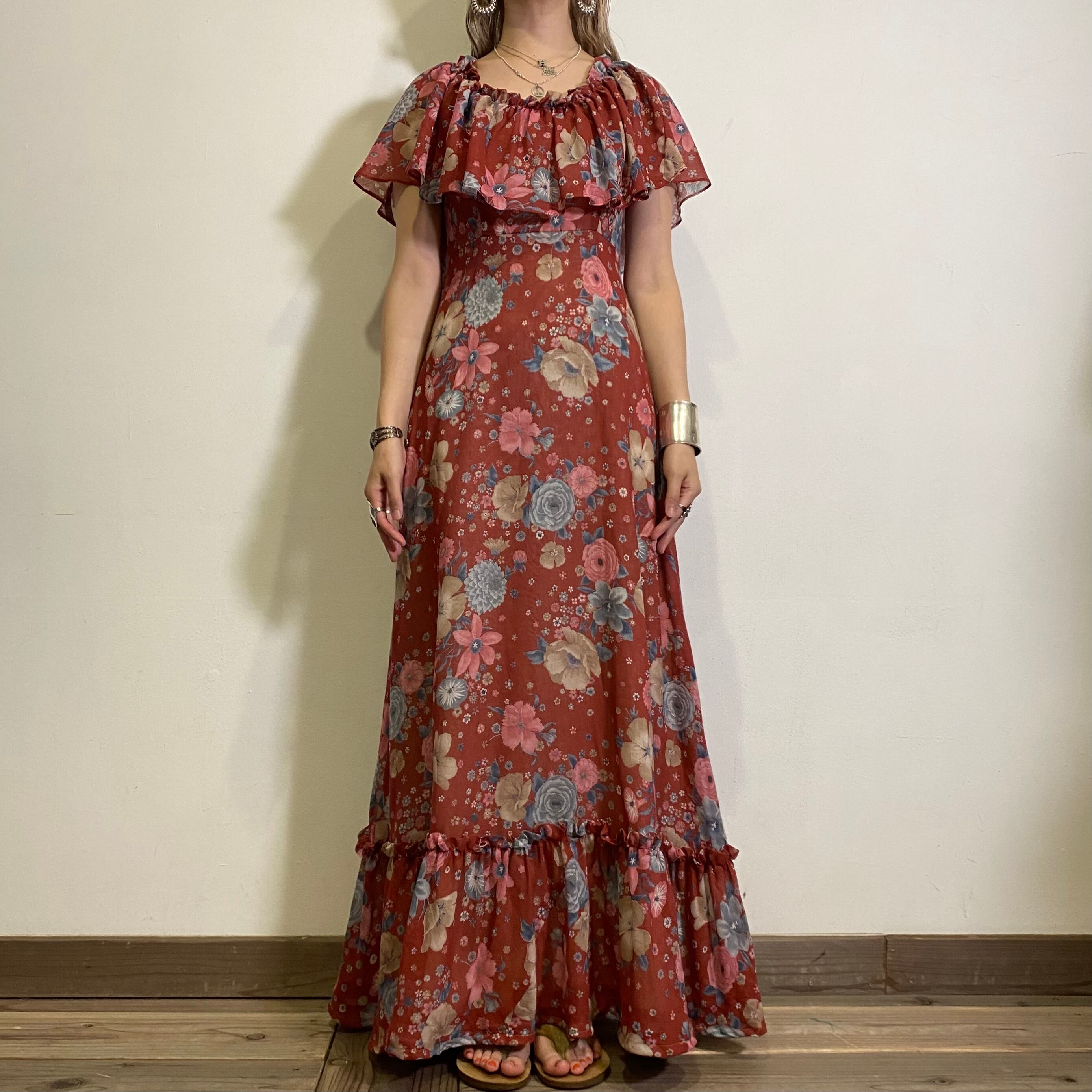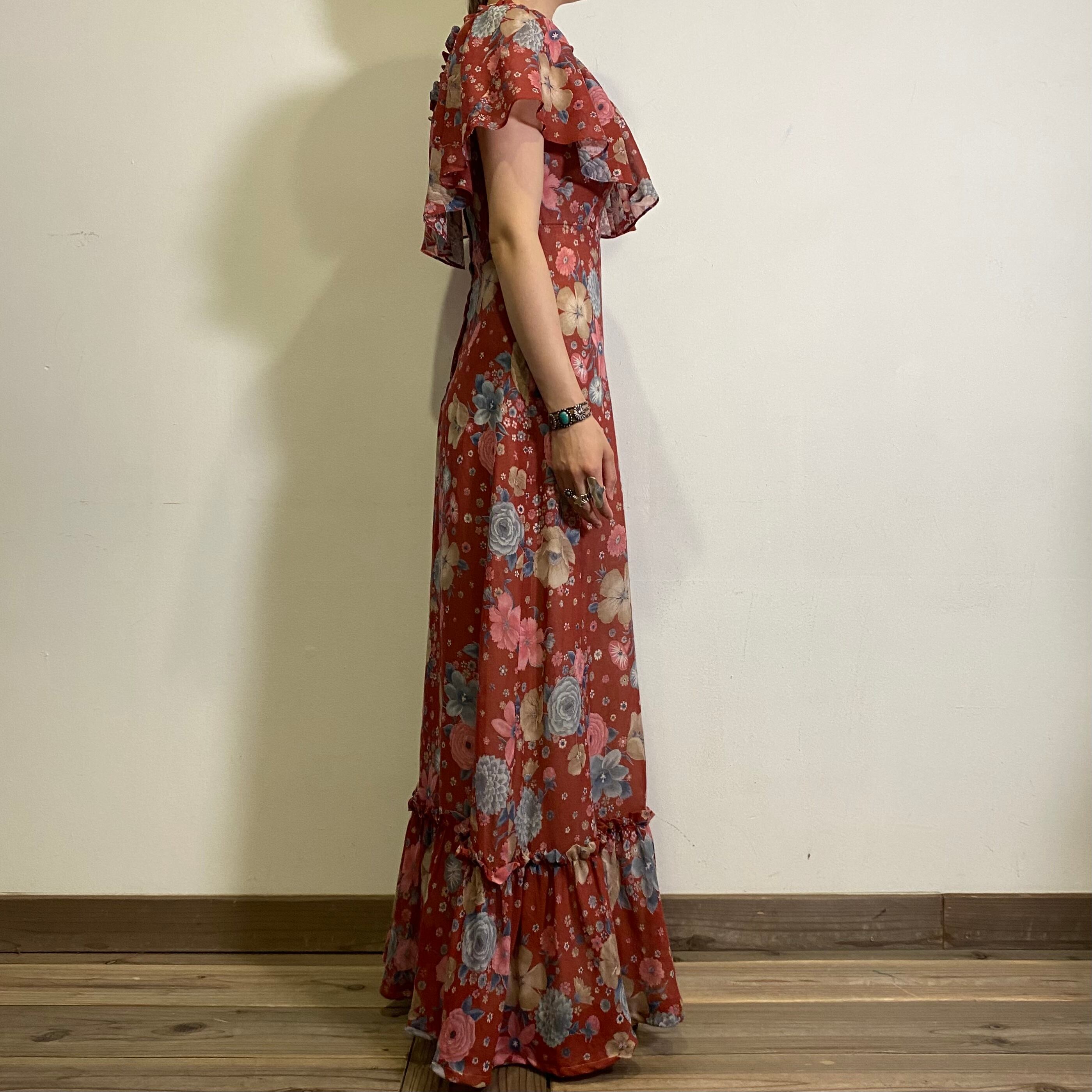 赤みのあるブラウンカラーにピンクやブルーの花柄が大人可愛い、70年代のロングワンピースです。
