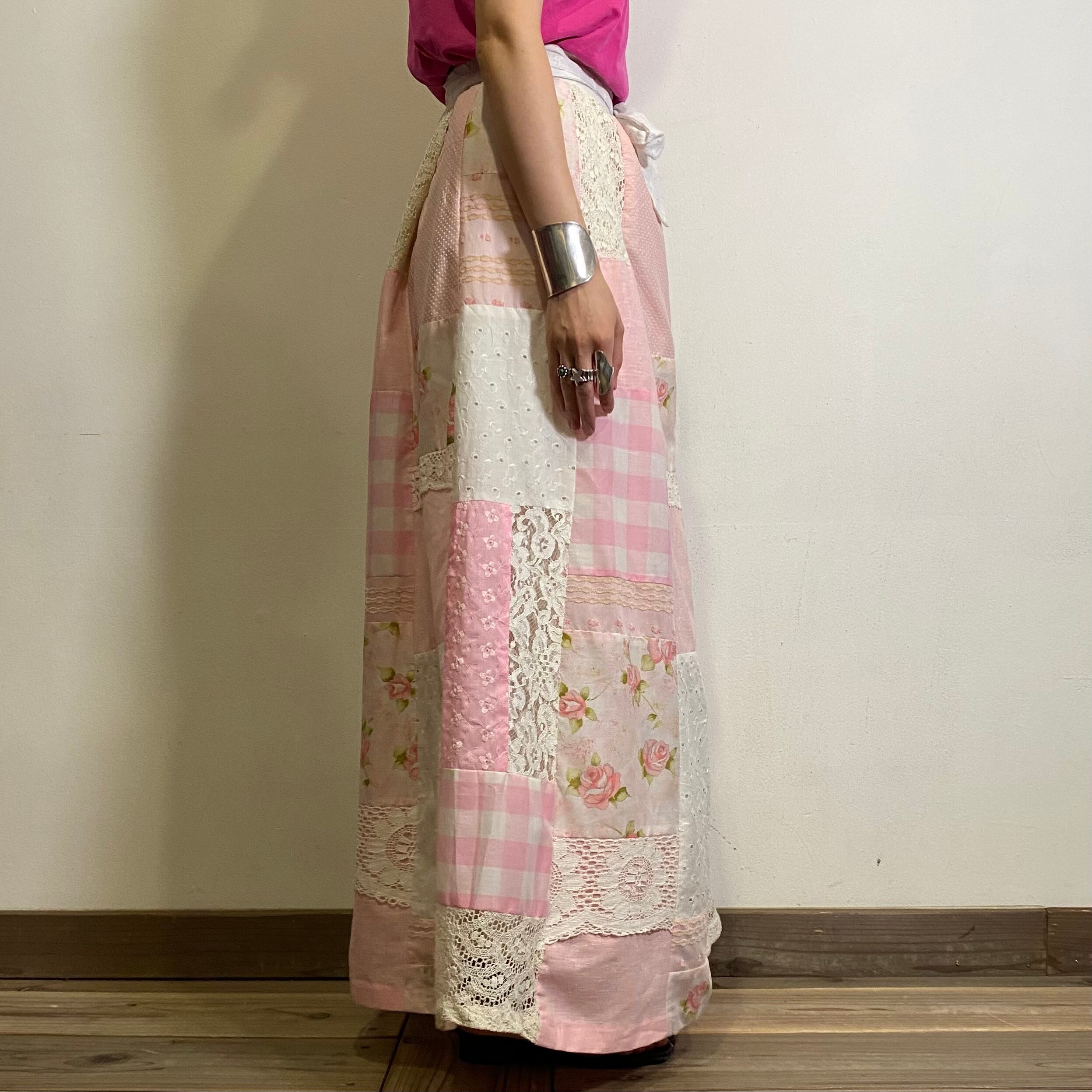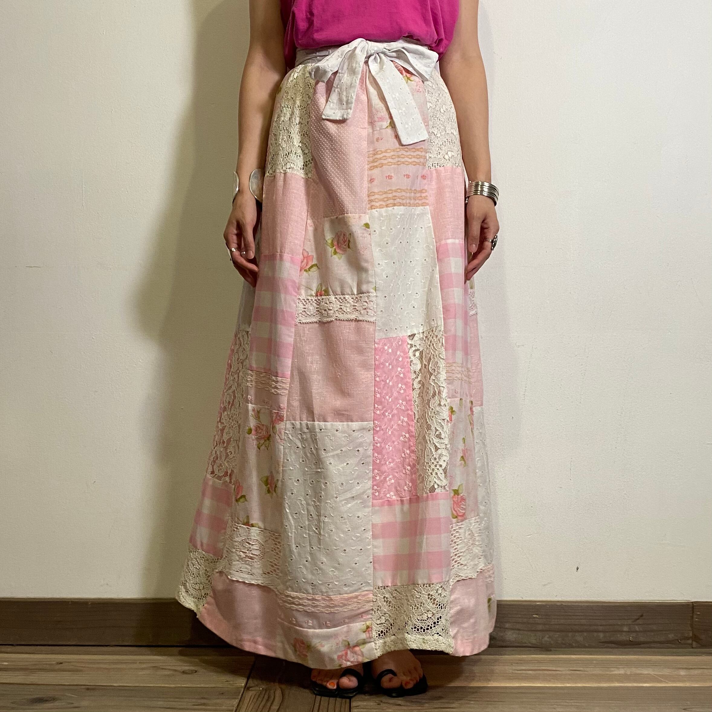 淡いピンクの色合いが可愛い、70年代のパッチワークスカートです。