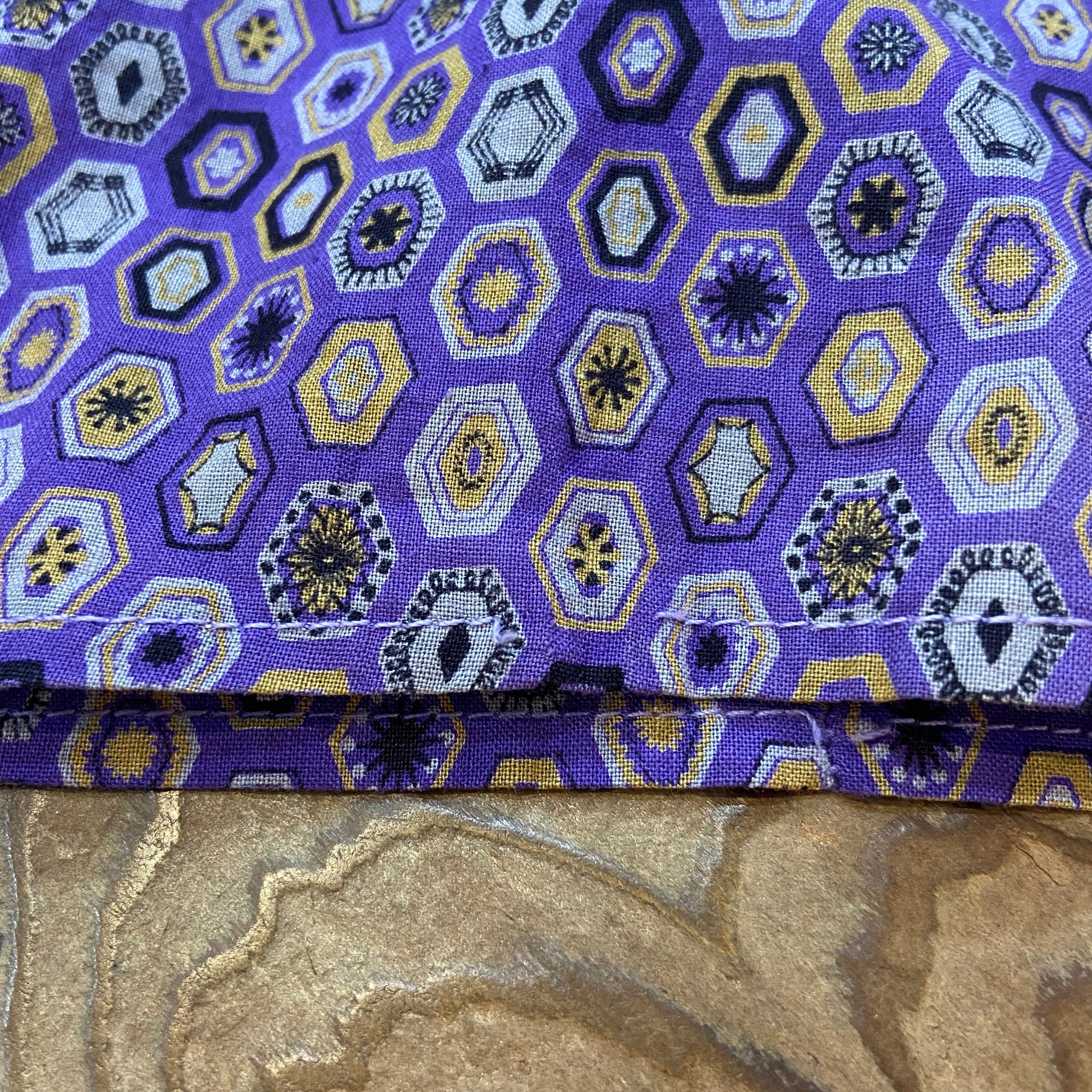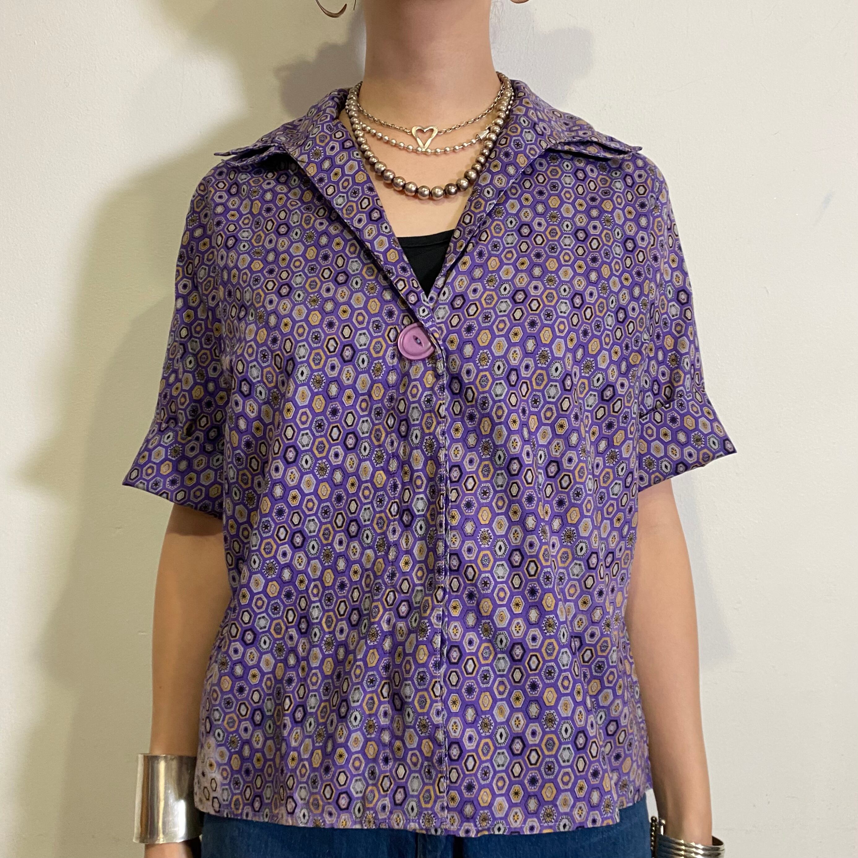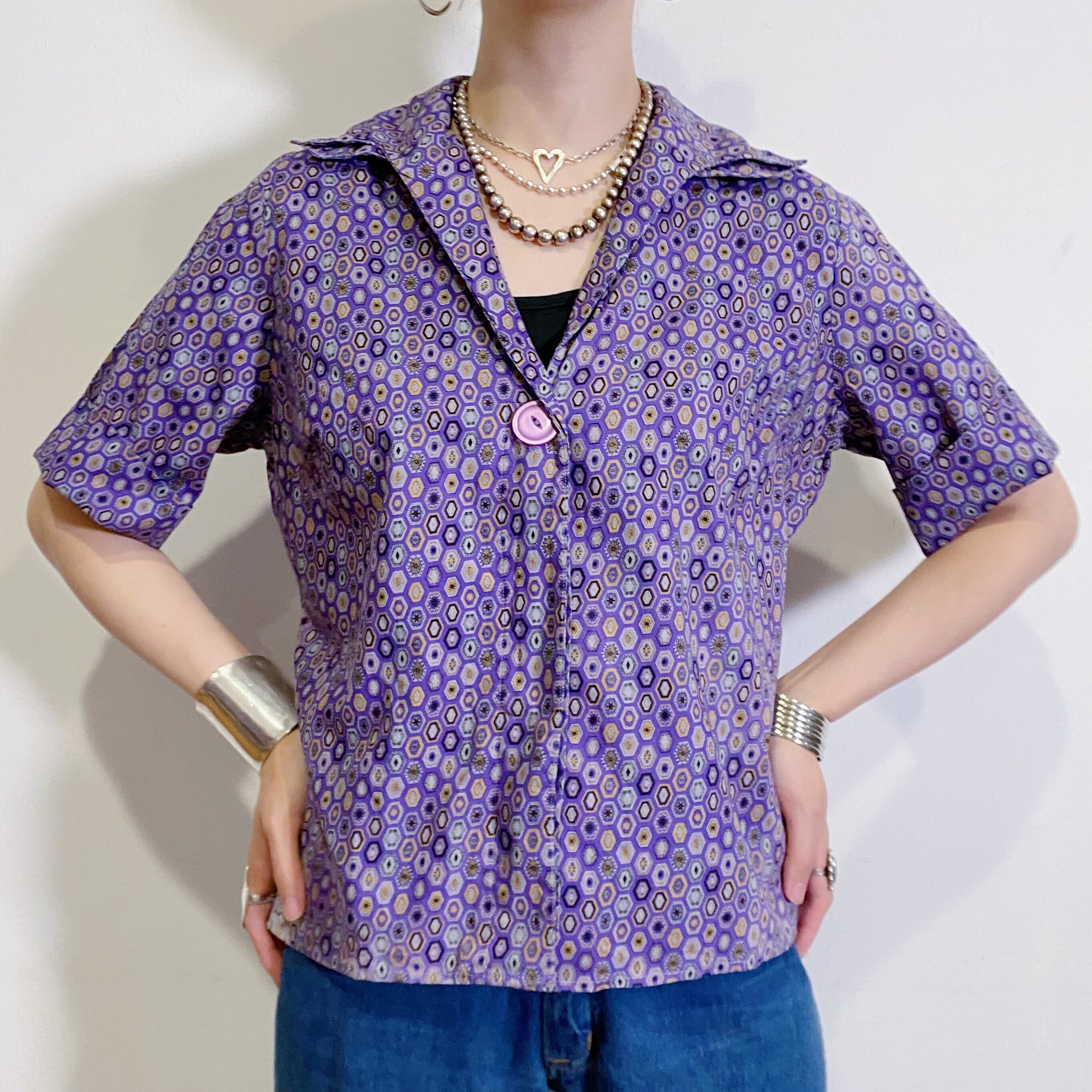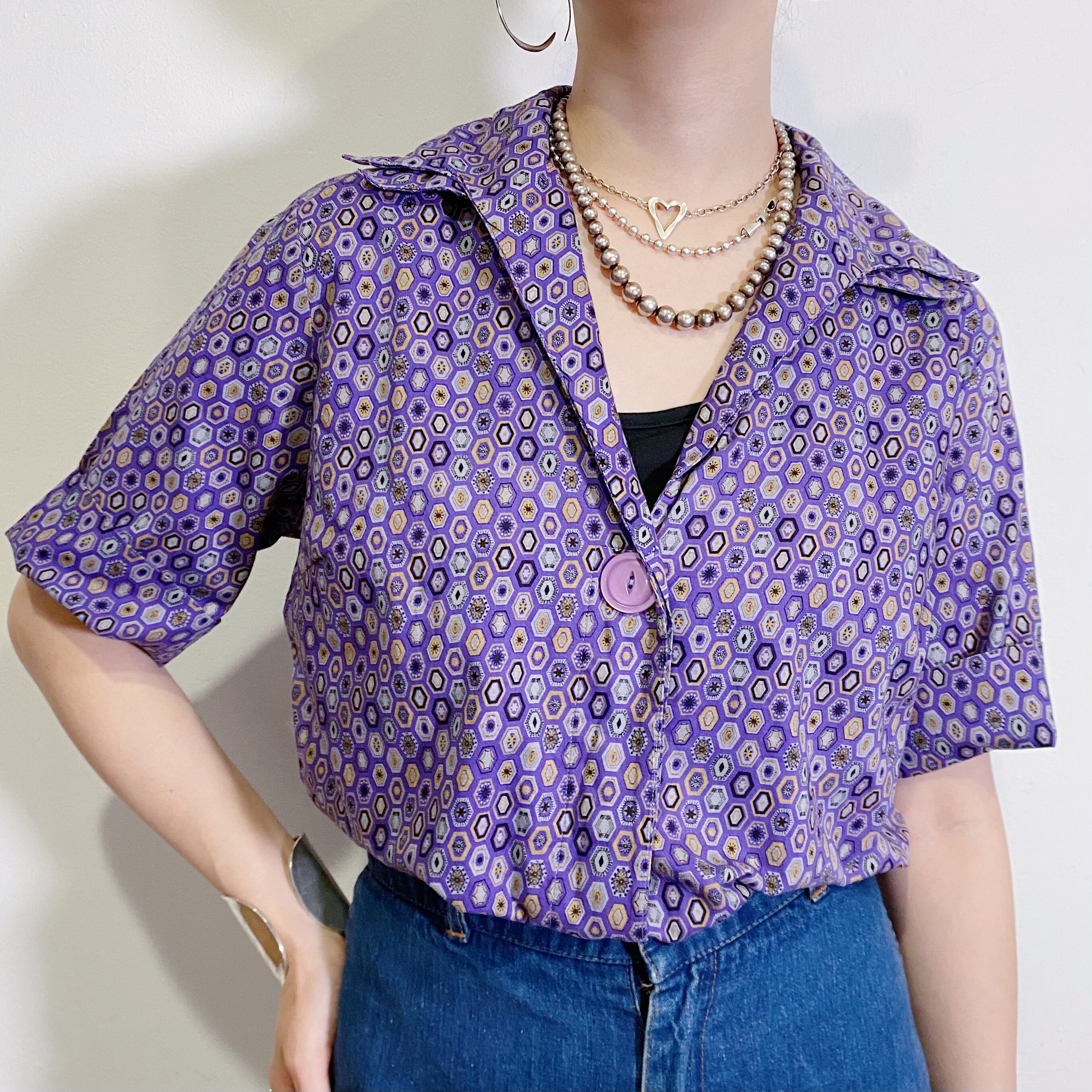 紫色の、不思議なタイルのような柄が可愛いヴィンテージの開襟シャツです。