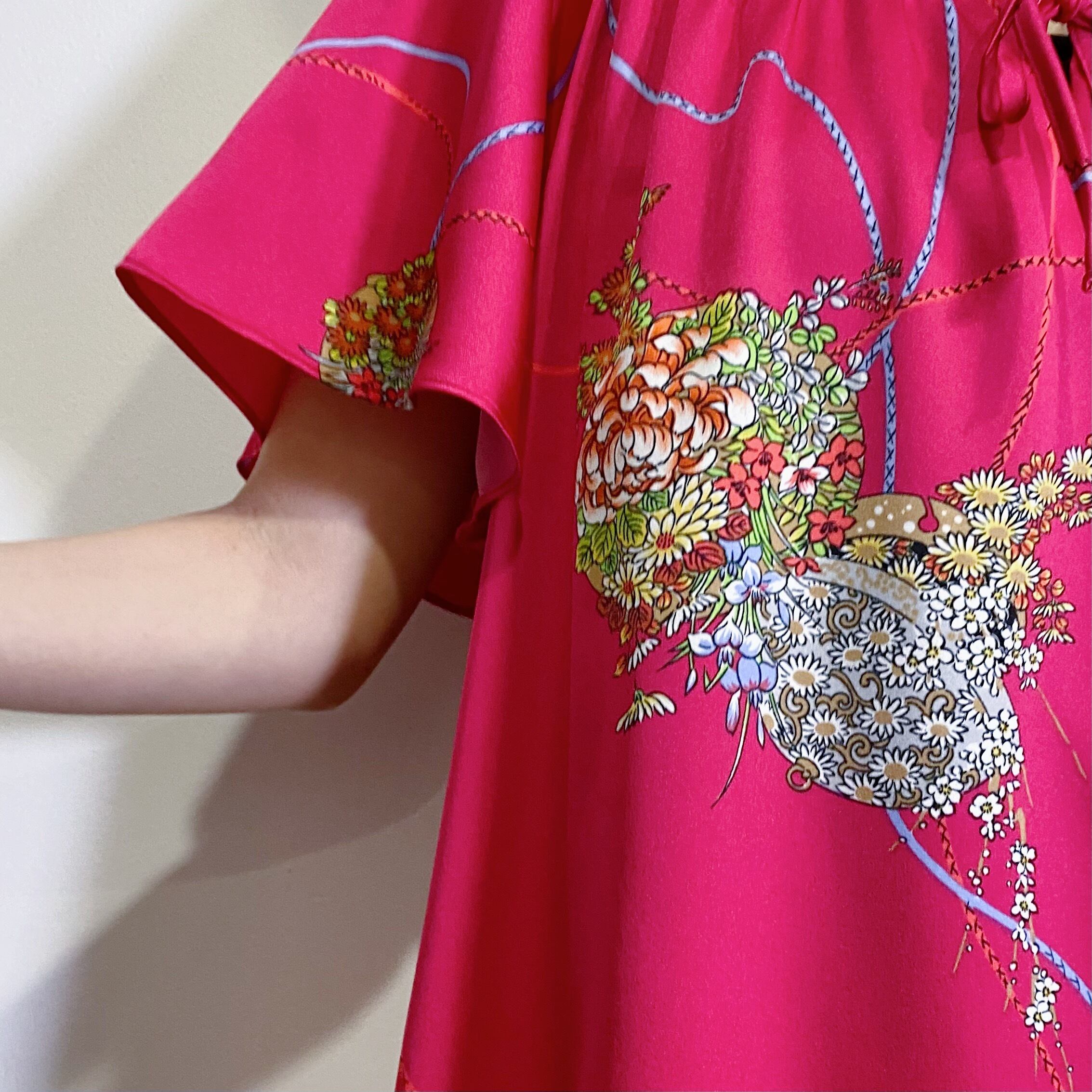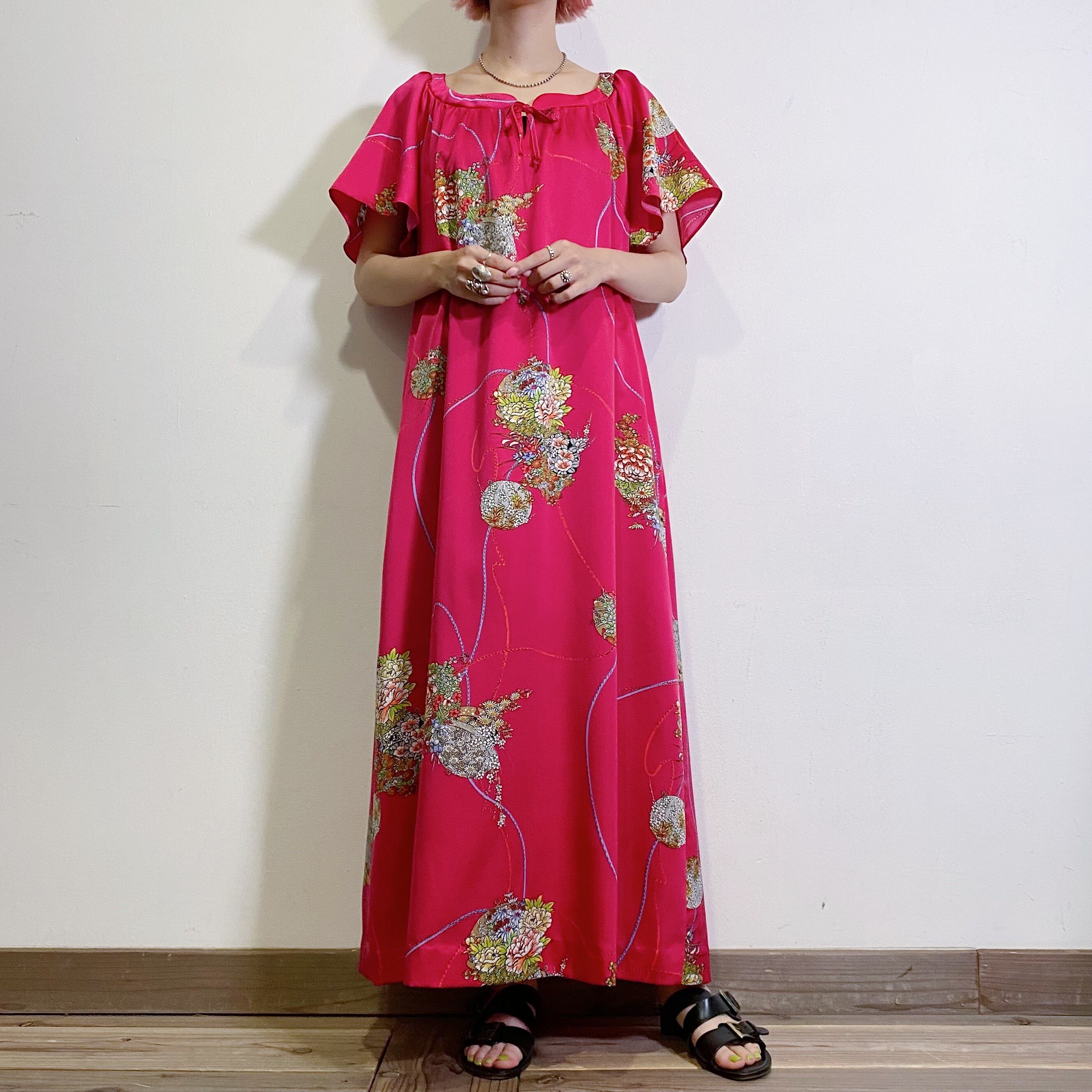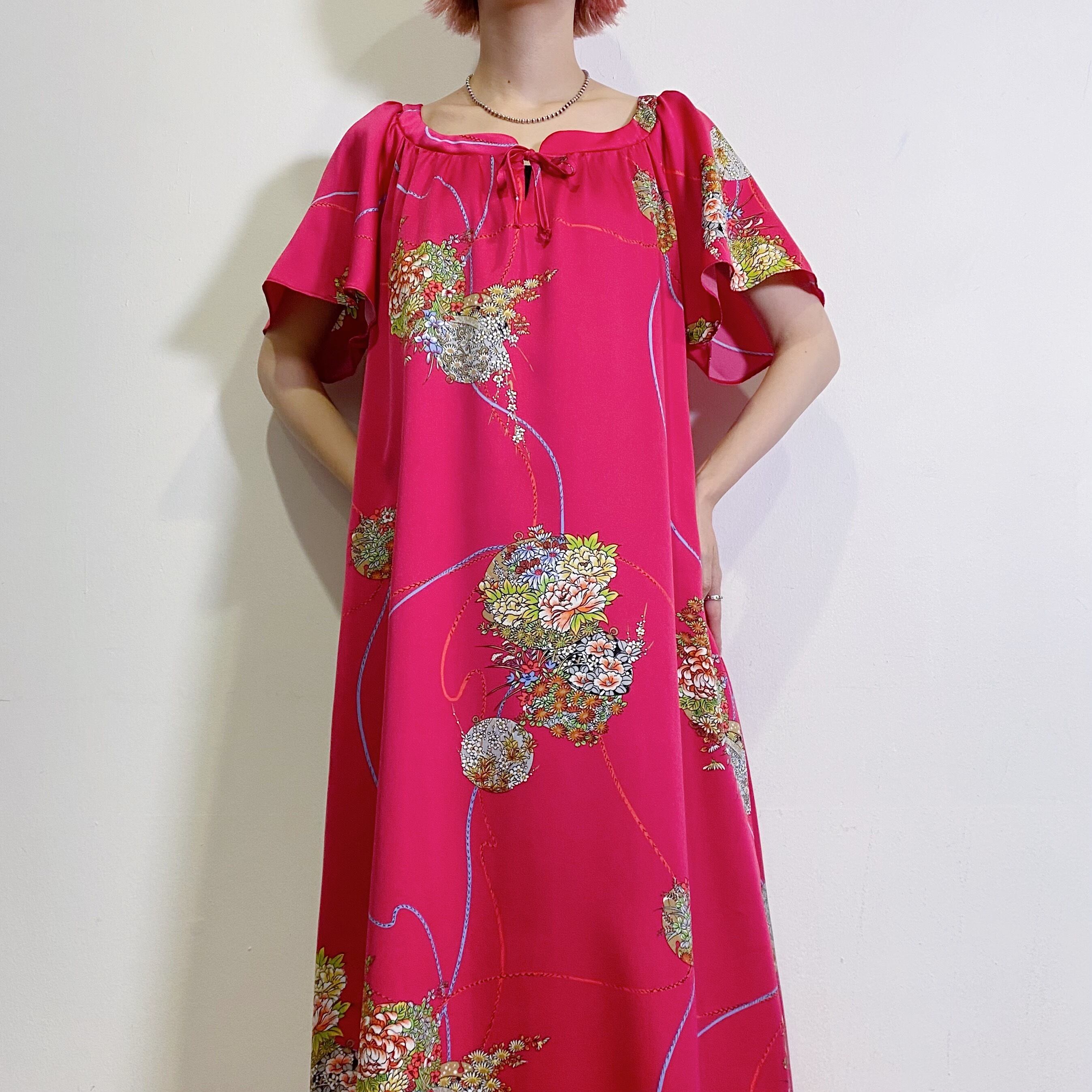 こっくりピンクに和モダンな雰囲気の花柄が可愛い、70年代のワンピースです。
