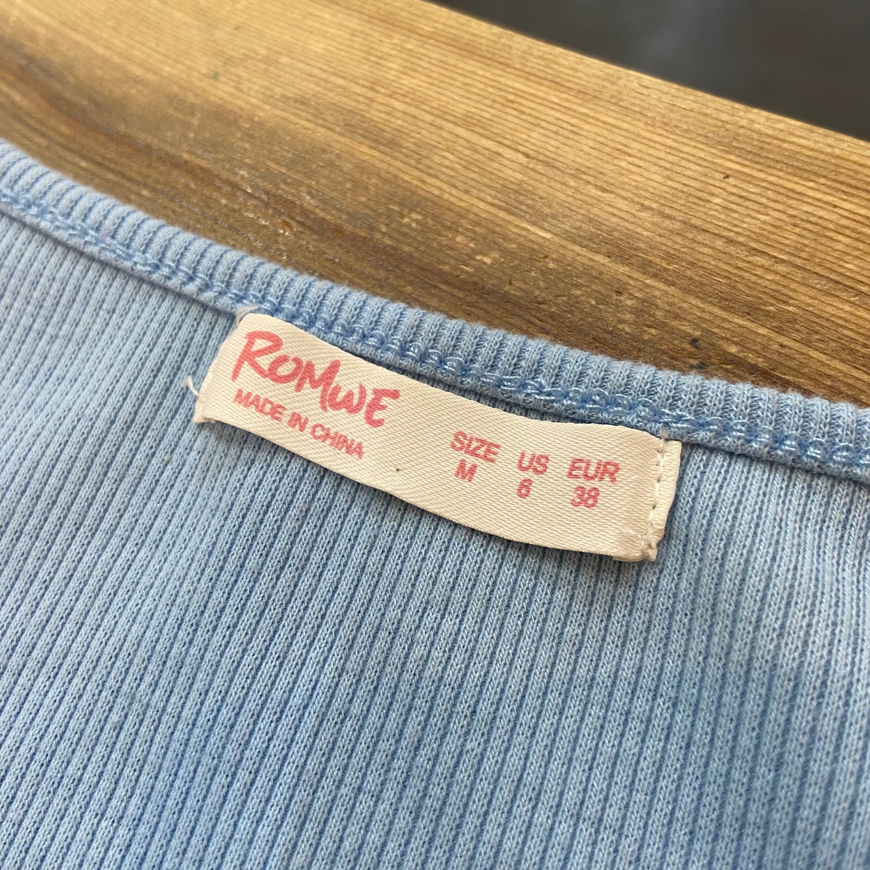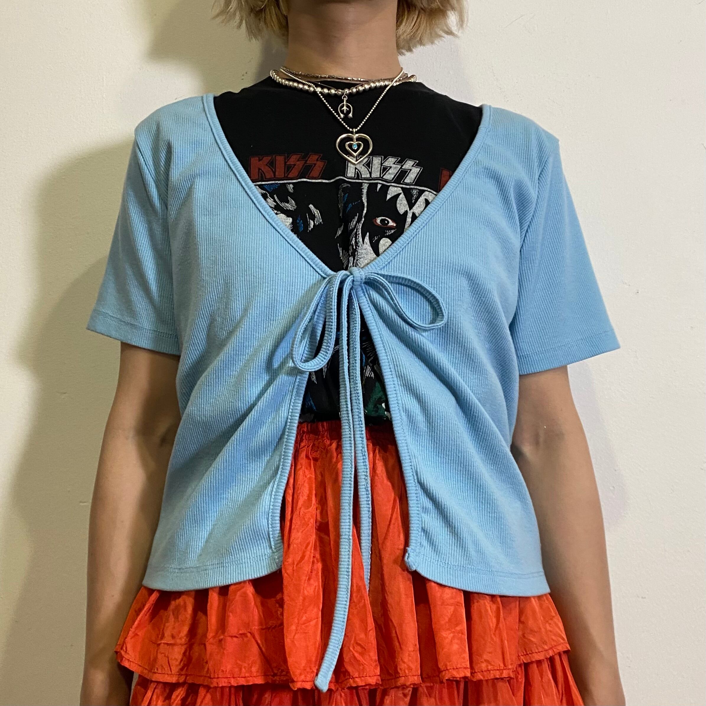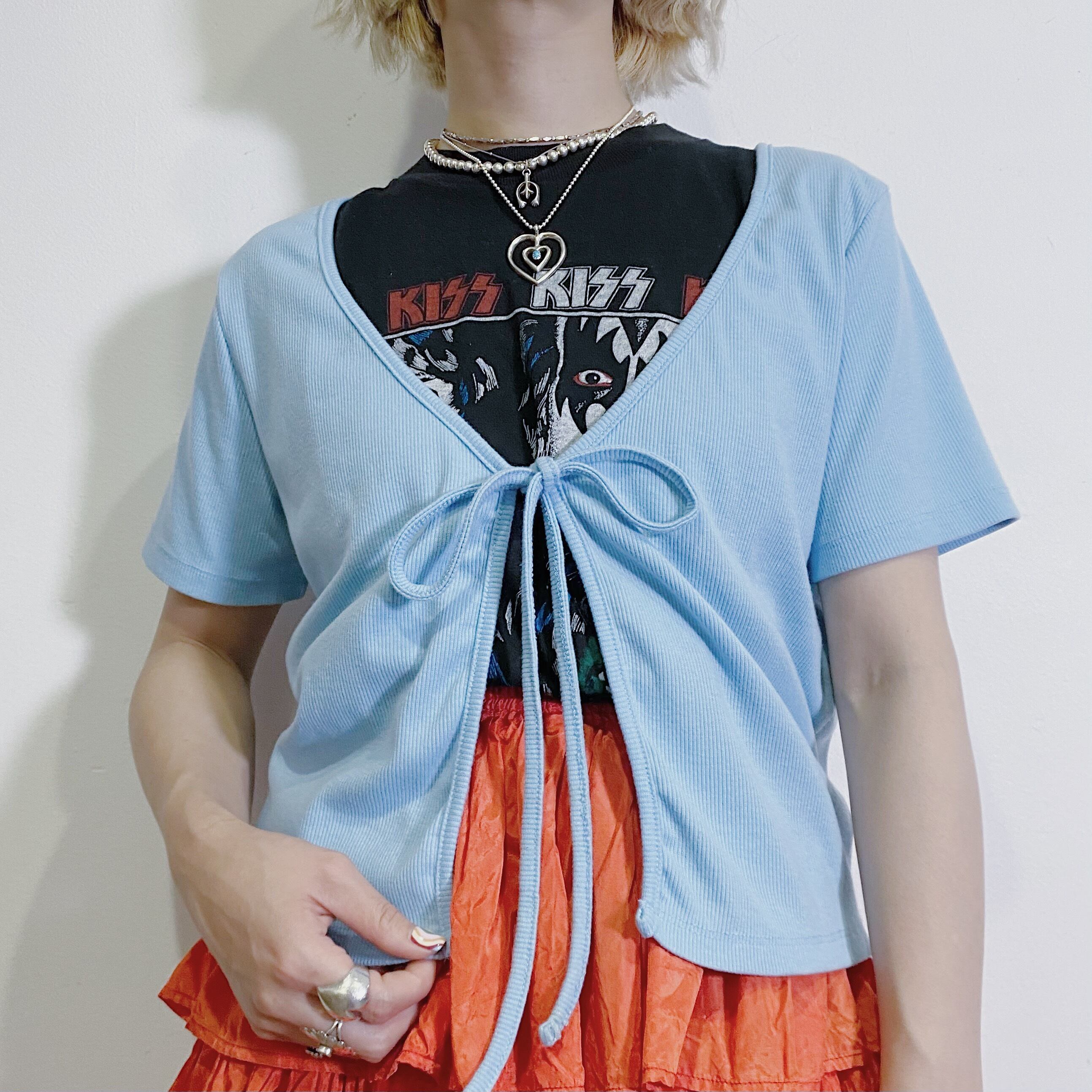 細かいリブやフロントのリボン、短めの丈がキュートな一枚。