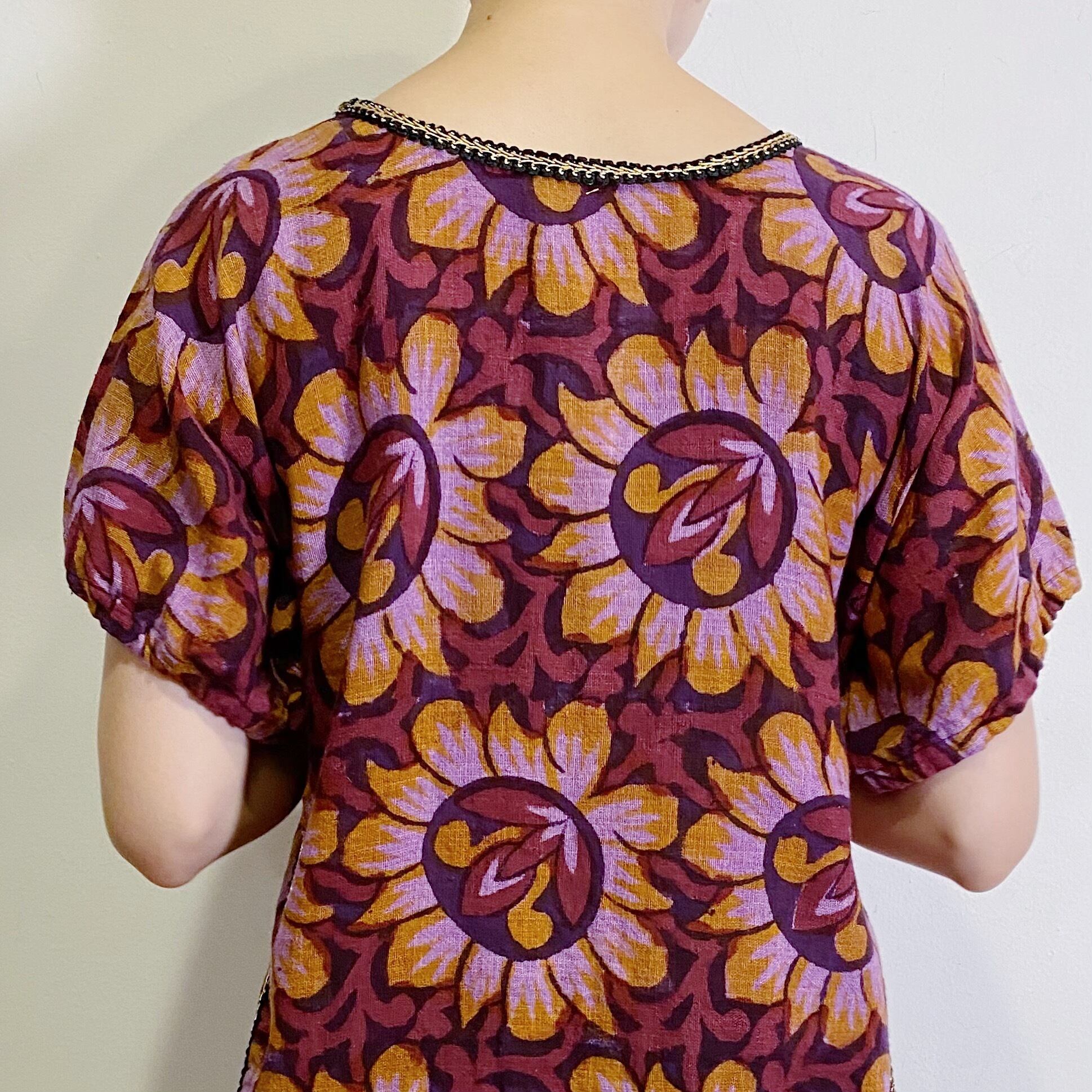 ひまわりのような花柄が可愛い、エスニックムード漂うトップスです。