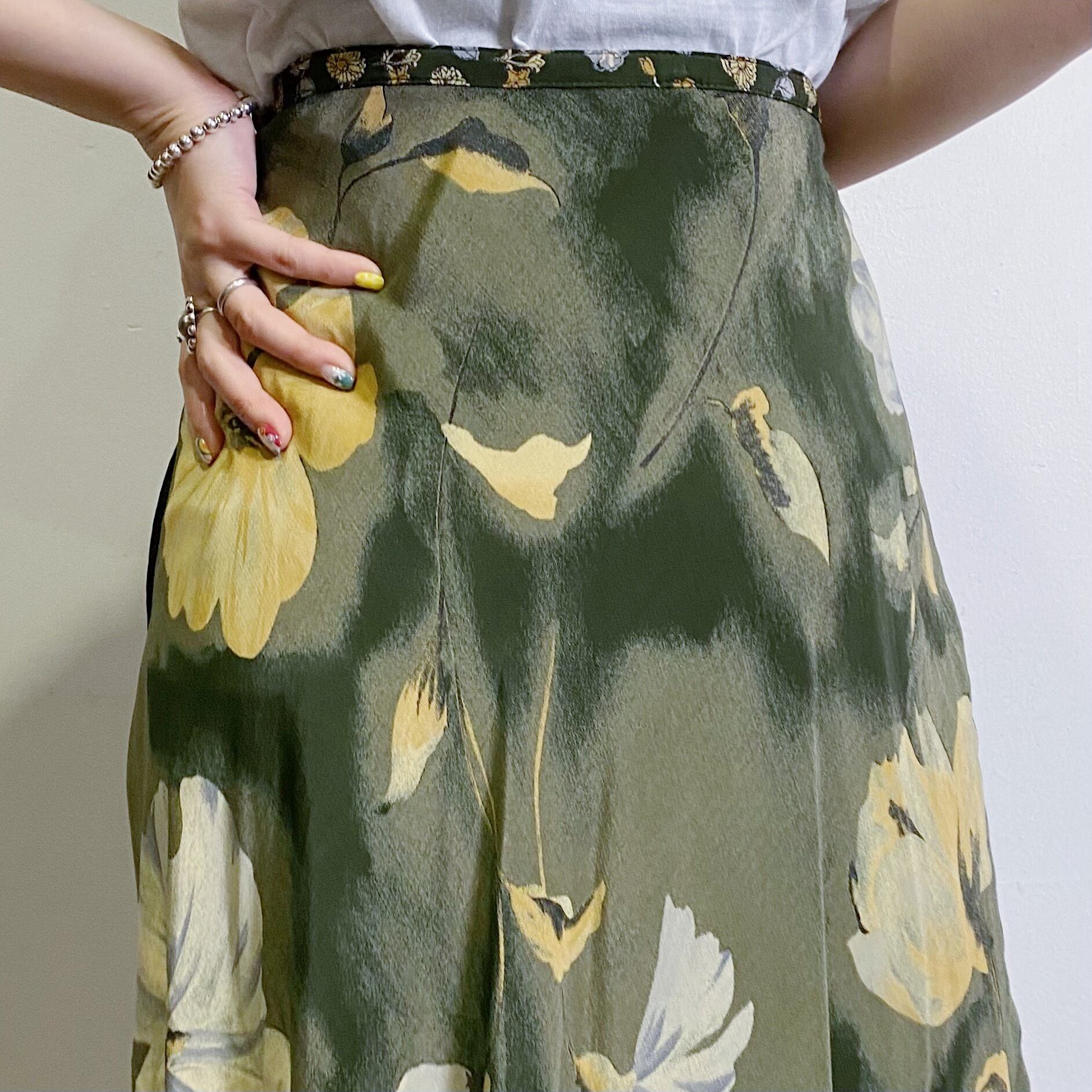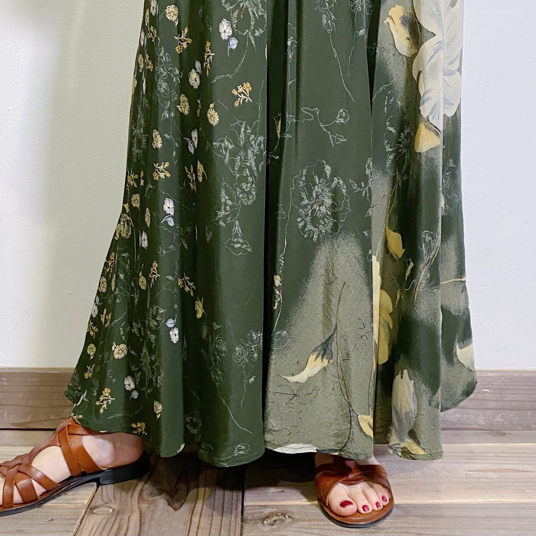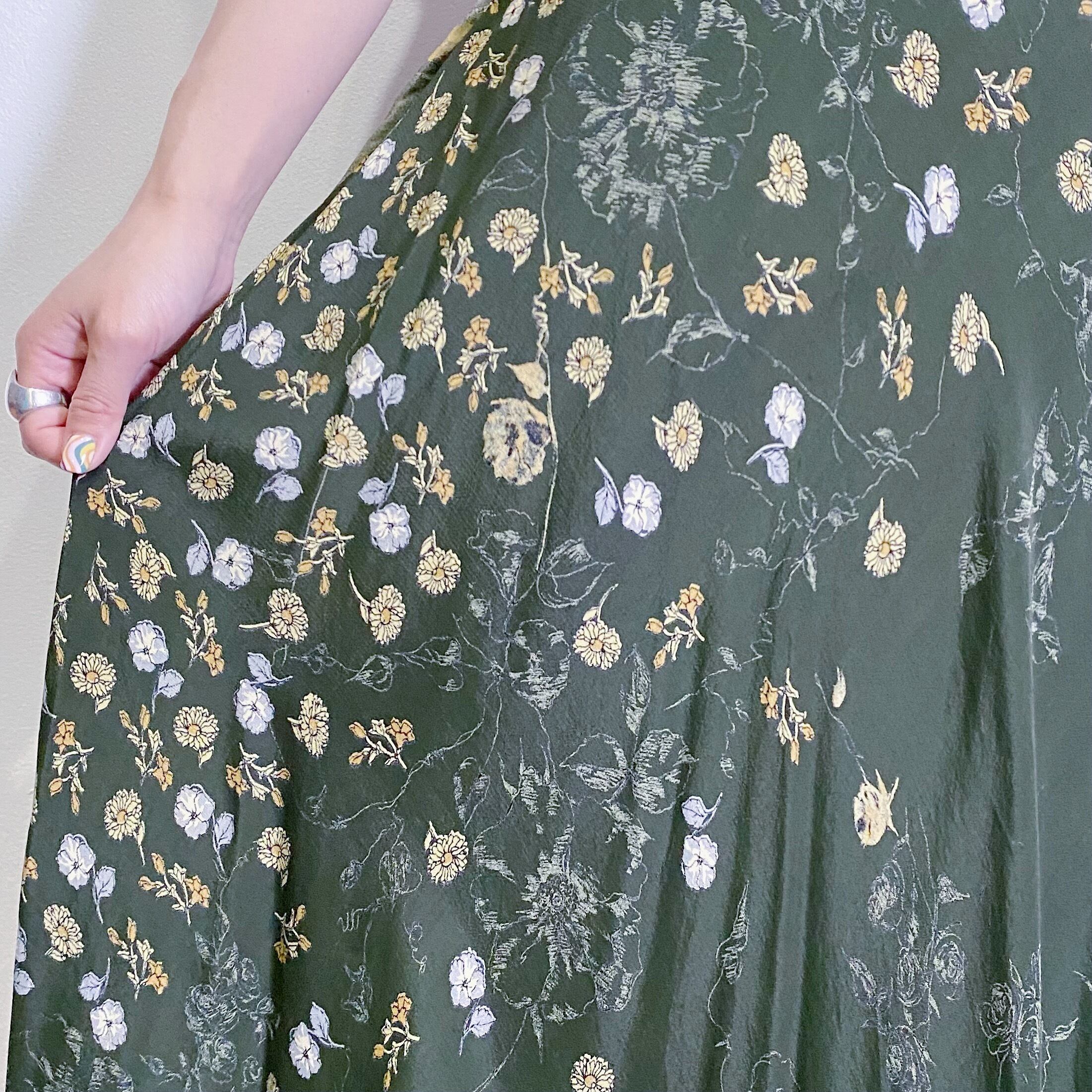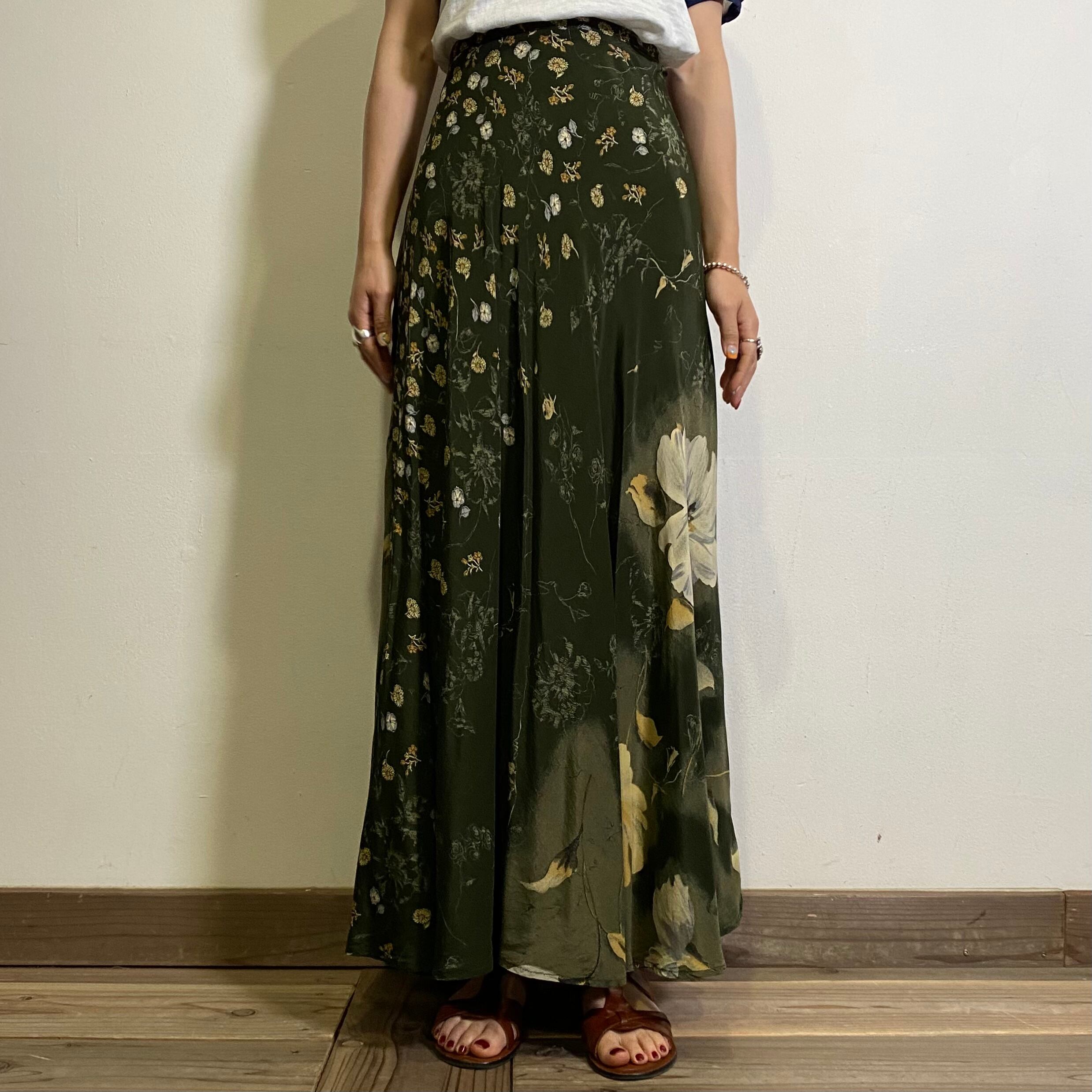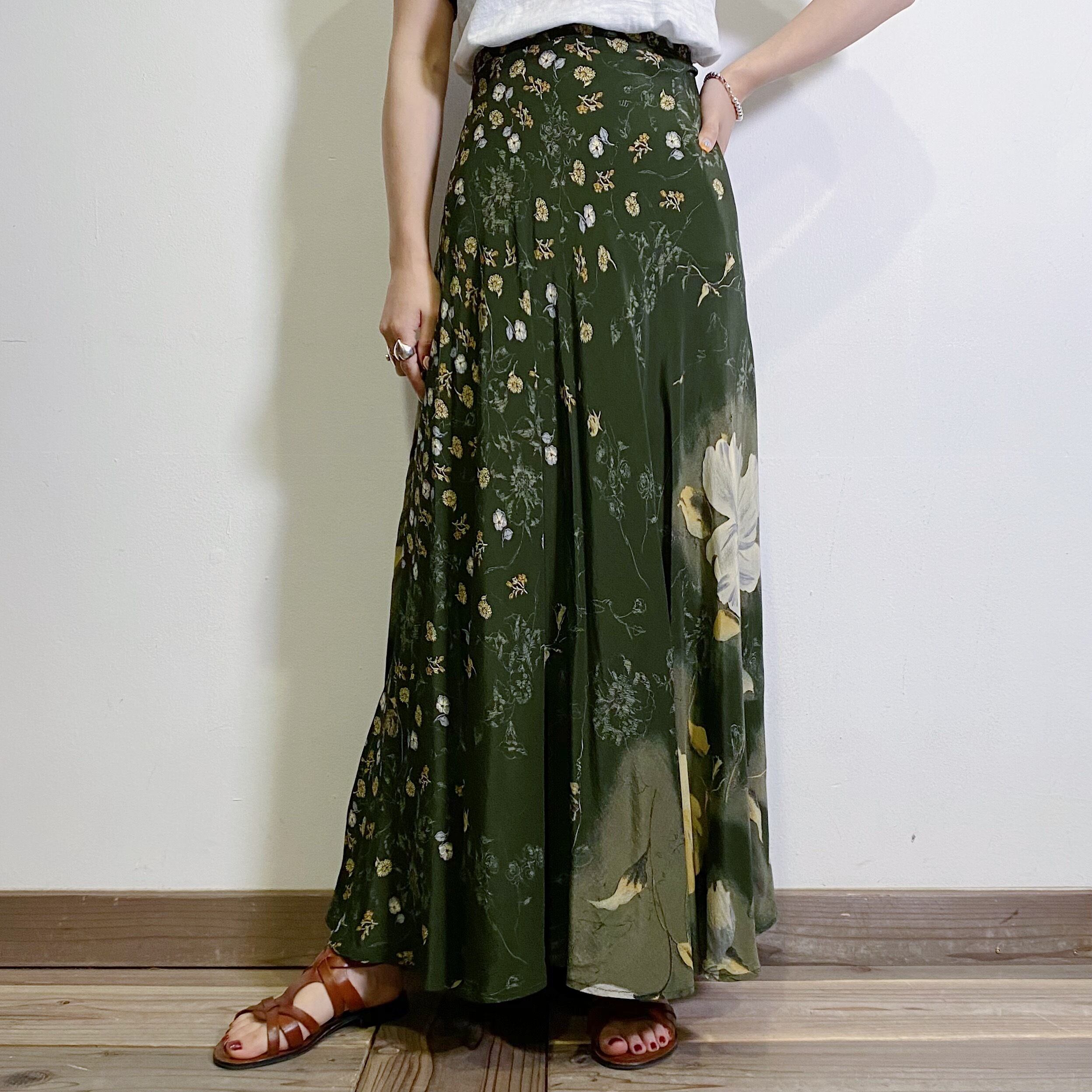 90s green flower rayon long skirt