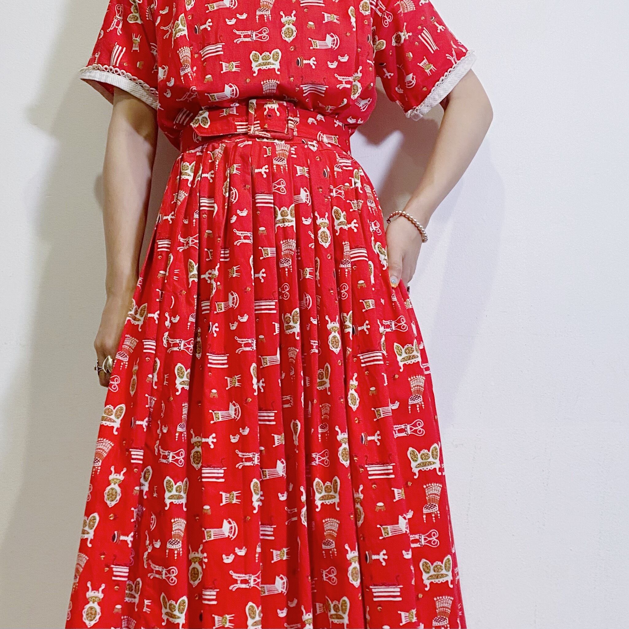 様々な椅子やソファがプリントされた、ユニークで可愛い50年代のワンピースです。