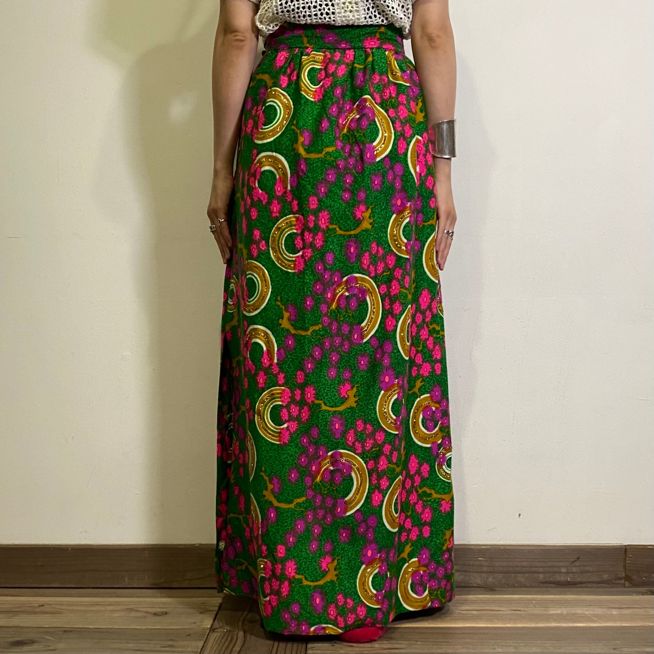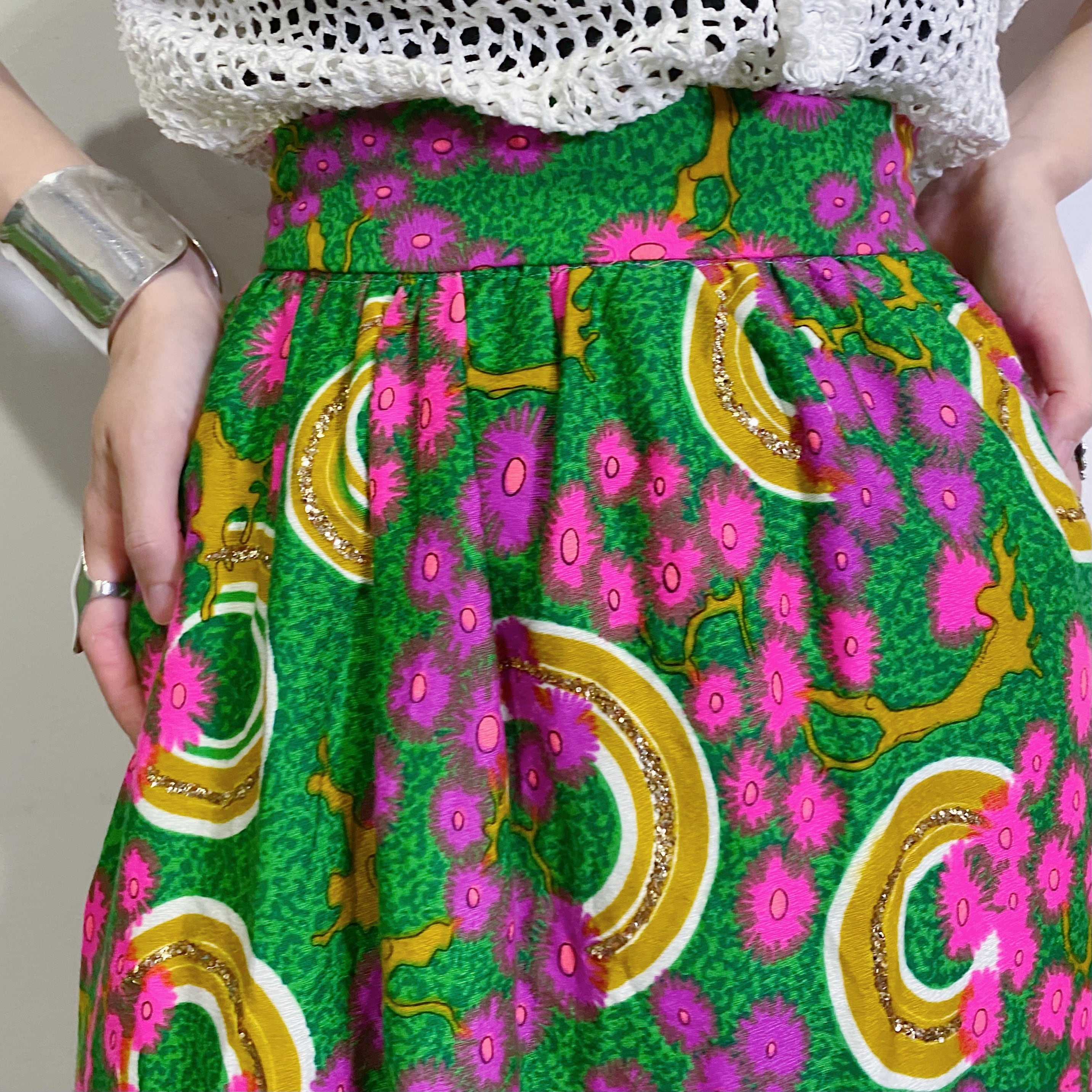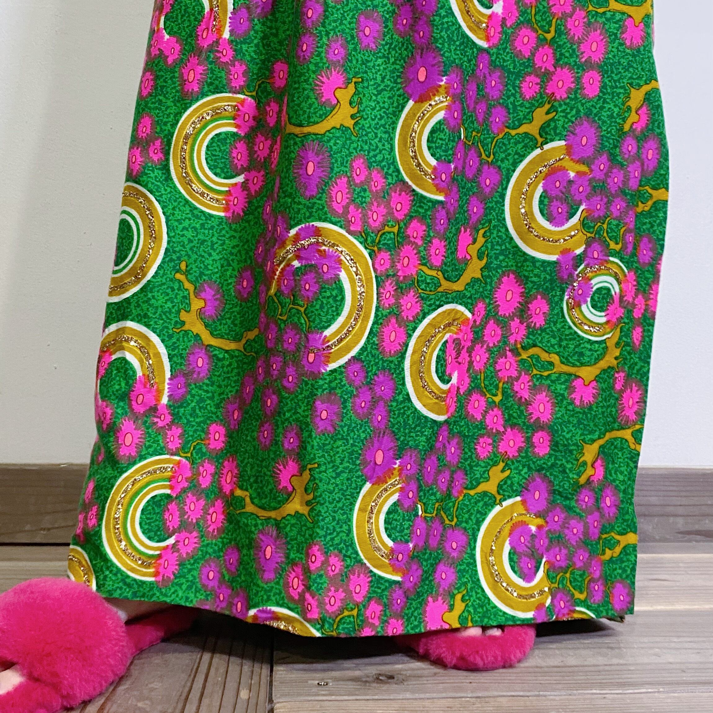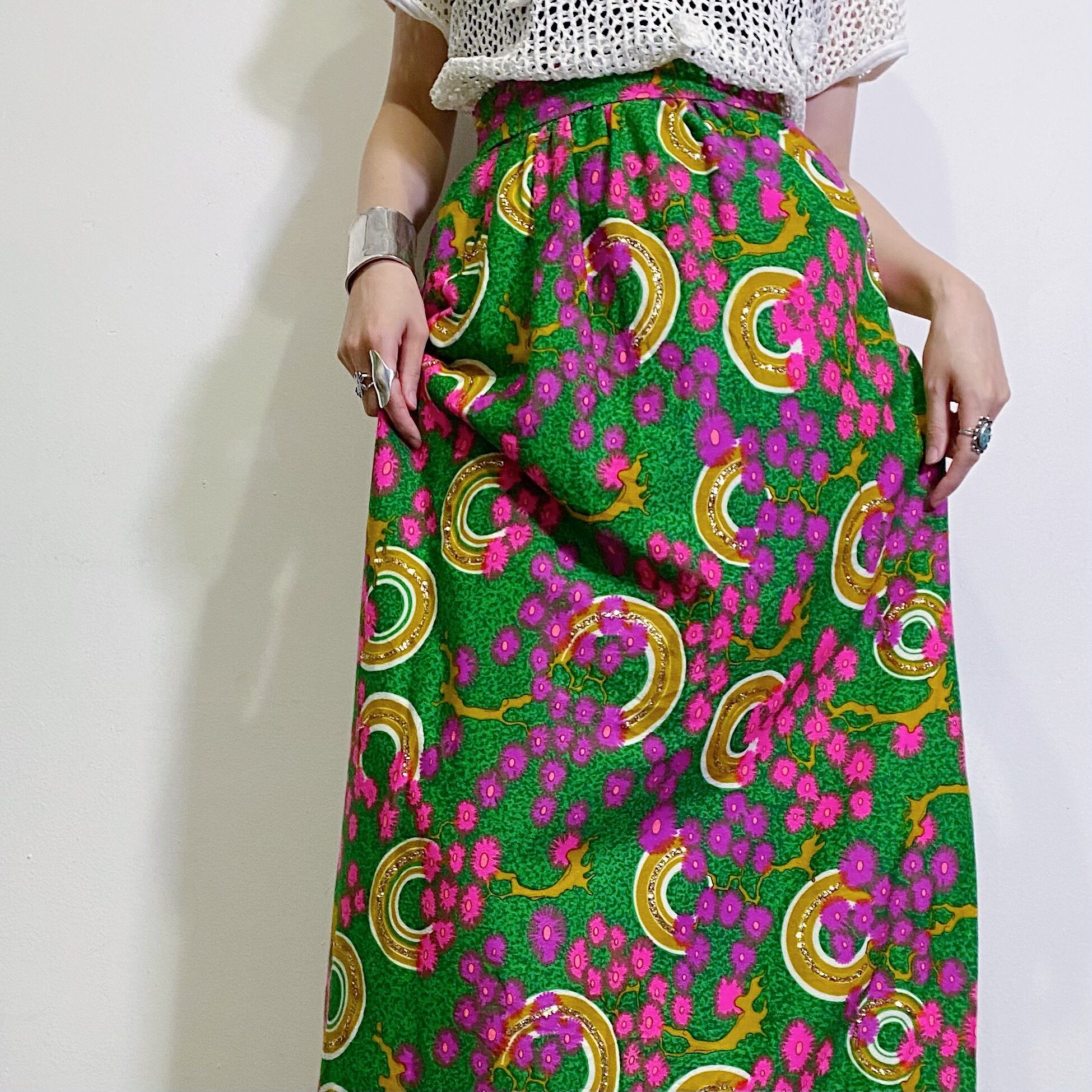 鮮やかなグリーンベースにピンクや紫の不思議な花柄が可愛い、60~70年代のロングスカートです。