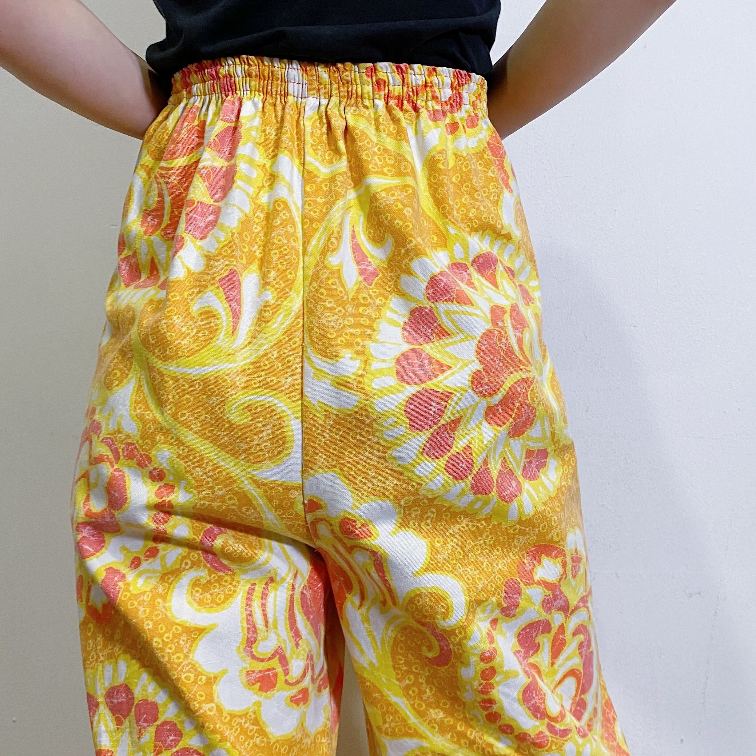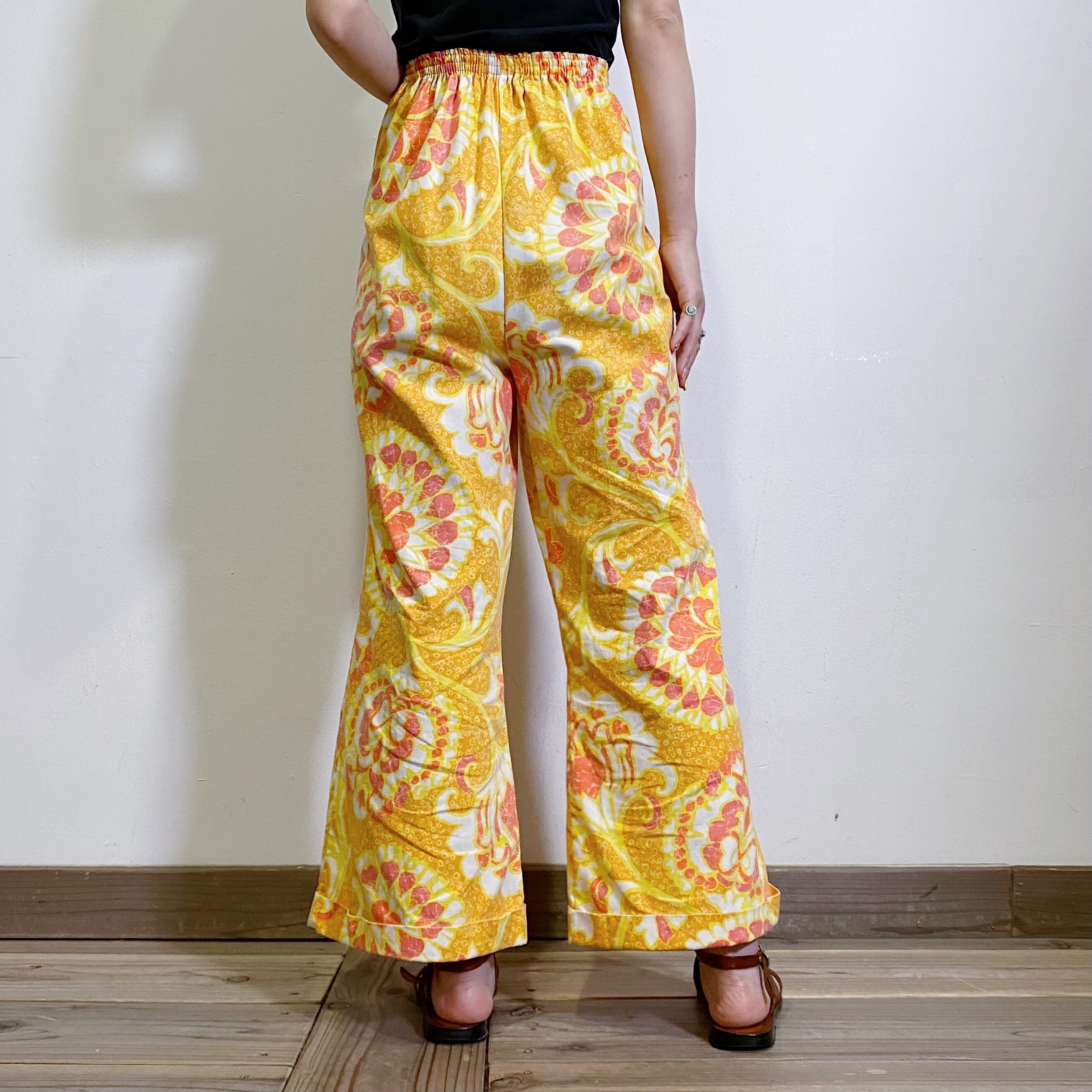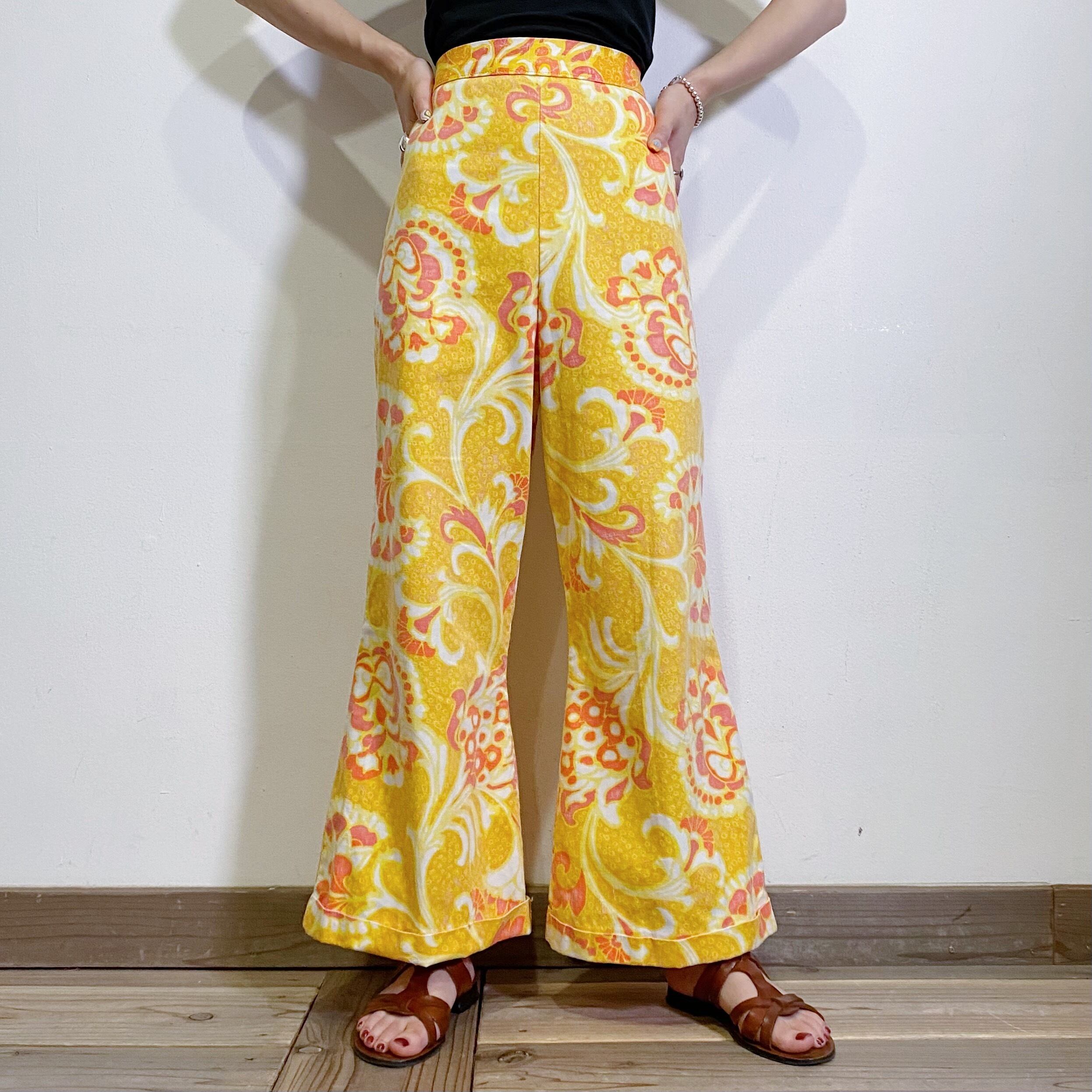 ハッピーな黄色とオレンジの色合いが可愛い、60~70年代のフレアパンツです。