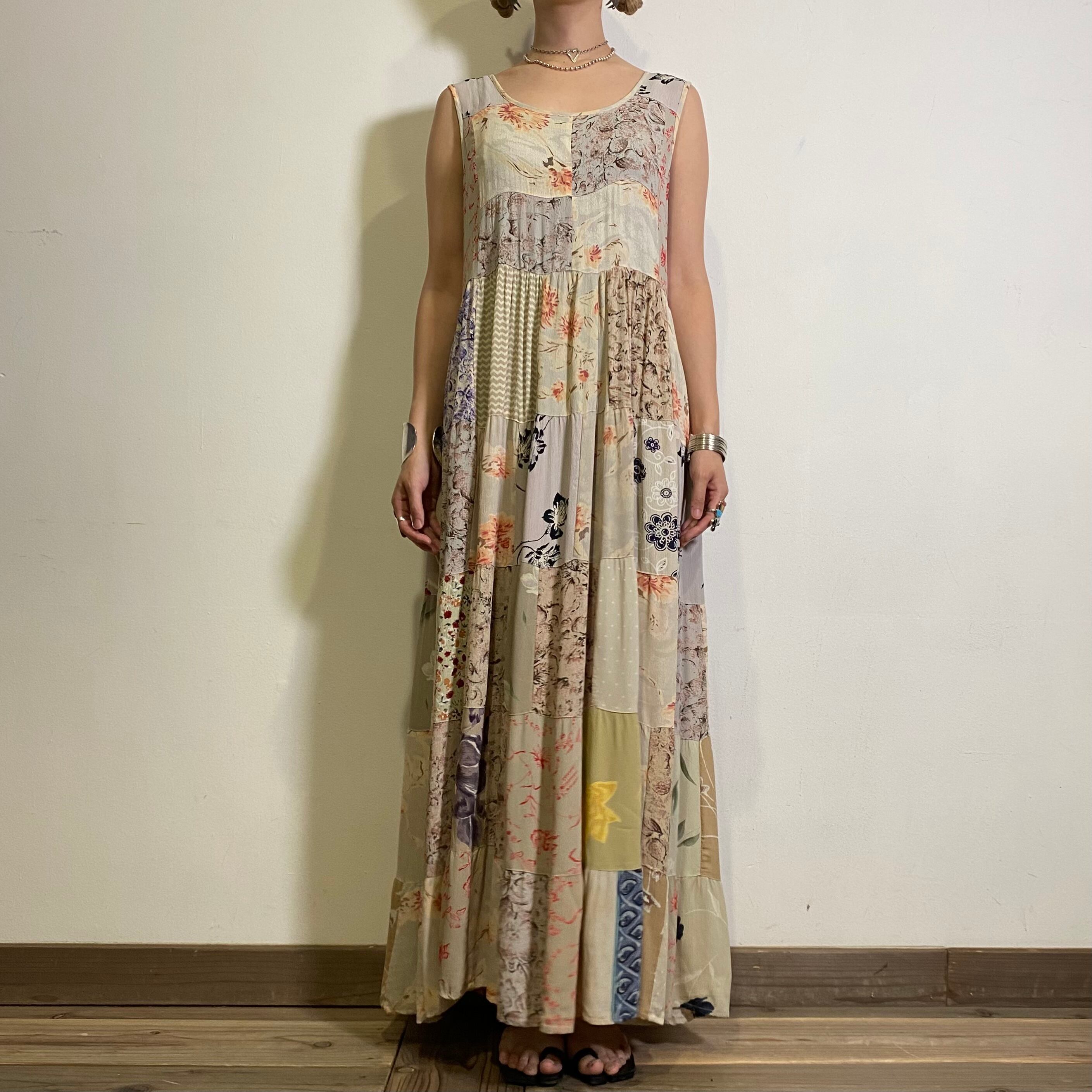 優しい印象のベージュベースにパッチワークが可愛いノースリーブワンピースです。