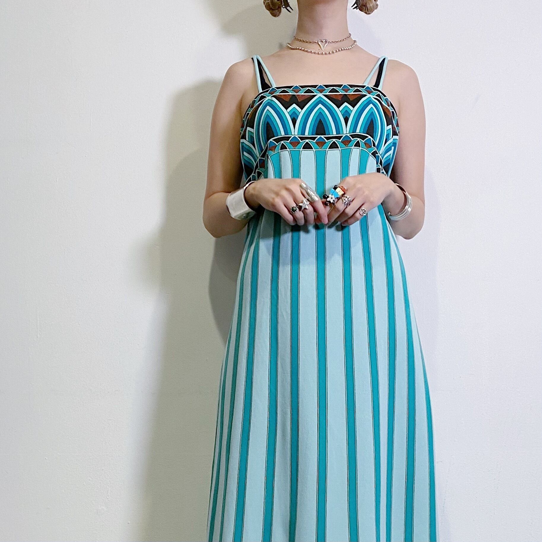 サックスブルーとブラウンの色味が大人可愛い、70年代のキャミワンピースです。