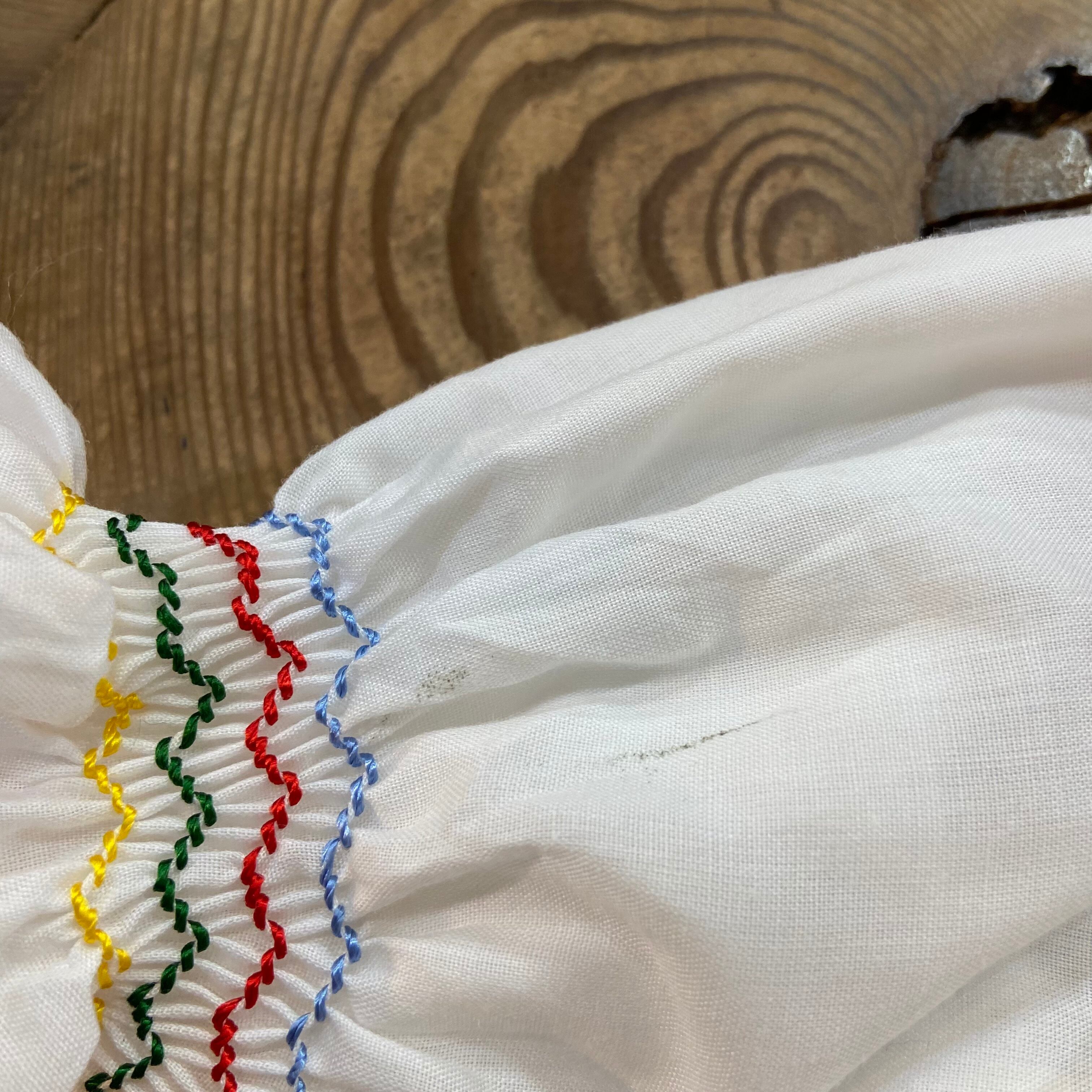 縁にはなみなみとしたレインボーカラーのスモッキングがポイントになっており、お袖や裾のぽわんとしたふくらみも魅力的。