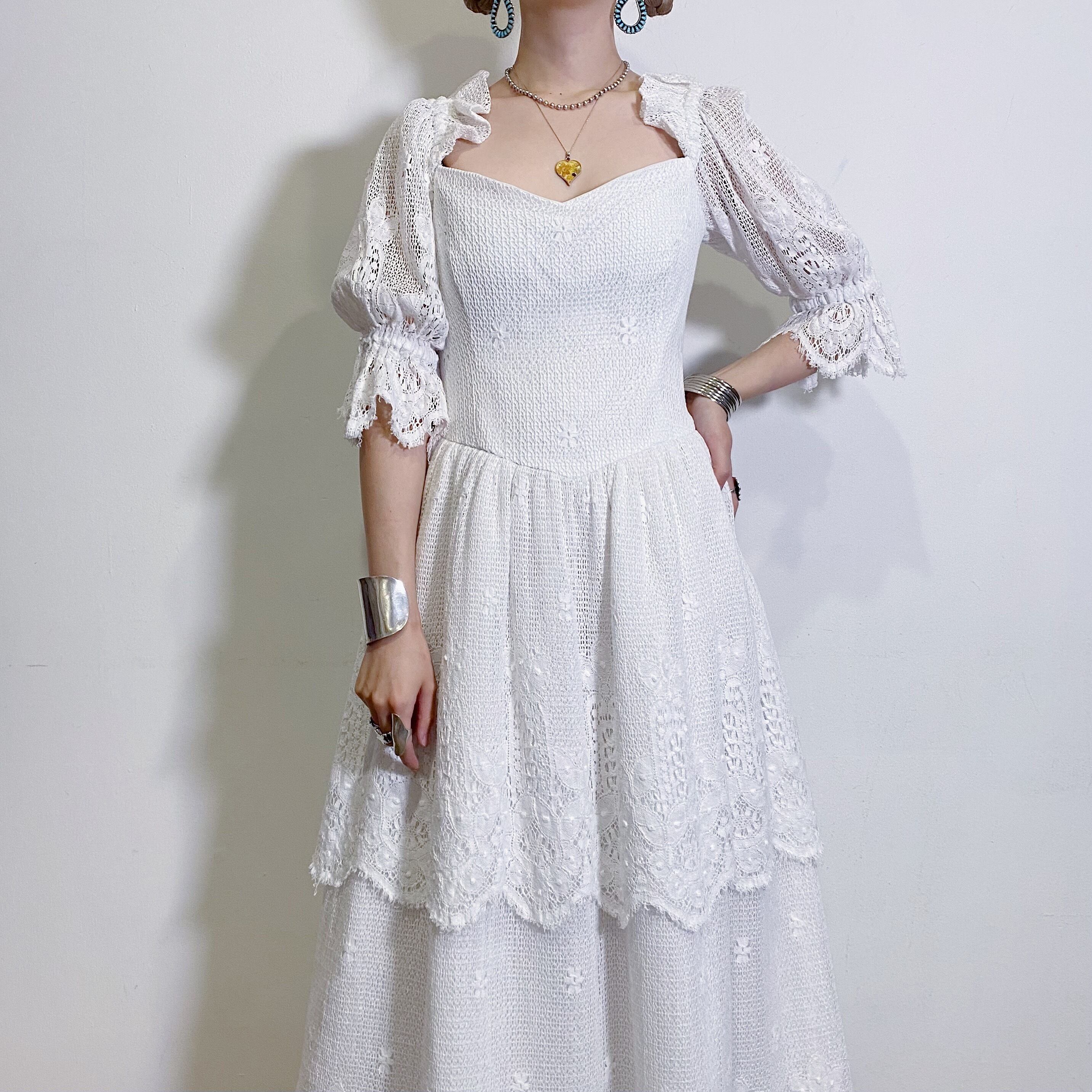 総クロシェデザインがとっても素敵でスペシャルな、70年代のロングドレスです。
