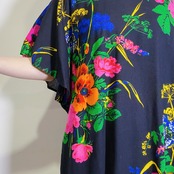 ブラックベースにパキッとしたカラフルなブーケのような大きなお花が可愛い、70年代のロングワンピースです。