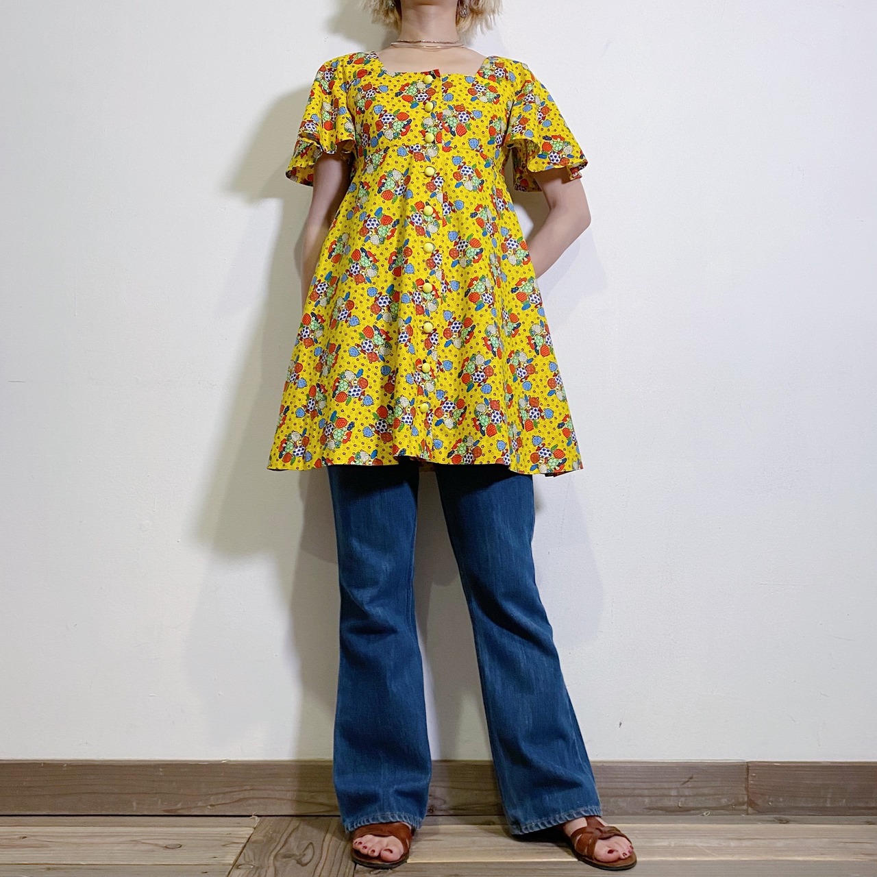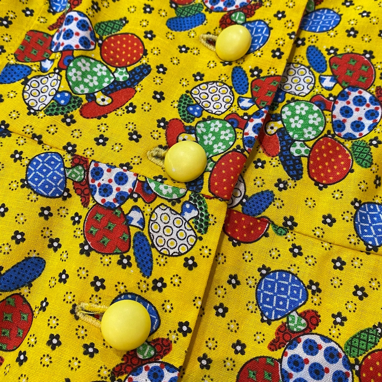鮮やかなイエローベースにカラフルなキノコモチーフが可愛い、70年代のトップスです。