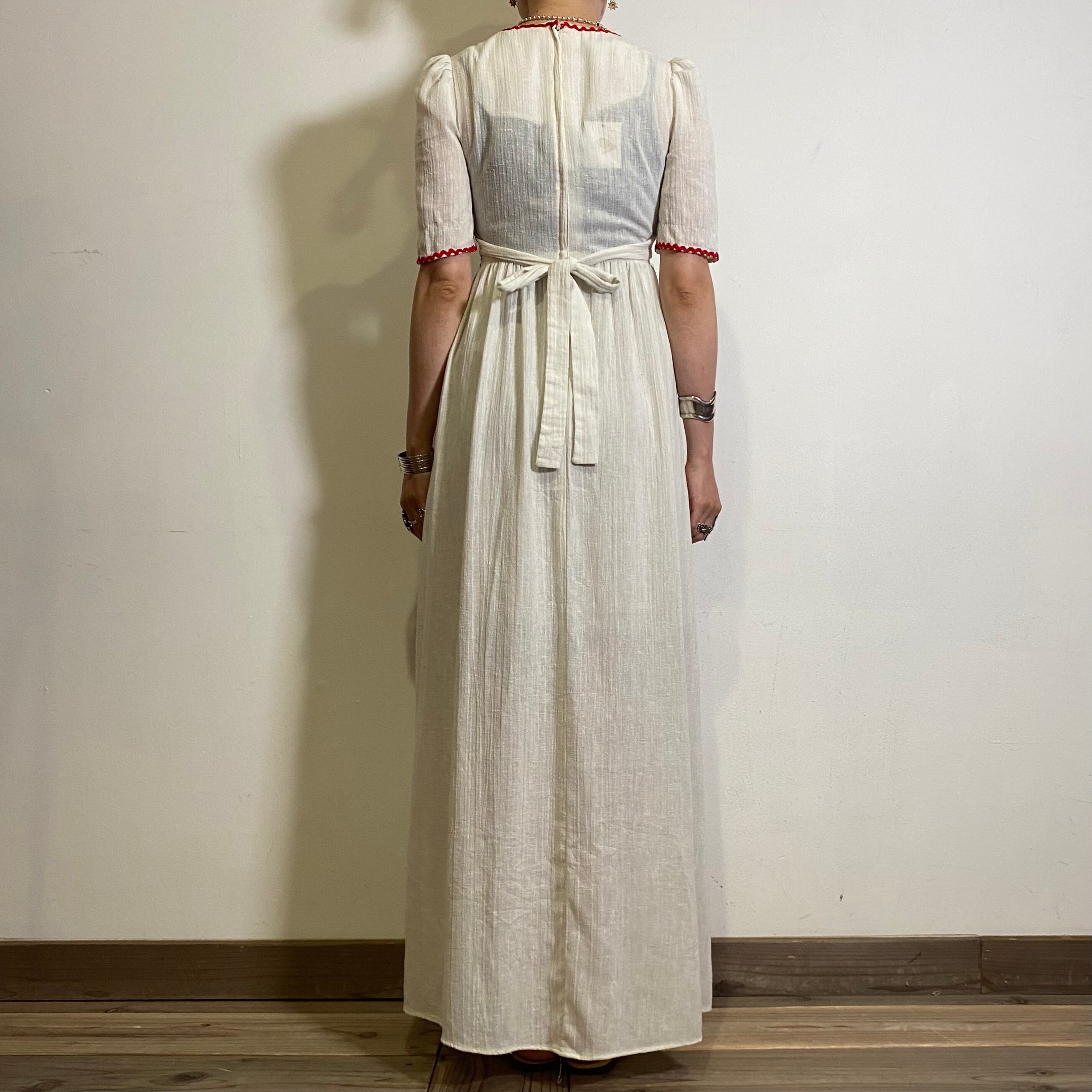 白いガーゼ風の素材にレインボーカラーのスモッキングが可愛い、70年代のロングワンピースです。