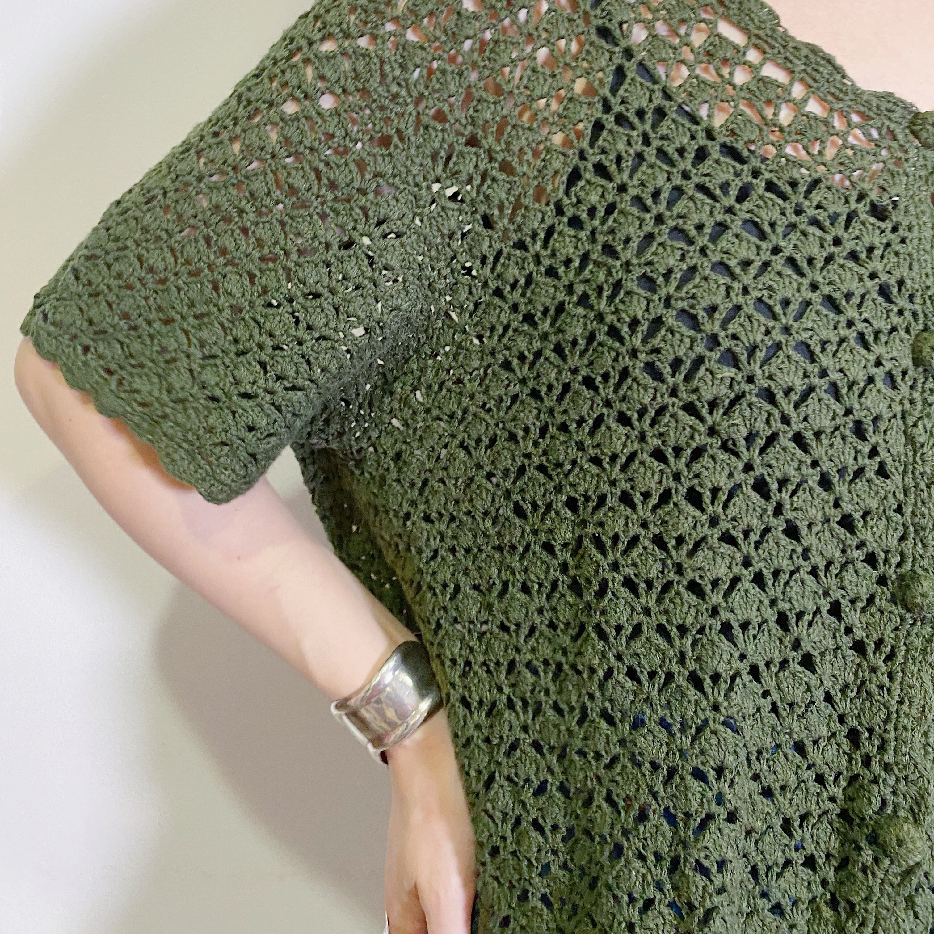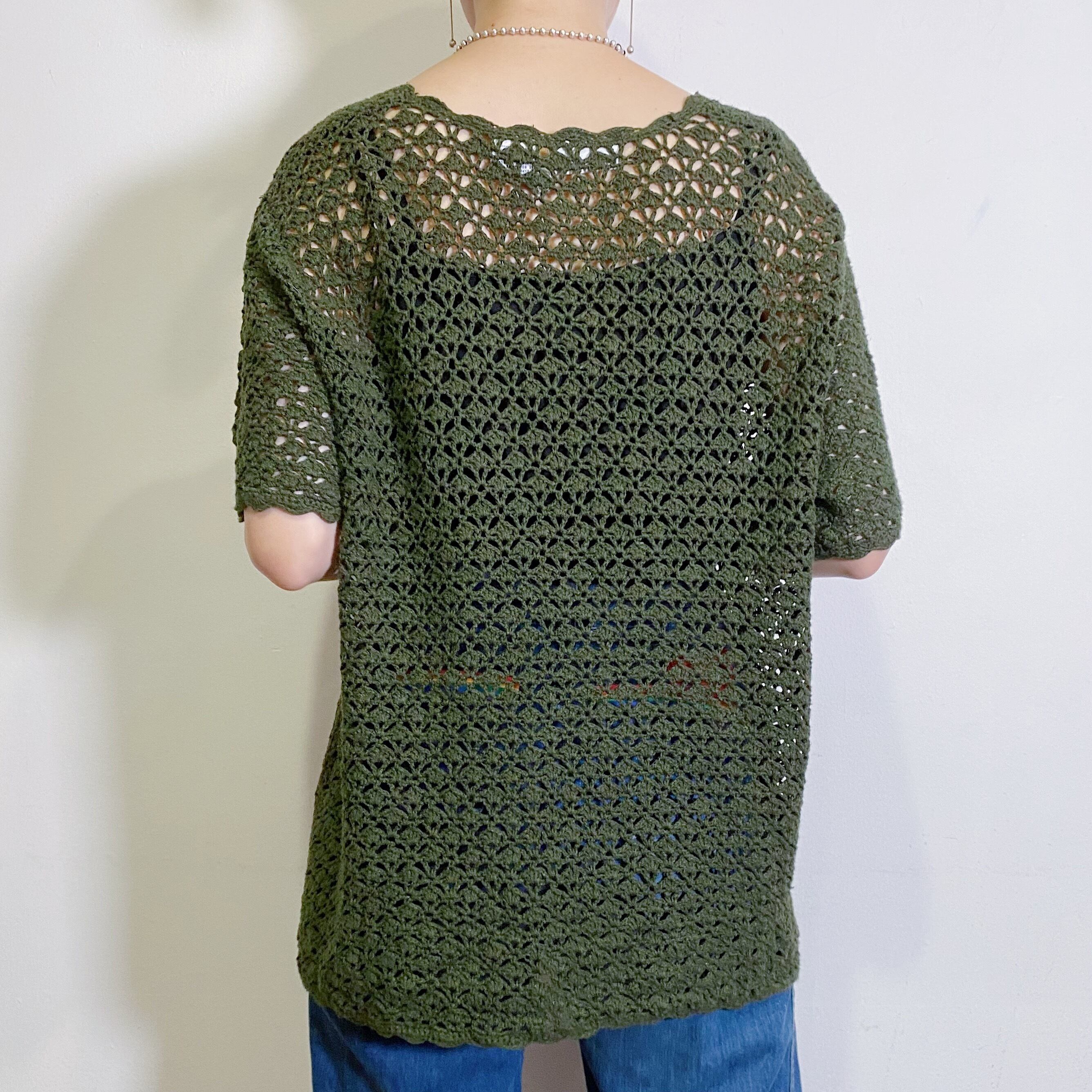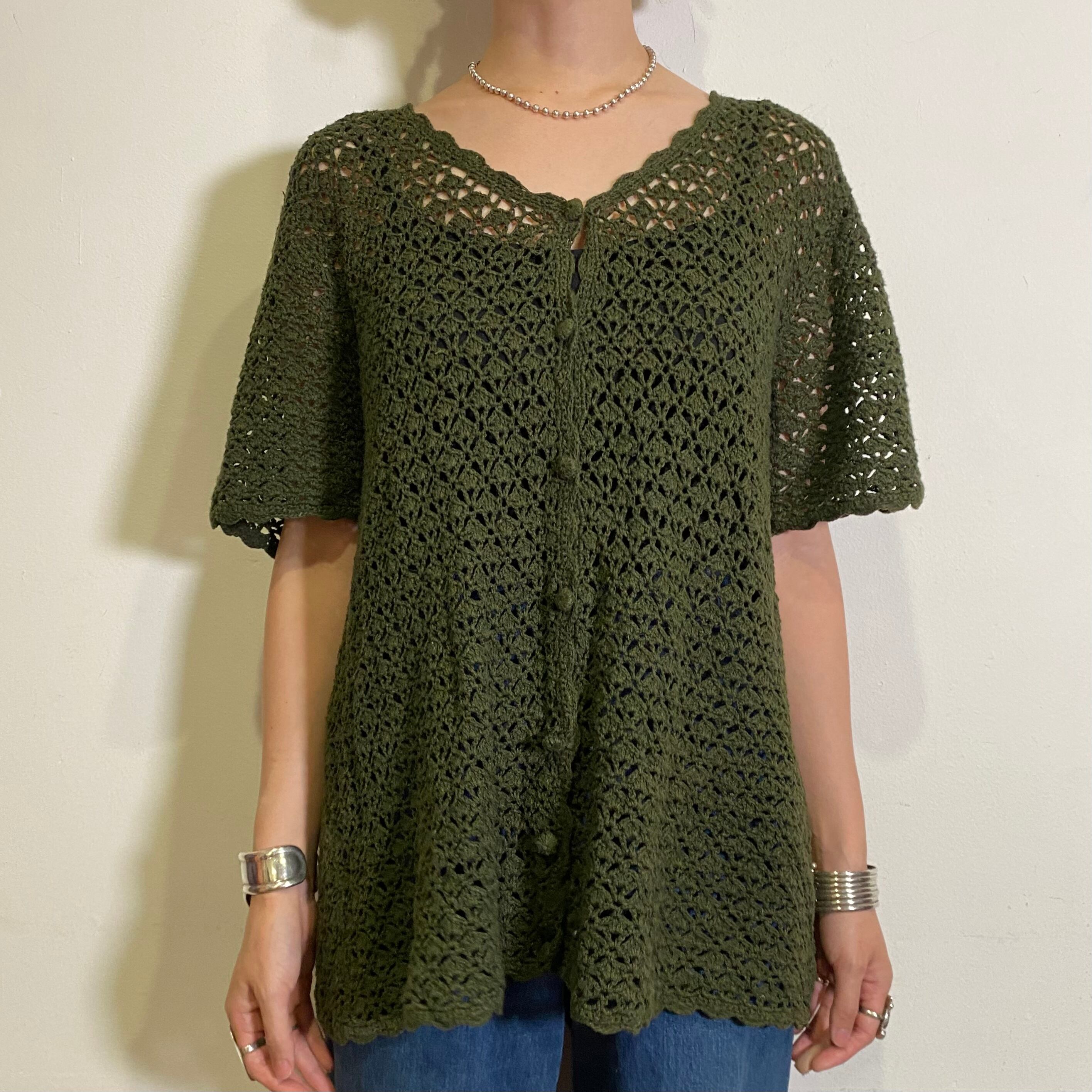 カーキ色で大変使い勝手の良さそうなクロシェニットカーディガンです。