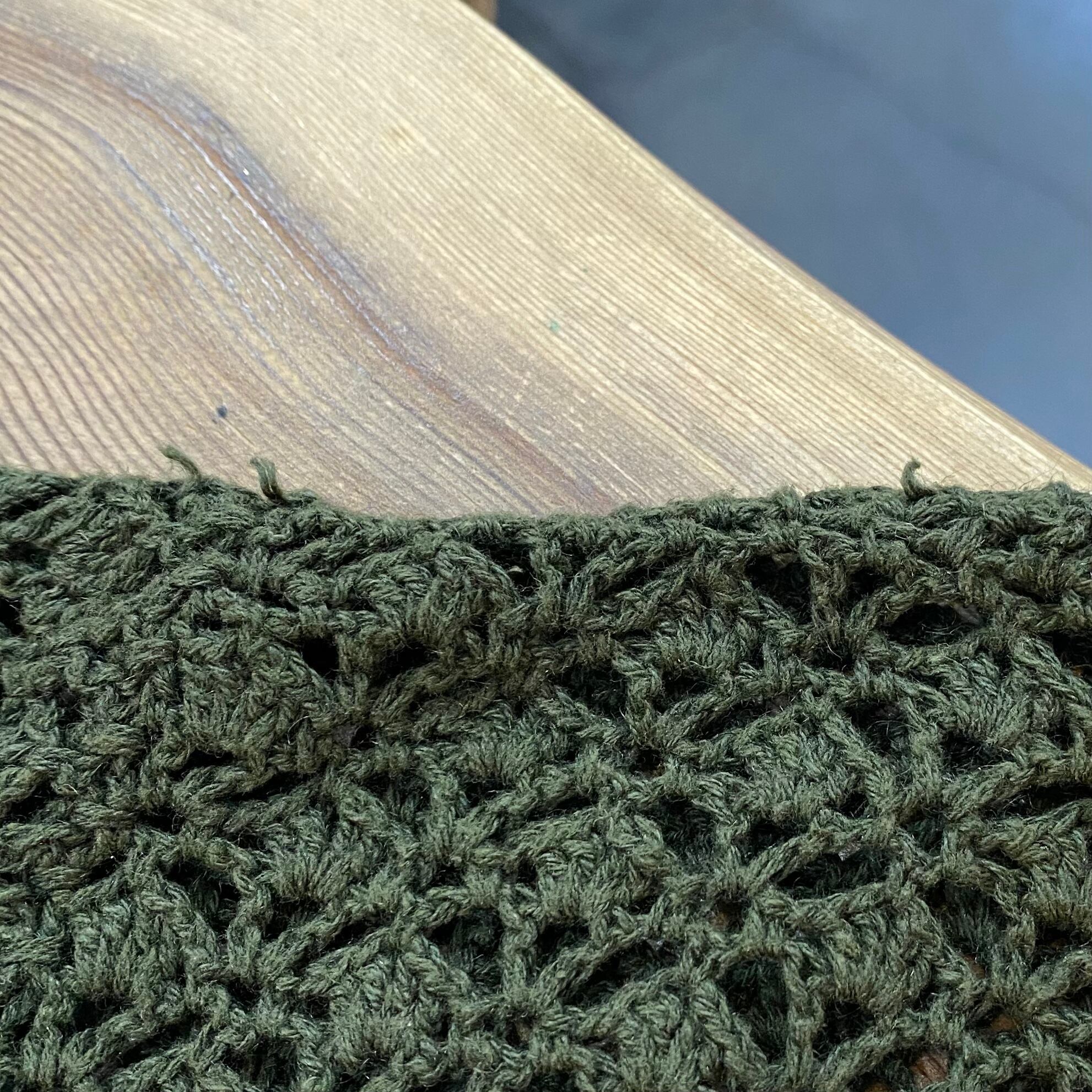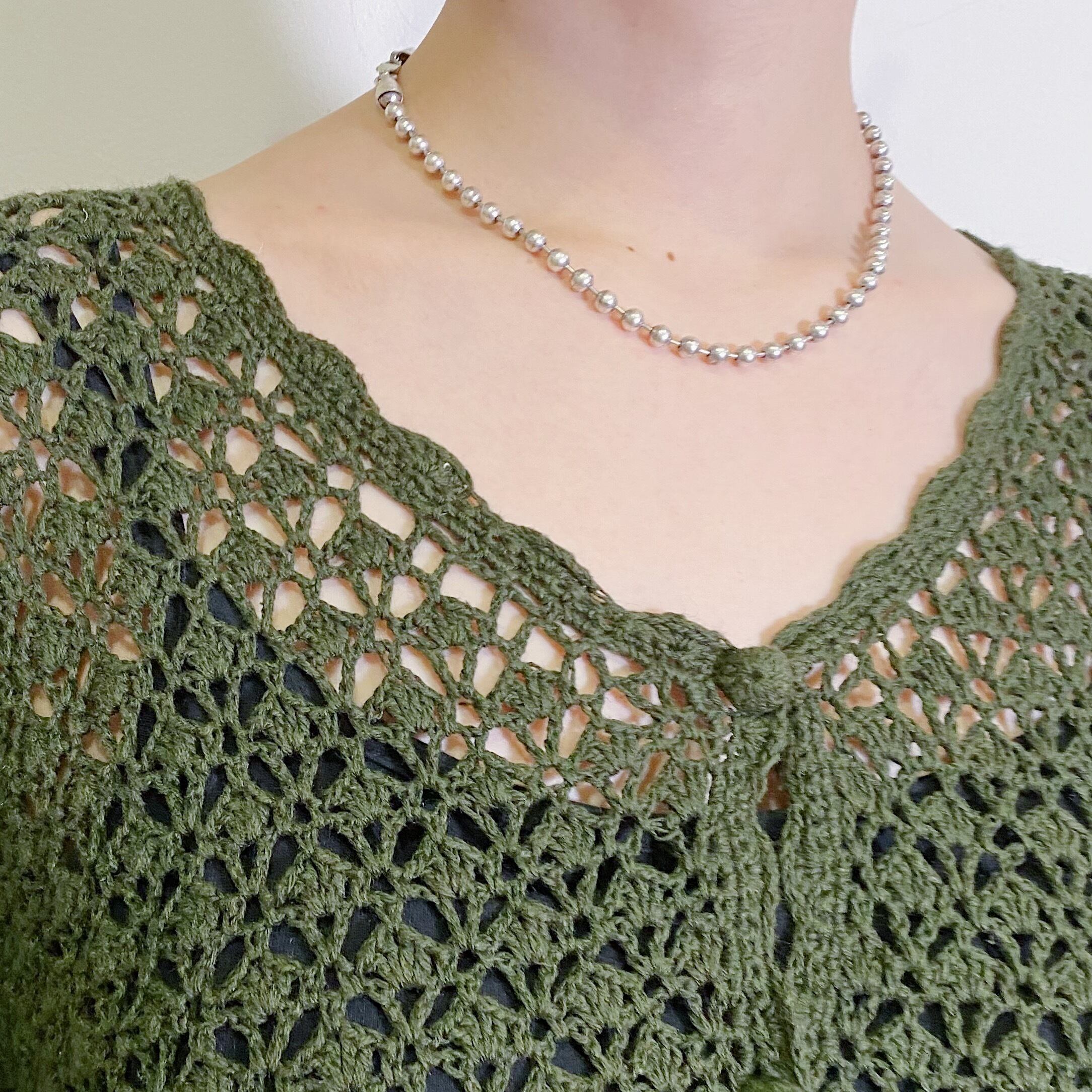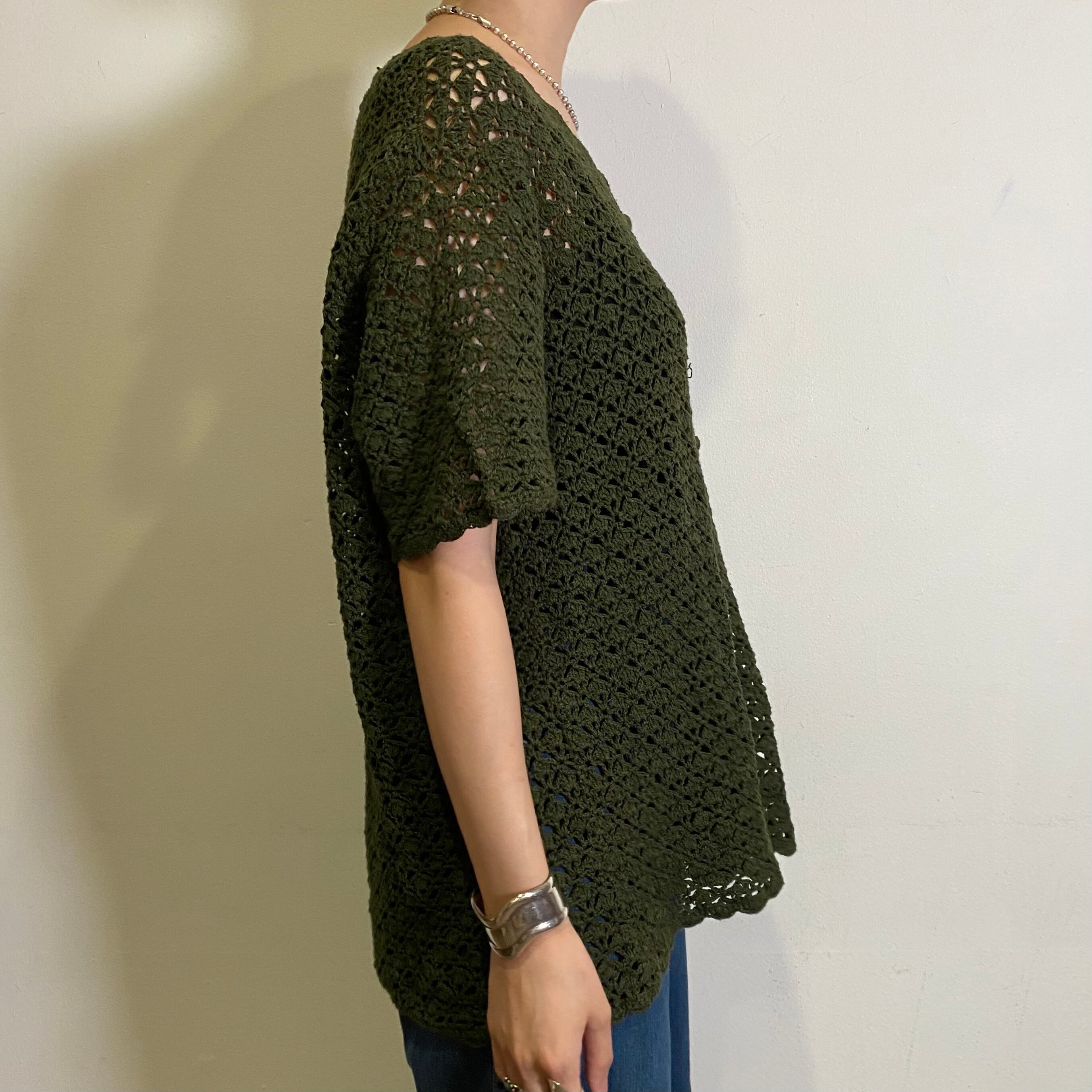 カーキ色で大変使い勝手の良さそうなクロシェニットカーディガンです。
