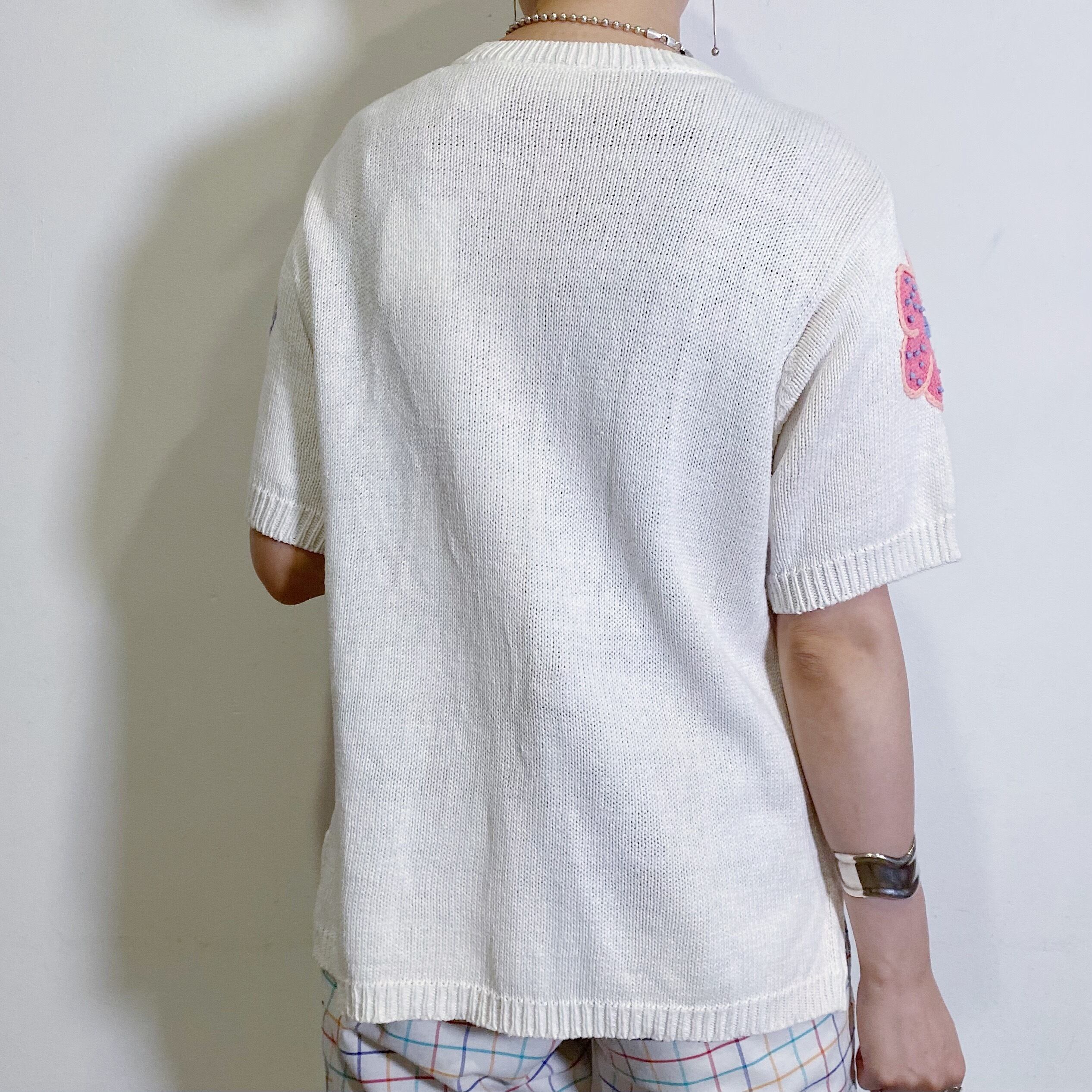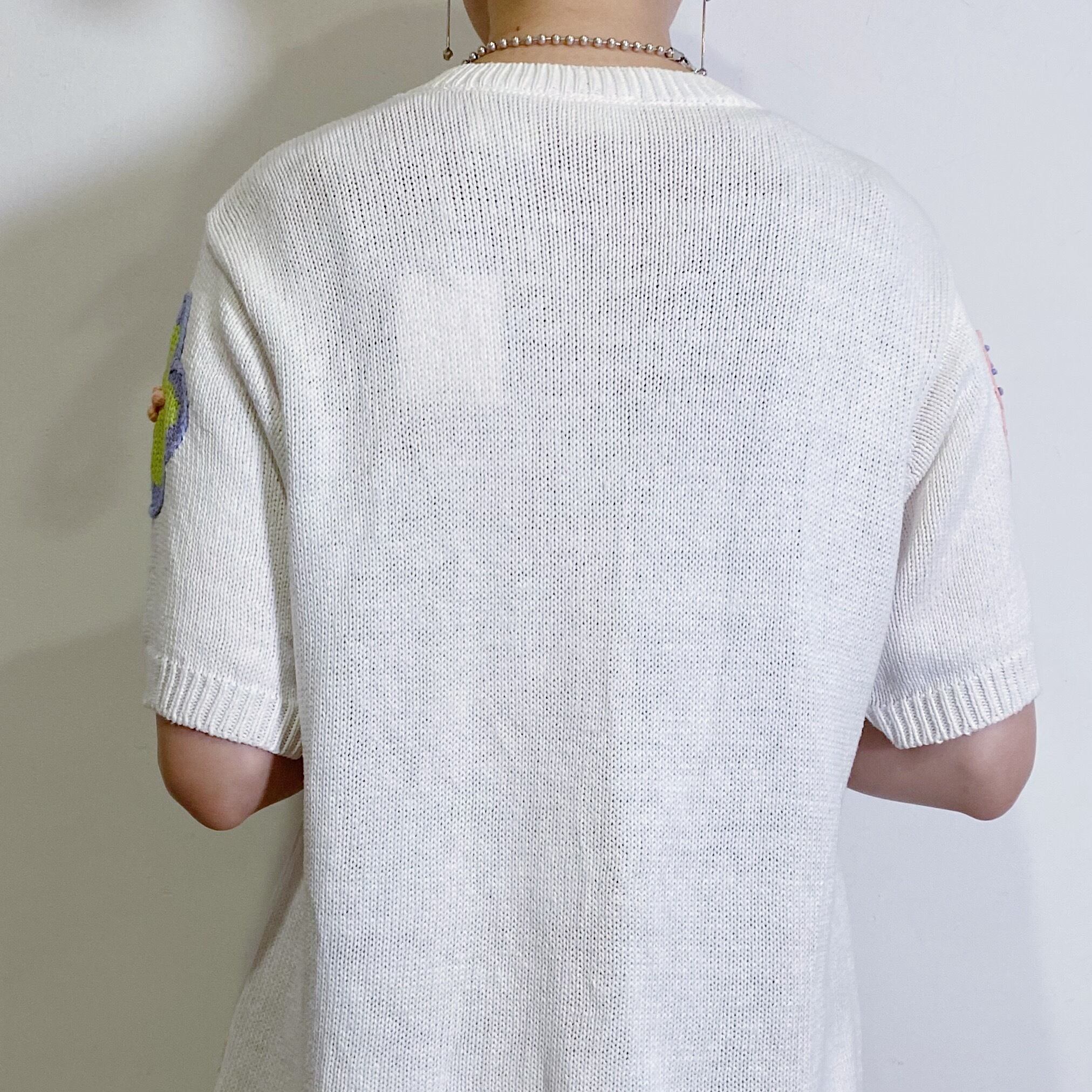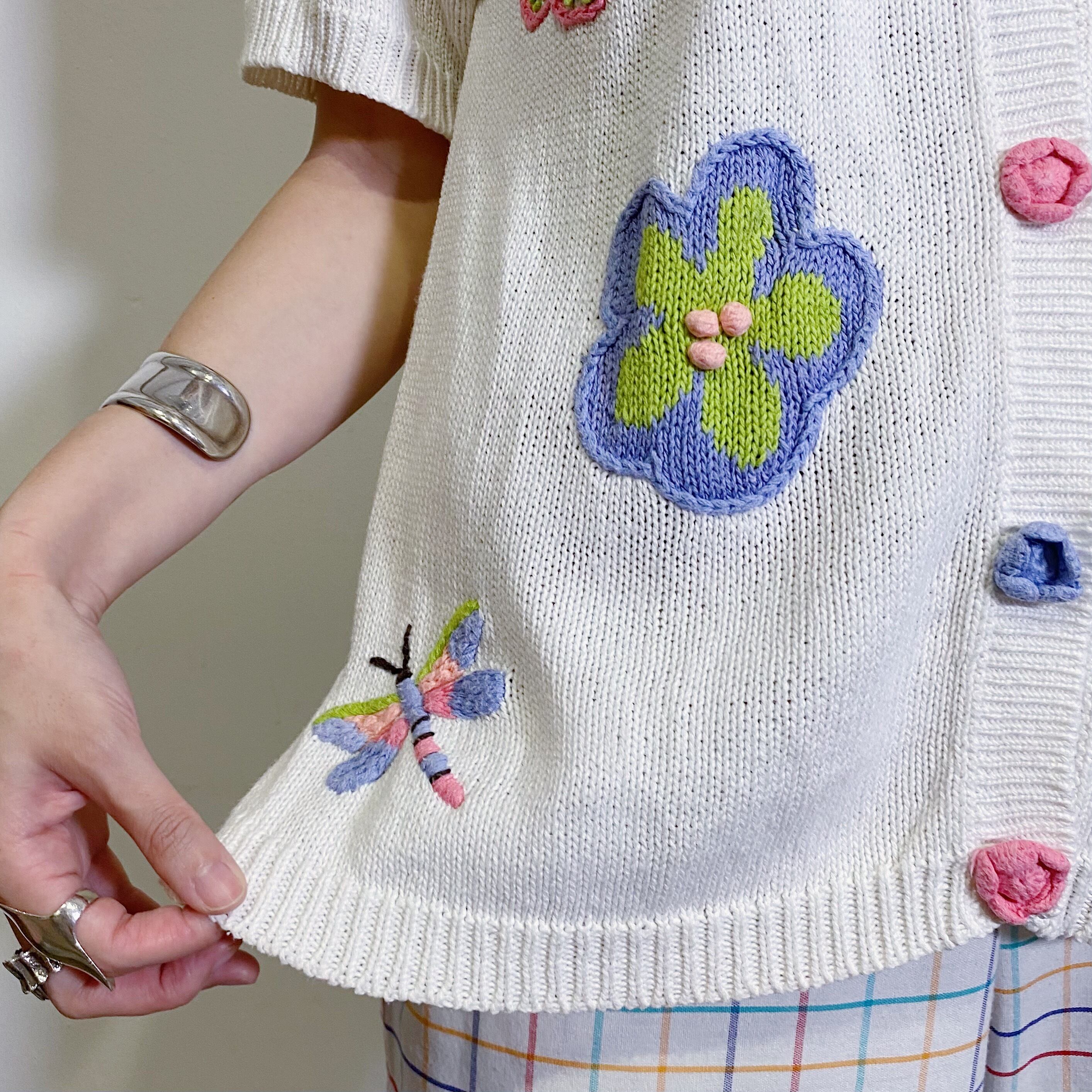ポップなお花やトンボの手刺繍がなんとも可愛い、サマーニットカーディガンです。