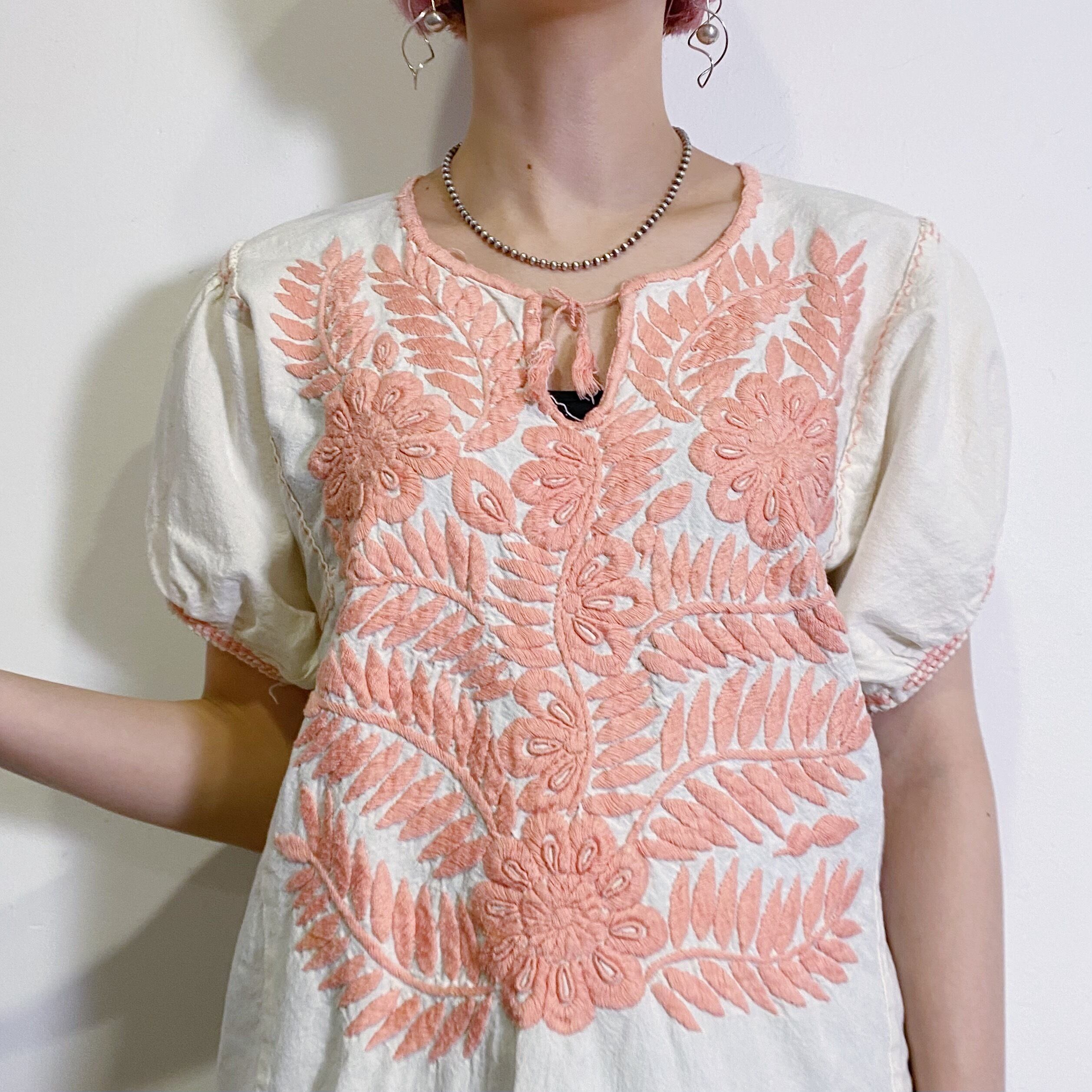 サーモンピンクの手刺繍が可愛い、メキシコメイドのチュニックです。