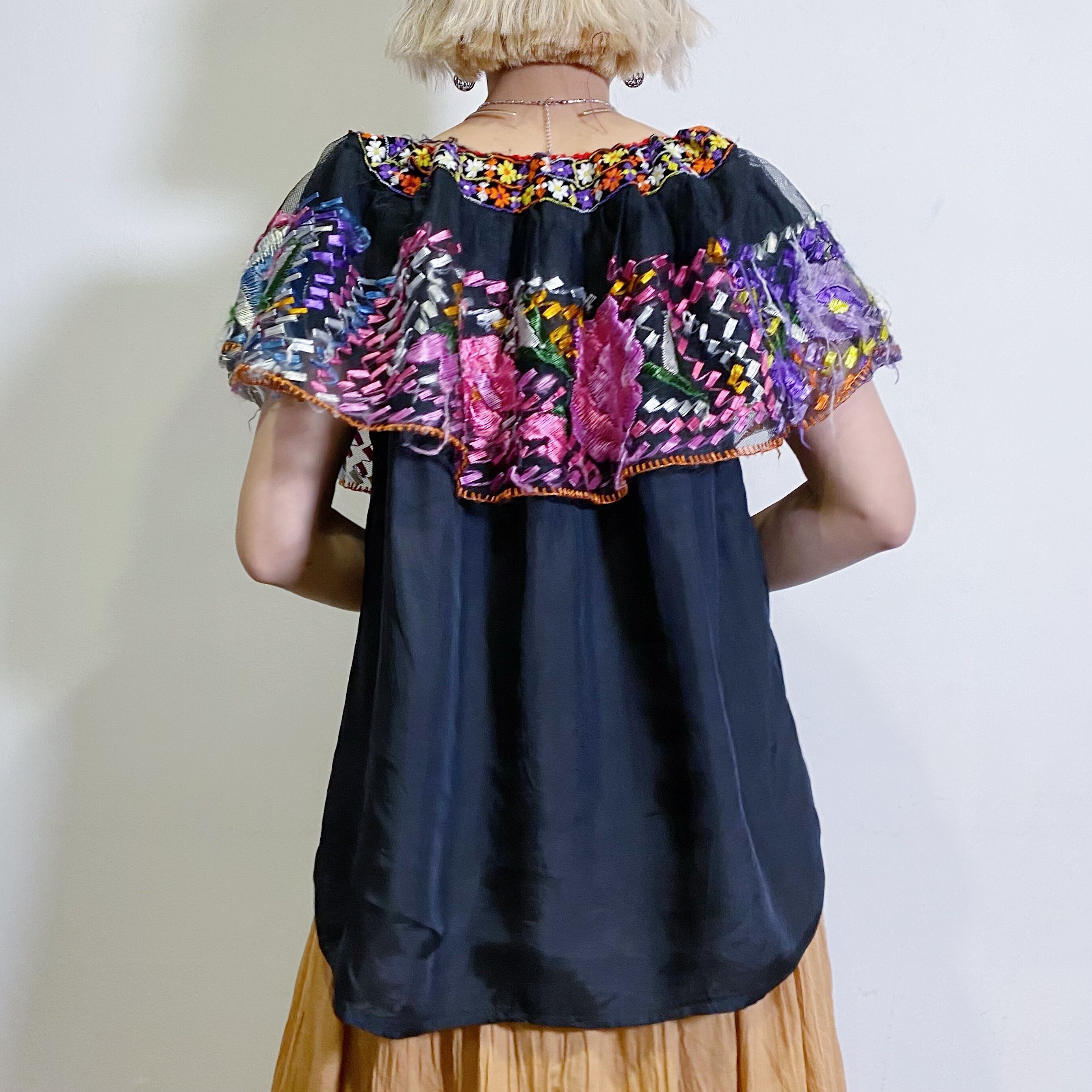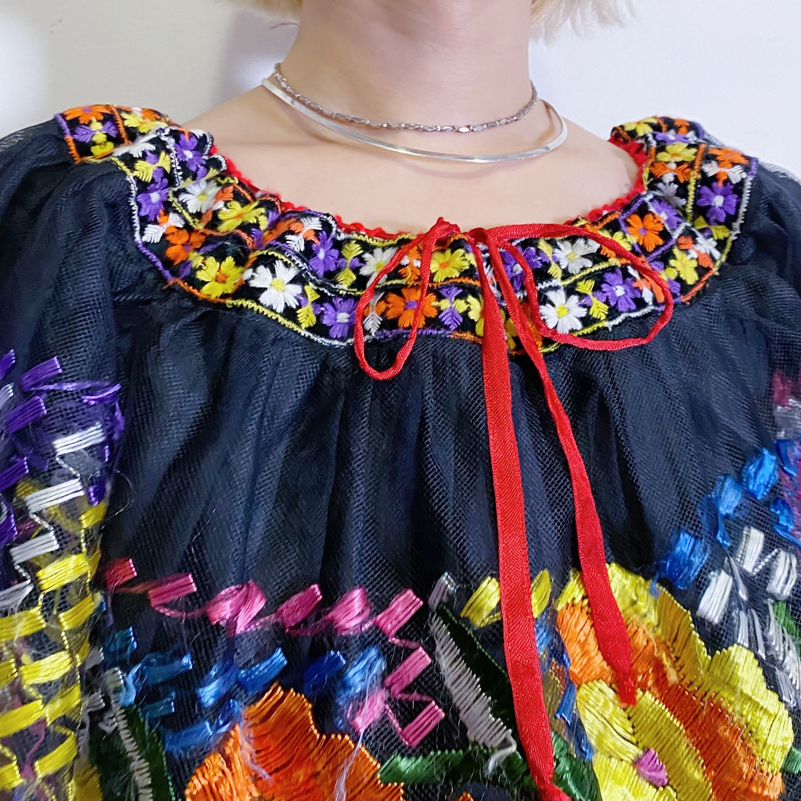 チュール素材でできたラッフルカラーにハンド刺繍でお花が彩られた、メキシコの伝統的なチュニックです。