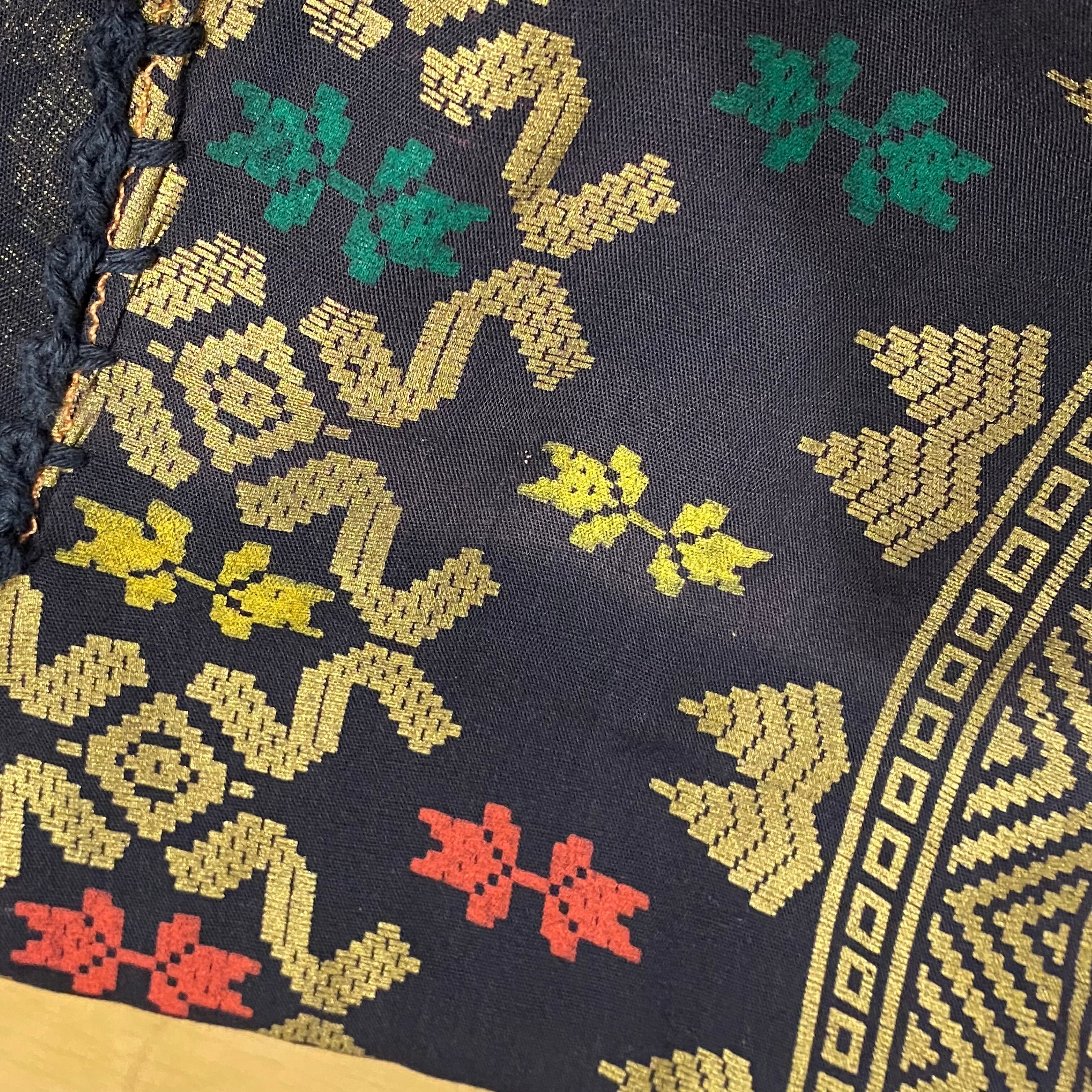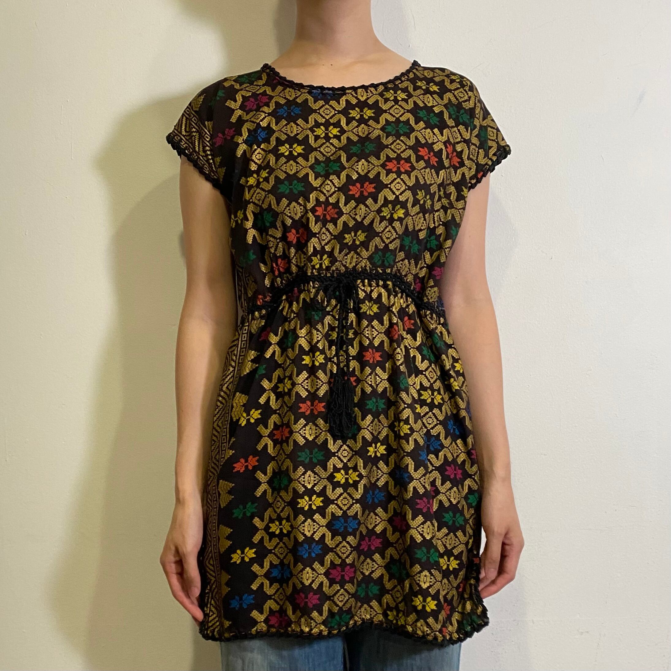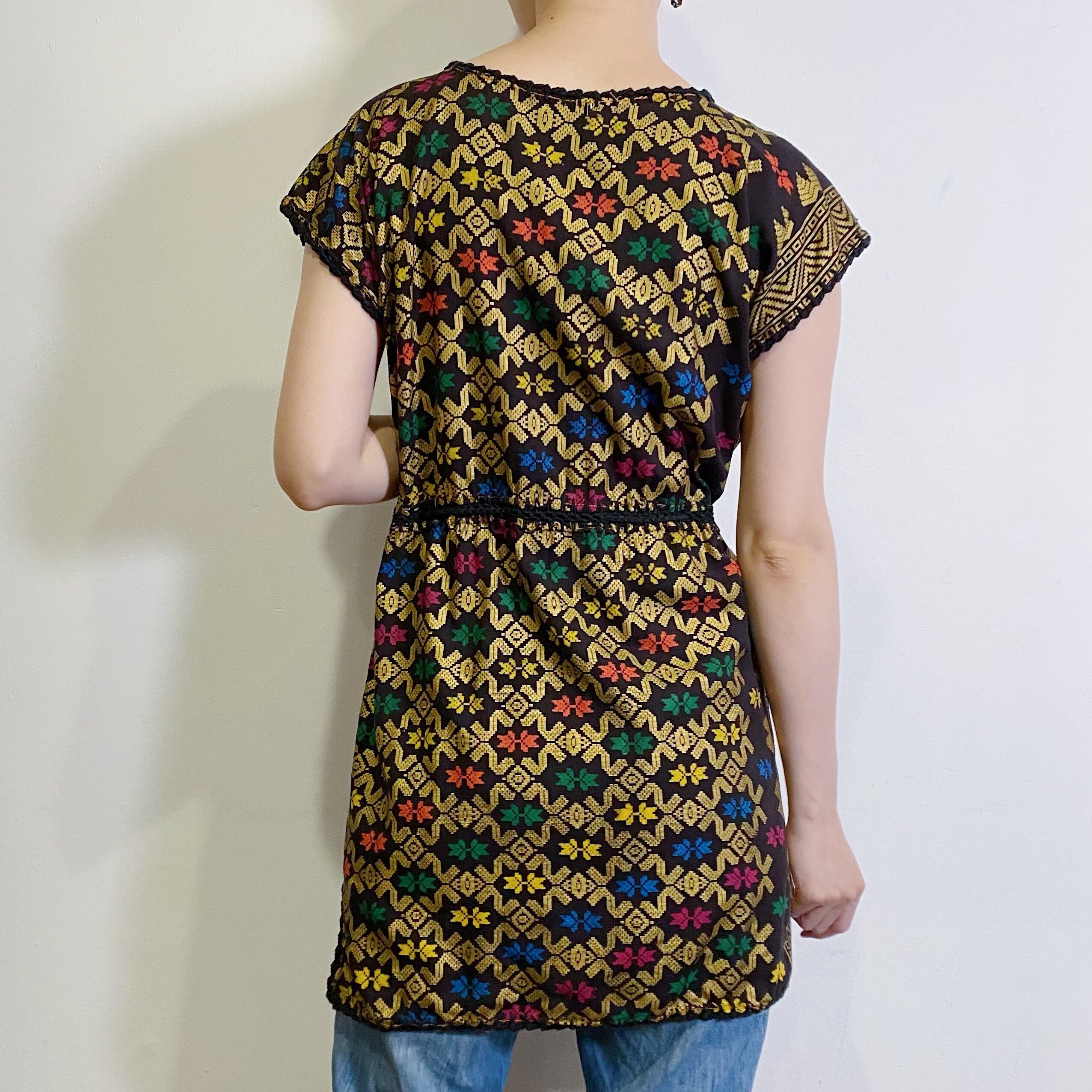 黒地に控えめなゴールドカラーとカラフルで不思議な模様が大人可愛い、70sのトップスです。