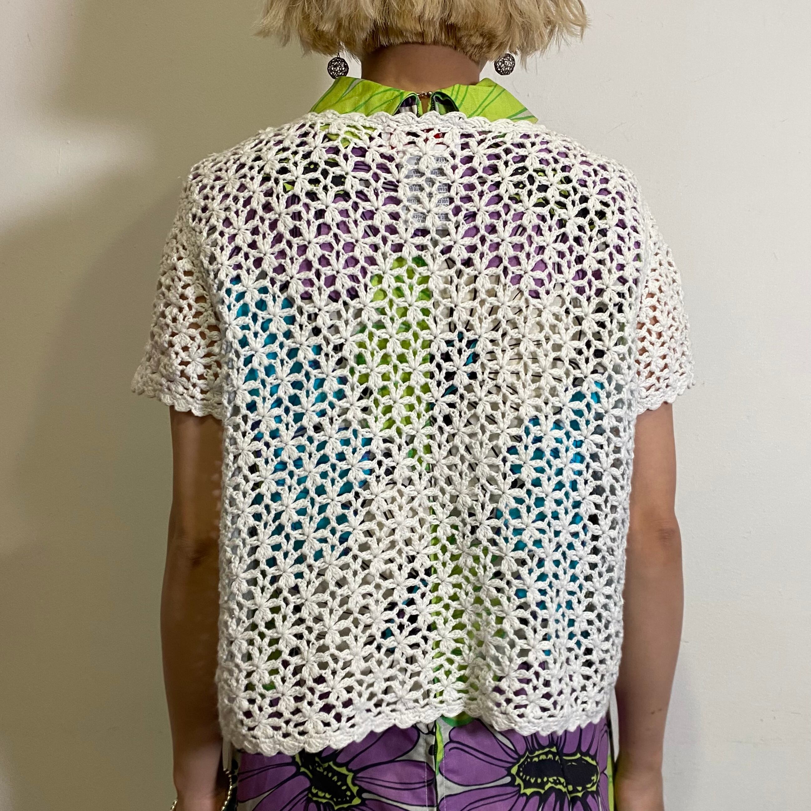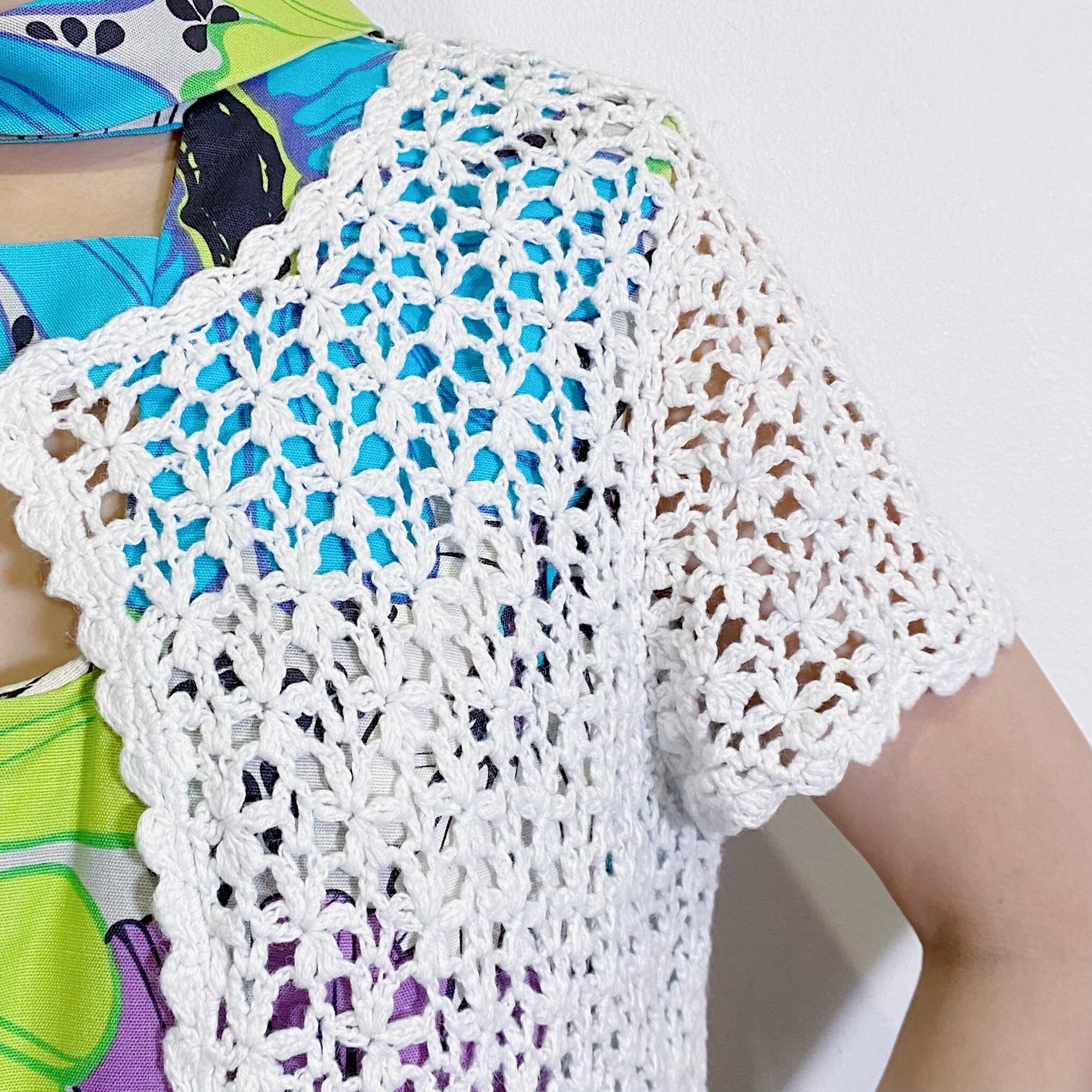 白地にシンプルなつくりで大変使い勝手の良い、クロシェニットカーディガンです。